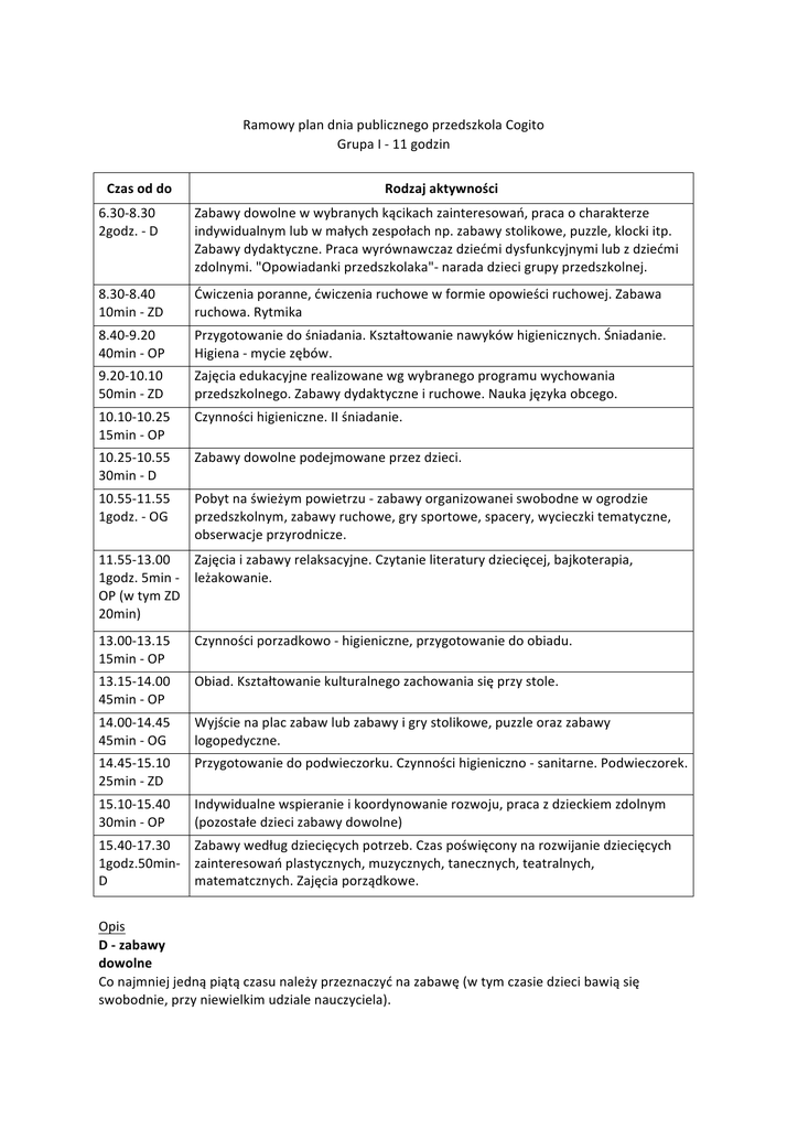 Ramowy plan dnia publicznego przedszkola Cogito Grupa I -‐ 11 godzin Czas od do Rodzaj aktywności 6.30-‐8.30 2godz. -‐ D Zabawy dowolne w wybranych kącikach zainteresowań, praca o charakterze indywidualnym lub w małych zespołach np. zabawy stolikowe, puzzle, klocki itp. Zabawy dydaktyczne. Praca wyrównawczaz dziećmi dysfunkcyjnymi lub z dziećmi zdolnymi. "Opowiadanki przedszkolaka"-‐ narada dzieci grupy przedszkolnej. 8.30-‐8.40 10min -‐ ZD Ćwiczenia poranne, ćwiczenia ruchowe w formie opowieści ruchowej. Zabawa ruchowa. Rytmika 8.40-‐9.20 40min -‐ OP Przygotowanie do śniadania. Kształtowanie nawyków higienicznych. Śniadanie. Higiena -‐ mycie zębów. 9.20-‐10.10 50min -‐ ZD Zajęcia edukacyjne realizowane wg wybranego programu wychowania przedszkolnego. Zabawy dydaktyczne i ruchowe. Nauka języka obcego. 10.10-‐10.25 15min -‐ OP Czynności higieniczne. II śniadanie. 10.25-‐10.55 30min -‐ D Zabawy dowolne podejmowane przez dzieci. 10.55-‐11.55 1godz. -‐ OG Pobyt na świeżym powietrzu -‐ zabawy organizowanei swobodne w ogrodzie przedszkolnym, zabawy ruchowe, gry sportowe, spacery, wycieczki tematyczne, obserwacje przyrodnicze. 11.55-‐13.00 Zajęcia i zabawy relaksacyjne. Czytanie literatury dziecięcej, bajkoterapia, 1godz. 5min -‐ leżakowanie. OP (w tym ZD 20min) 13.00-‐13.15 15min -‐ OP Czynności porzadkowo -‐ higieniczne, przygotowanie do obiadu. 13.15-‐14.00 45min -‐ OP Obiad. Kształtowanie kulturalnego zachowania się przy stole. 14.00-‐14.45 45min -‐ OG Wyjście na plac zabaw lub zabawy i gry stolikowe, puzzle oraz zabawy logopedyczne. 14.45-‐15.10 25min -‐ ZD Przygotowanie do podwieczorku. Czynności higieniczno -‐ sanitarne. Podwieczorek. 15.10-‐15.40 30min -‐ OP Indywidualne wspieranie i koordynowanie rozwoju, praca z dzieckiem zdolnym (pozostałe dzieci zabawy dowolne) 15.40-‐17.30 Zabawy według dziecięcych potrzeb. Czas poświęcony na rozwijanie dziecięcych 1godz.50min-‐ zainteresowań plastycznych, muzycznych, tanecznych, teatralnych, D matematcznych. Zajęcia porządkowe. Opis D -‐ zabawy dowolne Co najmniej jedną piątą czasu należy przeznaczyć na zabawę (w tym czasie dzieci bawią się swobodnie, przy niewielkim udziale nauczyciela). OG -‐ ogród, spacery i wycieczki Co najmniej jedną piątą czasu (w przypadku młodszych dzieci -‐ jedną czwartą czasu) dzieci spędzają w ogrodzie przedszkolnym, na boisku, w parku itp. (organizowane są tam gry i zabawy ruchowe, zajęcia sportowe, obserwacje przyrodnicze, prace gospodarcze, porządkowe i ogrodnicze itd.). ZD -‐ zajęcia dydaktyczne Najwyżej jedną piątą czasu zajmują różnego typu zajęcia dydaktyczne, realizowane według programu wychowania przedszkolnego. OP -‐ zajęcia opiekuńcze Pozostały czas -‐ dwie piąte czasu nauczyciel może dowolnie zagospodarować (w tej puli czasu mieszczą się w szczególności czynności opiekuńcze, samoobsługowe, organizacyjne).