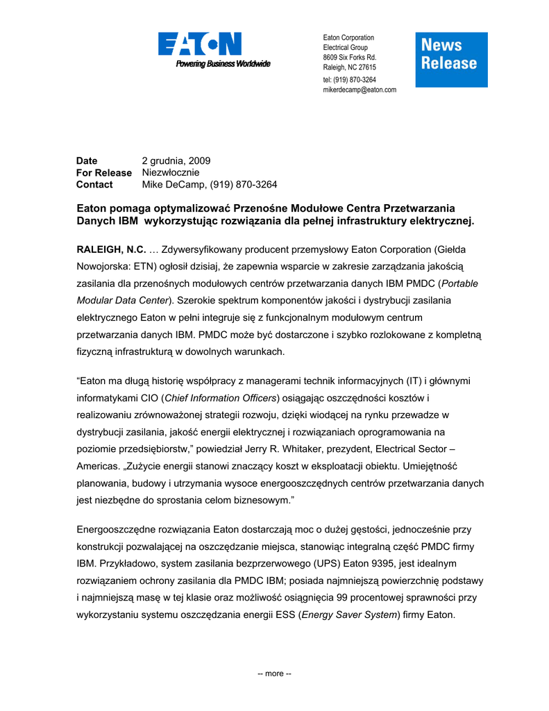 Eaton Corporation Electrical Group 8609 Six Forks Rd. Raleigh, NC 27615 tel: (919) 870-3264 [email protected] Date For Release Contact 2 grudnia, 2009 Niezwłocznie Mike DeCamp, (919) 870-3264 Eaton pomaga optymalizować Przenośne Modułowe Centra Przetwarzania Danych IBM wykorzystując rozwiązania dla pełnej infrastruktury elektrycznej. RALEIGH, N.C. … Zdywersyfikowany producent przemysłowy Eaton Corporation (Giełda Nowojorska: ETN) ogłosił dzisiaj, że zapewnia wsparcie w zakresie zarządzania jakością zasilania dla przenośnych modułowych centrów przetwarzania danych IBM PMDC (Portable Modular Data Center). Szerokie spektrum komponentów jakości i dystrybucji zasilania elektrycznego Eaton w pełni integruje się z funkcjonalnym modułowym centrum przetwarzania danych IBM. PMDC może być dostarczone i szybko rozlokowane z kompletną fizyczną infrastrukturą w dowolnych warunkach. “Eaton ma długą historię współpracy z managerami technik informacyjnych (IT) i głównymi informatykami CIO (Chief Information Officers) osiągając oszczędności kosztów i realizowaniu zrównoważonej strategii rozwoju, dzięki wiodącej na rynku przewadze w dystrybucji zasilania, jakość energii elektrycznej i rozwiązaniach oprogramowania na poziomie przedsiębiorstw,” powiedział Jerry R. Whitaker, prezydent, Electrical Sector – Americas. „Zużycie energii stanowi znaczący koszt w eksploatacji obiektu. Umiejętność planowania, budowy i utrzymania wysoce energooszczędnych centrów przetwarzania danych jest niezbędne do sprostania celom biznesowym.” Energooszczędne rozwiązania Eaton dostarczają moc o dużej gęstości, jednocześnie przy konstrukcji pozwalającej na oszczędzanie miejsca, stanowiąc integralną część PMDC firmy IBM. Przykładowo, system zasilania bezprzerwowego (UPS) Eaton 9395, jest idealnym rozwiązaniem ochrony zasilania dla PMDC IBM; posiada najmniejszą powierzchnię podstawy i najmniejszą masę w tej klasie oraz możliwość osiągnięcia 99 procentowej sprawności przy wykorzystaniu systemu oszczędzania energii ESS (Energy Saver System) firmy Eaton. -- more -- Eaton/Page 2 “PMDC firmy IBM jest częścią naszej strategii dostarczania niedrogiej i elastycznej rodziny rozwiązań modułowych centrów przetwarzania danych dla biznesów borykających się ze znacznymi kosztami inwestycyjnymi i eksploatacyjnymi,” powiedział Steve Sams, wice prezydent IBM, Globalne Przedsięwzięcia i Usługi Serwisowe. ”Eaton pracował z IBM od czasu wprowadzenia na rynek projektu Big Green i kontynuuje rozwijanie nowatorskich produktów, które znacznie redukują zużycie energii, jednocześnie wciąż realizując najwyższe standardy jakości zasilania elektrycznego.” IBM i Eaton mają już doświadczenie współdziałając nad rozwiązaniami PMDC IBM, takimi jak kontenery PMDC zainstalowane przy ośrodku przetwarzania danych IBM w Europie, która zawiera UPS Eaton 550 kVA, w konfiguracji N+ 1, z czasem podtrzymania bateryjnego 20 minut oraz związanym z nim układem urządzeń przełączających. Instalacja również zawiera generator prądotwórczy z silnikiem Diesla o mocy jednego megawata, jako część infrastruktury elektrycznej. W 2007 roku, IBM wprowadziła na rynek projekt Big Green i zainwestowała 1 miliard $ na rok, aby dostarczyć technologie, które pomagają klientom dramatycznie zwiększać poziom sprawności energetycznej w ich ośrodkach danych. IBM wprowadziła PMDC jako część drugiego etapu projektu Big Green aby rozwinąć rozwiązania projektowe modułowych ośrodków przetwarzania danych, aby umożliwić klientom płacenie wraz z ich rozwojem, redukując koszty kapitału początkowego i koszty eksploatacyjne. IBM będzie lansować część z energooszczędnych UPS-ów i elektrycznych rozwiązań Eaton jako część pokazowej jednostki PMDC IBM, podczas 28 Konferencji Gartner Data Center w Las Vegas, Grudzień 1-4. Więcej dodatkowych informacji o IBM, znajduje się na stronie www.ibm.com. Celem uzyskania dodatkowych informacji na temat współpracy Eaton z IBM w zakresie ulepszania infrastruktury technologicznej, należy odwiedzić www.eaton.com/ibm. Aby poznać więcej informacji na temat pełnej serii produktów i usług dotyczących jakości zasilania odwiedź stronę www.eaton.com/powerquality. Sektor Elektryczny Eaton jest globalnym liderem w dystrybucji zasilania, jakości zasilania, sterowania i automatyzacji oraz produktów monitoringu. Globalne linie produktów Eaton zawierające Cutler-Hammer®, Moeller®, Powerware®, Holec®, MEM®, Santak® i MGE Office Protection Systems™ dostarczają nakierowane na klienta rozwiązania łańcucha zasilania ### Eaton/Page 3 PowerChain Management służące do zaspokojenia potrzeb energetycznych dla ośrodków przetwarzania danych, przemysłowych, instytucjonalnych, sektora publicznego, usług komunalnych, handlowych, mieszkalnych i rynków OEM na całym świecie. Eaton Corporation jest zdywersyfikowaną firmą specjalizującą się w zarządzaniu energią ze sprzedażą 15,4 mld $ w 2008. Eaton jest globalnym liderem w technologii komponentów elektrycznych i systemów jakości energii elektrycznej, rozdziału i sterowania; elementów hydraulicznych, systemów i usług dotyczących urządzeń przemysłowych i mobilnych, systemów paliwowych, hydraulicznych i pneumatycznych dla lotnictwa i kosmonautyki cywilnej i militarnej, systemów napędów samochodów osobowych i ciężarowych w zakresie eksploatacji, zużycia paliwa i bezpieczeństwa. Eaton zatrudnia około 70 000 pracowników i sprzedaje produkty dla klientów w ponad 150 krajach. Więcej informacji znajduje się na stronie: www.eaton.com. ###