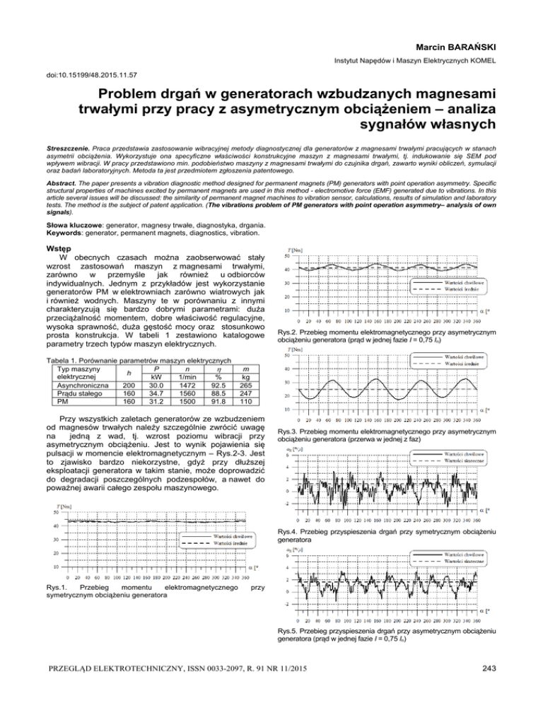 Marcin BARAŃSKI Instytut Napędów i Maszyn Elektrycznych KOMEL doi:10.15199/48.2015.11.57 Problem drgań w generatorach wzbudzanych magnesami trwałymi przy pracy z asymetrycznym obciążeniem – analiza sygnałów własnych Streszczenie. Praca przedstawia zastosowanie wibracyjnej metody diagnostycznej dla generatorów z magnesami trwałymi pracujących w stanach asymetrii obciążenia. Wykorzystuje ona specyficzne właściwości konstrukcyjne maszyn z magnesami trwałymi, tj. indukowanie się SEM pod wpływem wibracji. W pracy przedstawiono min. podobieństwo maszyny z magnesami trwałymi do czujnika drgań, zawarto wyniki obliczeń, symulacji oraz badań laboratoryjnych. Metoda ta jest przedmiotem zgłoszenia patentowego. Abstract. The paper presents a vibration diagnostic method designed for permanent magnets (PM) generators with point operation asymmetry. Specific structural properties of machines excited by permanent magnets are used in this method - electromotive force (EMF) generated due to vibrations. In this article several issues will be discussed: the similarity of permanent magnet machines to vibration sensor, calculations, results of simulation and laboratory tests. The method is the subject of patent application. (The vibrations problem of PM generators with point operation asymmetry– analysis of own signals). Słowa kluczowe: generator, magnesy trwałe, diagnostyka, drgania. Keywords: generator, permanent magnets, diagnostics, vibration. Wstęp W obecnych czasach można zaobserwować stały wzrost zastosowań maszyn z magnesami trwałymi, zarówno w przemyśle jak również u odbiorców indywidualnych. Jednym z przykładów jest wykorzystanie generatorów PM w elektrowniach zarówno wiatrowych jak i również wodnych. Maszyny te w porównaniu z innymi charakteryzują się bardzo dobrymi parametrami: duża przeciążalność momentem, dobre właściwość regulacyjne, wysoka sprawność, duża gęstość mocy oraz stosunkowo prosta konstrukcja. W tabeli 1 zestawiono katalogowe parametry trzech typów maszyn elektrycznych. Tabela 1. Porównanie parametrów maszyn elektrycznych P n Typ maszyny h elektrycznej kW 1/min % Asynchroniczna 200 30.0 1472 92.5 Prądu stałego 160 34.7 1560 88.5 PM 160 31.2 1500 91.8 Rys.2. Przebieg momentu elektromagnetycznego przy asymetrycznym obciążeniu generatora (prąd w jednej fazie I = 0,75 In) m kg 265 247 110 Przy wszystkich zaletach generatorów ze wzbudzeniem od magnesów trwałych należy szczególnie zwrócić uwagę na jedną z wad, tj. wzrost poziomu wibracji przy asymetrycznym obciążeniu. Jest to wynik pojawienia się pulsacji w momencie elektromagnetycznym – Rys.2-3. Jest to zjawisko bardzo niekorzystne, gdyż przy dłuższej eksploatacji generatora w takim stanie, może doprowadzić do degradacji poszczególnych podzespołów, a nawet do poważnej awarii całego zespołu maszynowego. Rys.3. Przebieg momentu elektromagnetycznego przy asymetrycznym obciążeniu generatora (przerwa w jednej z faz) Rys.4. Przebieg przyspieszenia drgań przy symetrycznym obciążeniu generatora Rys.1. Przebieg momentu elektromagnetycznego symetrycznym obciążeniu generatora przy Rys.5. Przebieg przyspieszenia drgań przy asymetrycznym obciążeniu generatora (prąd w jednej fazie I = 0,75 In) PRZEGLĄD ELEKTROTECHNICZNY, ISSN 0033-2097, R. 91 NR 11/2015 243 (1). To spostrzeżenie nasunęło pomysł aby, w prądnicach wzbudzanych magnesami trwałymi, pracujących w trudnodostępnych warunkach, gdzie pomiar drgań jest utrudniony, oceniać drgania w oparciu o analizę harmoniczną prądu lub napięcia. Wykorzystuje się do tego celu specyficzne właściwości maszyn z magnesami trwałymi, a więc indukowanie się SEM w uzwojeniu pod wpływem drgań. Rys.6. Przebieg przyspieszenia drgań przy asymetrycznym obciążeniu generatora (przerwa w jednej z faz) Tabela 2. Wpływ pulsacji momentu elektromagnetycznego na wzrost przyspieszenia drgań generatora SMzsg132M-4 amax Tpp a T Stan obciążenia generatora 2 2 Nm Nm m/s m/s Obciążenie symetryczne I = In 43,0 1,2 1,3 3,2 Prąd w jednej z faz I = 0,75 In 41,3 5,0 1,6 3,4 Prąd w jednej z faz I = 0 24,9 15,0 2,2 5,0 Na rysunkach od 1 do 6 oraz w tabeli 2 można zaobserwować wpływ asymetrii obciążenia generatora PM na poziom wibracji i przebieg momentu elektromagnetycznego. Wraz ze wzrostem asymetrii powiększają się pulsacje momentu oraz wzrasta poziom drgań. Istota metody Powszechnie stosowaną metodą pomiaru drgań w maszynach elektrycznych jest bezpośredni pomiar przyspieszenia bądź prędkości drgań czujnikami mechaniczno – elektrycznymi. Na przykład czujnikiem z piezoelektrycznym elementem pomiarowym mierzy się przyspieszenie drgań, a czujnikiem magneto – elektrycznym (magnes trwały i cewka indukcyjna) mierzy się prędkość drgań. Pomiar drgań polega na przyłożeniu czujnika do punktu pomiarowego, np. do tarczy łożyskowej maszyny elektrycznej. Drgania mierzy się zwykle w trzech kierunkach: x – poziomym, poprzecznym do osi wału, y – pionowym, z – wzdłużnym. Diagnostyka drganiowa bazuje głównie na pomiarach przy użyciu dedykowanej do tego celu skomplikowanej i kosztownej aparatury [2]-[5]. Przy drganiach przekraczających wartości dopuszczalne według norm i instrukcji eksploatacji zarejestrowany sygnał drganiowy rozkłada się na harmoniczne w celu zidentyfikowania przyczyny powstałych drgań. Mierząc drgania trzeba zwracać uwagę na poprawne zamontowanie czujnika do maszyny, co często stwarza problemy, gdyż maszyna fabrycznie jest rzadko do tego celu przystosowana. Sposób montażu czujnika pomiarowego wpływa na zakres przenoszonego pasma częstotliwości sygnału pomiarowego. Dodatkowo należy zwracać szczególną uwagę na separację obwodu pomiarowego od wszelkiego rodzaju zakłóceń, które mogą spowodować nieprawidłowe wskazania aparatury pomiarowej. W elektrowniach wiatrowych w których prądnice wzbudzane magnesami trwałymi są zabudo