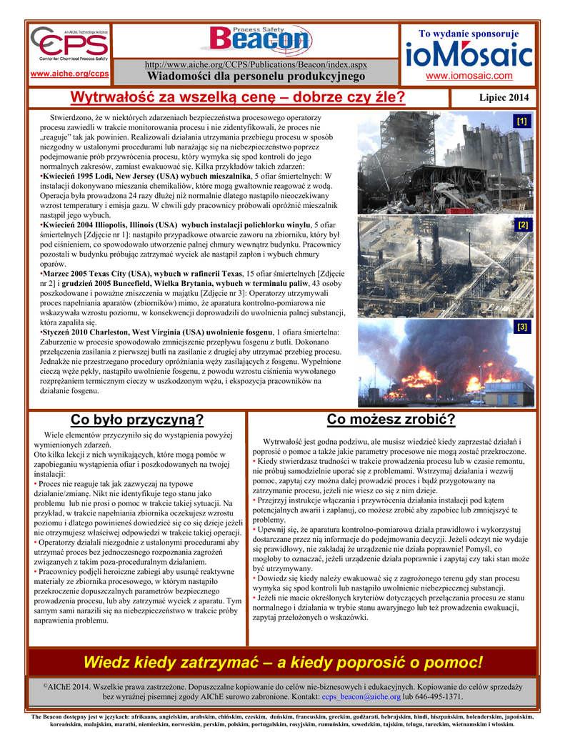To wydanie sponsoruje www.aiche.org/ccps http://www.aiche.org/CCPS/Publications/Beacon/index.aspx Wiadomości dla personelu produkcyjnego www.iomosaic.com Wytrwałość za wszelką cenę – dobrze czy źle? Lipiec 2014 Stwierdzono, że w niektórych zdarzeniach bezpieczeństwa procesowego operatorzy procesu zawiedli w trakcie monitorowania procesu i nie zidentyfikowali, że proces nie „reaguje” tak jak powinien. Realizowali działania utrzymania przebiegu procesu w sposób niezgodny w ustalonymi procedurami lub narażając się na niebezpieczeństwo poprzez podejmowanie prób przywrócenia procesu, który wymyka się spod kontroli do jego normalnych zakresów, zamiast ewakuować się. Kilka przykładów takich zdarzeń: •Kwiecień 1995 Lodi, New Jersey (USA) wybuch mieszalnika, 5 ofiar śmiertelnych: W instalacji dokonywano mieszania chemikaliów, które mogą gwałtownie reagować z wodą. Operacja była prowadzona 24 razy dłużej niż normalnie dlatego nastąpiło nieoczekiwany wzrost temperatury i emisja gazu. W chwili gdy pracownicy próbowali opróżnić mieszalnik nastąpił jego wybuch. •Kwiecień 2004 Illiopolis, Illinois (USA) wybuch instalacji polichlorku winylu, 5 ofiar śmiertelnych [Zdjęcie nr 1]: nastąpiło przypadkowe otwarcie zaworu na zbiorniku, który był pod ciśnieniem, co spowodowało utworzenie palnej chmury wewnątrz budynku. Pracownicy pozostali w budynku próbując zatrzymać wyciek ale nastąpił zapłon i wybuch chmury oparów. •Marzec 2005 Texas City (USA), wybuch w rafinerii Texas, 15 ofiar śmiertelnych [Zdjęcie nr 2] i grudzień 2005 Buncefield, Wielka Brytania, wybuch w terminalu paliw, 43 osoby poszkodowane i poważne zniszczenia w majątku [Zdjęcie nr 3]: Operatorzy utrzymywali proces napełniania aparatów (zbiorników) mimo, że aparatura kontrolno-pomiarowa nie wskazywała wzrostu poziomu, w konsekwencji doprowadzili do uwolnienia palnej substancji, która zapaliła się. •Styczeń 2010 Charleston, West Virginia (USA) uwolnienie fosgenu, 1 ofiara śmiertelna: Zaburzenie w procesie spowodowało zmniejszenie przepływu fosgenu z butli. Dokonano przełączenia zasilania z pierwszej butli na zasilanie z drugiej aby utrzymać przebieg procesu. Jednakże nie przestrzegano procedury opróżniania węży zasilających z fosgenu. Wypełnione cieczą węże pękły, nastąpiło uwolnienie fosgenu, z powodu wzrostu ciśnienia wywołanego rozprężaniem termicznym cieczy w uszkodzonym wężu, i ekspozycja pracowników na działanie fosgenu. [1] [2] [3] Co było przyczyną? Co możesz zrobić? Wiele elementów przyczyniło się do wystąpienia powyżej wymienionych zdarzeń. Oto kilka lekcji z nich wynikających, które mogą pomóc w zapobieganiu wystąpienia ofiar i poszkodowanych na twojej instalacji: • Proces nie reaguje tak jak zazwyczaj na typowe działanie/zmianę. Nikt nie identyfikuje tego stanu jako problemu lub nie prosi o pomoc w trakcie takiej sytuacji. Na przykład, w trakcie napełniania zbiornika oczekujesz wzrostu poziomu i dlatego powinieneś dowiedzieć się co się dzieje jeżeli nie otrzymujesz właściwej odpowiedzi w trakcie takiej operacji. • Operatorzy działali niezgodnie z ustalonymi procedurami aby utrzymać proces bez jednoczesnego rozpoznania zagrożeń związanych z takim poza-proceduralnym działaniem. • Pracownicy podjęli heroiczne zabiegi aby usunąć reaktywne materiały ze zbiornika procesowego, w którym nastąpiło przekroczenie dopuszczalnych parametrów bezpiecznego prowadzenia procesu, lub aby zatrzymać wyciek z aparatu. Tym samym sami narazili się na niebezpieczeństwo w trakcie próby naprawienia problemu. Wytrwałość jest godna podziwu, ale musisz wiedzieć kiedy zaprzestać działań i poprosić o pomoc a także jakie parametry procesowe nie mogą zostać przekroczone. • Kiedy stwierdzasz trudności w trakcie prowadzenia procesu lub w czasie remontu, nie próbuj samodzielnie uporać się z problemami. Wstrzymaj działania i wezwij pomoc, zapytaj czy można dalej prowadzić proces i bądź przygotowany na zatrzymanie procesu, jeżeli nie wiesz co się z nim dzieje. • Przejrzyj instrukcje włączania i przywrócenia działania instalacji pod kątem potencjalnych awarii i zaplanuj, co możesz zrobić aby zapobiec lub zmniejszyć te problemy. • Upewnij się, że aparatura kontrolno-pomiarowa działa prawidłowo i wykorzystuj dostarczane przez nią informacje do podejmowania decyzji. Jeżeli odczyt nie wydaje się prawidłowy, nie zakładaj że urządzenie nie działa poprawnie! Pomyśl, co mogłoby to oznaczać, jeżeli urządzenie działa poprawnie i zapytaj czy taki stan może być utrzymywany. • Dowiedz się kiedy należy ewakuować się z zagrożonego terenu gdy stan procesu wymyka się spod kontroli lub nastąpiło uwolnienie niebezpiecznej substancji. • Jeżeli nie macie określonych kryteriów dotyczących przełączania procesu ze stanu normalnego i działania w trybie stanu awaryjnego lub też prowadzenia ewakuacji, zapytaj przełożonych o wskazówki. Wiedz kiedy zatrzymać – a kiedy poprosić o pomoc! ©AIChE 2014. Wszelkie prawa zastrzeżone. Dopuszczalne kopiowanie do celów nie-biznesowych i edukacyjnych. Kopiowanie do celów sprzedaży bez wyraźnej pisemnej zgody AIChE surowo zabronione. Kontakt: [email protected] lub 646-495-1371. The Beacon dostępny jest w językach: afrikaans, angielskim, arabskim, chińskim, czeskim, duńskim, francuskim, greckim, gudżarati, hebrajskim, hindi, hiszpańskim, holenderskim, japońskim, koreańskim, malajskim, marathi, niemieckim, norweskim, perskim, polskim, portugalskim, rosyjskim, rumuńskim, szwedzkim, tajskim, telugu, tureckim, wietnamskim i włoskim.