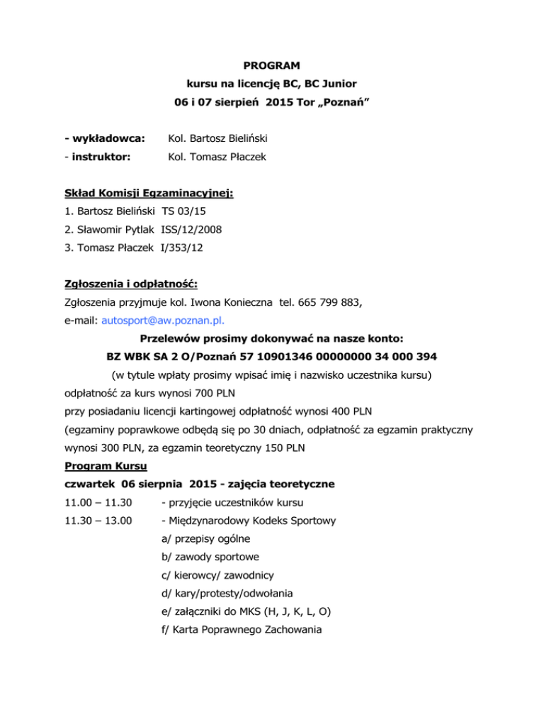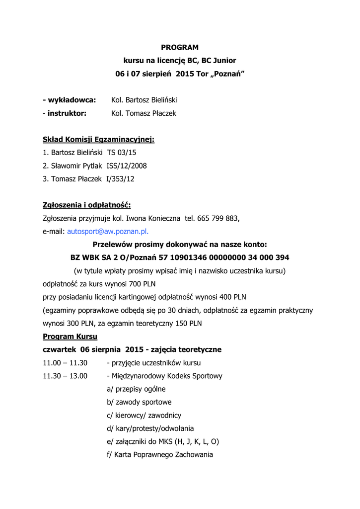 PROGRAM kursu na licencję BC, BC Junior 06 i 07 sierpień 2015 Tor „Poznań” - wykładowca: Kol. Bartosz Bieliński - instruktor: Kol. Tomasz Płaczek Skład Komisji Egzaminacyjnej: 1. Bartosz Bieliński TS 03/15 2. Sławomir Pytlak ISS/12/2008 3. Tomasz Płaczek I/353/12 Zgłoszenia i odpłatność: Zgłoszenia przyjmuje kol. Iwona Konieczna tel. 665 799 883, e-mail: [email protected]. Przelewów prosimy dokonywać na nasze konto: BZ WBK SA 2 O/Poznań 57 10901346 00000000 34 000 394 (w tytule wpłaty prosimy wpisać imię i nazwisko uczestnika kursu) odpłatność za kurs wynosi 700 PLN przy posiadaniu licencji kartingowej odpłatność wynosi 400 PLN (egzaminy poprawkowe odbędą się po 30 dniach, odpłatność za egzamin praktyczny wynosi 300 PLN, za egzamin teoretyczny 150 PLN Program Kursu czwartek 06 sierpnia 2015 - zajęcia teoretyczne 11.00 – 11.30 - przyjęcie uczestników kursu 11.30 – 13.00 - Międzynarodowy Kodeks Sportowy a/ przepisy ogólne b/ zawody sportowe c/ kierowcy/ zawodnicy d/ kary/protesty/odwołania e/ załączniki do MKS (H, J, K, L, O) f/ Karta Poprawnego Zachowania 13.00 - 14.00 - Wyścigi Torowe w Polsce - Struktura PZM-GKSS-ZO PZM-OKSS - Automobilklub - Licencje zawodnicze i badania lekarskie: a/ rodzaje, zasady uzyskiwania b/ uprawnienia do odpowiedniej konkurencji c/ badania lekarskie i psychologiczne d/ zachowanie po kolizji (nieukończony wyścig) 14.00 – 17.00 - Wyścigi samochodowe w Polsce /WSMP, WPP i Endurance oraz GSMP a/ regulamin zawodów, przebieg zawodów b/ regulamin ramowy i szczegółowy (+BK) c/ bezpieczeństwo i zasady zachowania się na torze d/flagi, sygnalizacja i polecenia wydawane przez sędziów e/ samochód zabezpieczenia SAFETY CAR i służby ratownicze f/ wyścigi w ramach strefy ,tory g/ Puchary (VW, Porsche, KIA … 17.15 – 20.30 - Jazda z instruktorem i bez - Pola przedstartowe , ustawienia na polach - Pola startowe , ustawienia w poszczególnych konkurencjach - Starty i falstarty /różnice w poszczególnych konkurencjach - Reagowanie na sygnały dawane flagami i tablicami - Obowiązki kierowcy na torze (+jazda poza torem) - Zachowanie się kierowcy w sytuacjach ekstremalnych - Jazdy po torze z instruktorem i bez (w tym nieobowiązkowa). - Jazda samochodem z trolejami jako doskonały element wyczucia i opanowania samochodu w uślizgu bocznym…) Piątek 07 sierpnia 2015 - Zajęcia teoretyczne i egzamin 8.00 – 9.30 - Omówienie Regulaminu Rallycrossu (Junior Baggy, Folkrace) a/ regulamin zawodów i przebieg zawodów b/ regulamin ramowy, szczegółowy i techniczny (+BK) c/ zasady zachowania na torze, obowiązki kierowcy d/ flagi, sygnalizacja, sędziowie e/ biegi kwalifikacyjne i finałowe (ustawienia, prawo wyboru pola) 09.45 - egzamin praktyczny i teoretyczny Informacje dodatkowe. Na kurs oraz egzamin przyjeżdżamy własnym samochodem z manualną skrzynią biegów (nie musi być sportowy) wraz z obowiązkowym wyposażeniem bezpieczeństwa i kaskiem ochronnym. Informujemy, iż na terenie Toru „Poznań” znajduje się baza hotelowa. Dysponujemy pokojami: 2-os. w cenie 123 PLN i 3-os. w cenie 200 PLN. Rezerwacji noclegów dokonać można pod nr tel. 61 814 35 11 w godz. od 7.00 do 15.00 lub mailowo: [email protected]. Z poważaniem Kierownik Kursu - Bartosz Bieliński