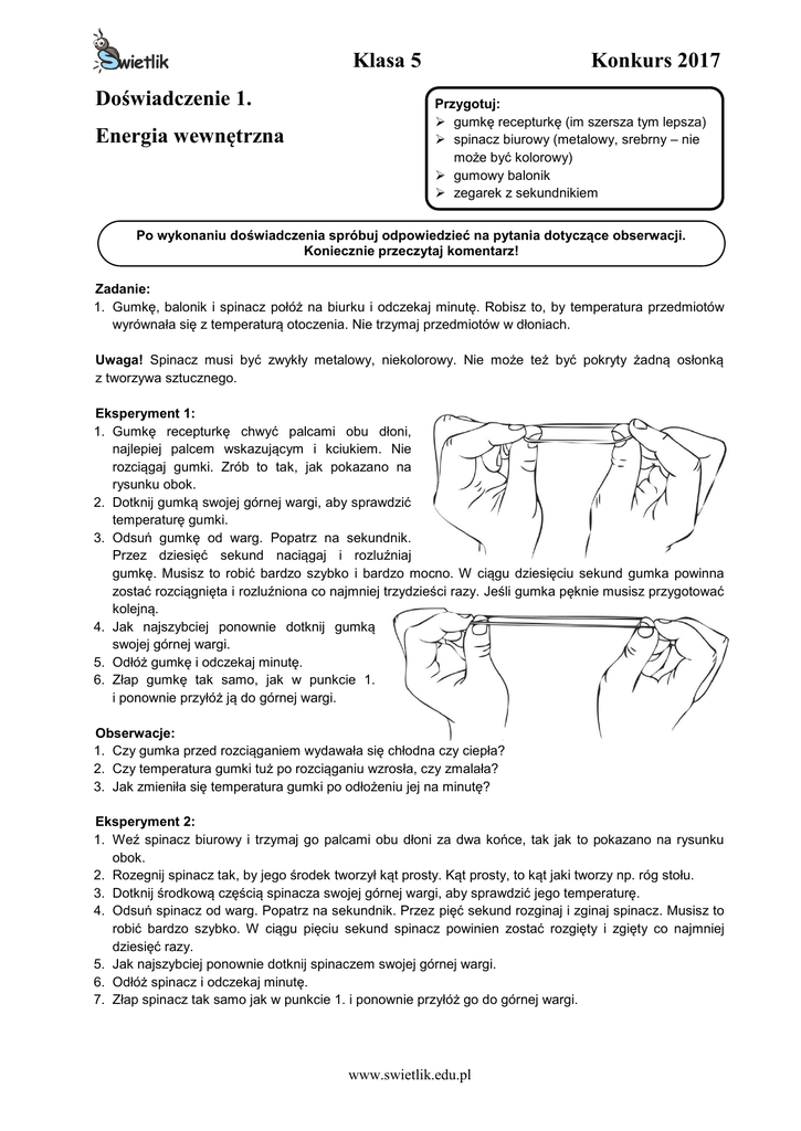 Klasa 5 Doświadczenie 1. Energia wewnętrzna Konkurs 2017 Przygotuj: gumkę recepturkę (im szersza tym lepsza) spinacz biurowy (metalowy, srebrny – nie może być kolorowy) gumowy balonik zegarek z sekundnikiem Po wykonaniu doświadczenia spróbuj odpowiedzieć na pytania dotyczące obserwacji. Koniecznie przeczytaj komentarz! Zadanie: 1. Gumkę, balonik i spinacz połóż na biurku i odczekaj minutę. Robisz to, by temperatura przedmiotów wyrównała się z temperaturą otoczenia. Nie trzymaj przedmiotów w dłoniach. Uwaga! Spinacz musi być zwykły metalowy, niekolorowy. Nie może też być pokryty żadną osłonką z tworzywa sztucznego. Eksperyment 1: 1. Gumkę recepturkę chwyć palcami obu dłoni, najlepiej palcem wskazującym i kciukiem. Nie rozciągaj gumki. Zrób to tak, jak pokazano na rysunku obok. 2. Dotknij gumką swojej górnej wargi, aby sprawdzić temperaturę gumki. 3. Odsuń gumkę od warg. Popatrz na sekundnik. Przez dziesięć sekund naciągaj i rozluźniaj gumkę. Musisz to robić bardzo szybko i bardzo mocno. W ciągu dziesięciu sekund gumka powinna zostać rozciągnięta i rozluźniona co najmniej trzydzieści razy. Jeśli gumka pęknie musisz przygotować kolejną. 4. Jak najszybciej ponownie dotknij gumką swojej górnej wargi. 5. Odłóż gumkę i odczekaj minutę. 6. Złap gumkę tak samo, jak w punkcie 1. i ponownie przyłóż ją do górnej wargi. Obserwacje: 1. Czy gumka przed rozciąganiem wydawała się chłodna czy ciepła? 2. Czy temperatura gumki tuż po rozciąganiu wzrosła, czy zmalała? 3. Jak zmieniła się temperatura gumki po odłożeniu jej na minutę? Eksperyment 2: 1. Weź spinacz biurowy i trzymaj go palcami obu dłoni za dwa końce, tak jak to pokazano na rysunku obok. 2. Rozegnij spinacz tak, by jego środek tworzył kąt prosty. Kąt prosty, to kąt jaki tworzy np. róg stołu. 3. Dotknij środkową częścią spinacza swojej górnej wargi, aby sprawdzić jego temperaturę. 4. Odsuń spinacz od warg. Popatrz na sekundnik. Przez pięć sekund rozginaj i zginaj spinacz. Musisz to robić bardzo szybko. W ciągu pięciu sekund spinacz powinien zostać rozgięty i zgięty co najmniej dziesięć razy. 5. Jak najszybciej ponownie dotknij spinaczem swojej górnej wargi. 6. Odłóż spinacz i odczekaj minutę. 7. Złap spinacz tak samo jak w punkcie 1. i ponownie przyłóż go do górnej wargi. www.swietlik.edu.pl Klasa 5 Konkurs 2017 Obserwacje: 1. Czy spinacz przed zginaniem wydawał się chłodny czy ciepły? 2. Czy temperatura spinacza tuż po rozciąganiu wzrosła, czy zmalała? 3. Jak zmieniła się temperatura spinacza po odłożeniu go na minutę? Eksperyment 3: 1. Weź nienadmuchany balonik i złap go oboma dłońmi. Jedną złap za ustnik, a drugą za czubek balonika. 2. Nie rozciągaj balonika. 3. Dotknij balonikiem swojej górnej wargi, aby sprawdzić jego temperaturę. Najlepiej dotknąć wargami miejsca, gdzie balonik zaczyna się rozszerzać koło ustnika. 4. Odsuń balon od warg. Mocno naciągnij balon. 5. Jak najszybciej ponownie dotknij górną wargą naciągnięty balon w tym samym miejscu co wcześniej. 6. Odłóż balon i odczekaj minutę. 7. Złap balon tak samo jak w punkcie 1. i ponownie, bez rozciągania, przyłóż go do górnej wargi. Obserwacje: 1. Czy balon przed rozciągnięciem wydawał się chłodny czy ciepły? 2. Czy temperatura balonu tuż po rozciąganiu wzrosła, czy zmalała? 3. Jak zmieniła się temperatura balonika po odłożeniu go na minutę? Komentarz: Każdy przedmiot posiada energię. Kopnięta piłka ma energię związaną z ruchem. Taką energię nazywamy energią kinetyczną. Nazwa ta pochodzi od greckiego słowa kinema oznaczającego ruch. Innym rodzajem energii jest energia potencjalna. Jest ona związana z położeniem ciała na pewnej wysokości nad powierzchnią ziemi. Im wyżej obiekt się znajduje, tym ma większą energię potencjalną. Obiekty posiadające energię mogą wykonać pracę. Oznacza to, że mogą oddać swoją energię. Np. szybko lecąca piłka może rozbić szybę lub naciągnąć siatkę bramki. Spadający z dużej wysokości kamień może roztrzaskać się na mniejsze kawałki lub zrobić dziurę w podłożu. Przedmioty mogą posiadać jeszcze inną energię, związaną z cząsteczkami w ich wnętrzu Nazywamy ją energią wewnętrzną. Energię wewnętrzną przedmiotu można zwiększyć podgrzewając go. Gdy rośnie temperatura przedmiotu, rośnie jego energia wewnętrzna. Podgrzewać można np. używając płomienia lub przez potarcie. W przypadku przedmiotów sprężystych lub giętkich można to zrobić jeszcze w inny sposób. Gdy rozciągasz gumkę, zginasz spinacz, czy rozciągasz balonik twoje mięśnie wykonują pracę. Za każdym razem, gdy wykonujesz pracę odkształcając przedmiot, zwiększasz jego energię. Gdy zmieniasz kształt przedmiotu część tej energii gromadzi się w nim. Gdy bardzo wiele razy zwiększysz jego energię w ten sposób, przedmiot się rozgrzeje. Jednak, gdy odłożysz przedmiot na pewien czas, niemal natychmiast ostygnie, bo ilość zgromadzonej w przedmiocie energii jest bardzo niewielka, a ogrzany przedmiot łatwo oddaje energię do chłodniejszego otoczenia. Energia wewnętrzna związana jest z mikroskopową budową przedmiotów. Jak wiesz, cała materia zbudowana jest z elementów zwanych atomami. W szkole zamiast nazwy atom możesz usłyszeć nazwę drobina. Zmieniając kształt przedmiotu, zmieniasz położenie atomów w tym przedmiocie. Atomy zaczynają drgać (tak jakby podskakują w miejscu). Im więcej razy zmienisz kształt przedmiotu, tym atomy bardziej będą drgać, czyli będą miały coraz więcej energii. Wzrost energii wewnętrznej przedmiotu odczuwamy jako wzrost jego temperatury. Im wyższa temperatura przedmiotu tym wyższa jego energia wewnętrzna. Pomyśl: 1. Czy wszystkie przedmioty posiadają energię wewnętrzną? 2. Czy inne przedmioty, które też dają się naciągać lub naginać, będą się od tego na