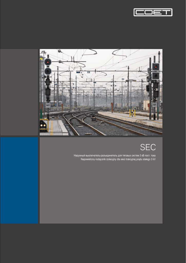 SEC Наружный выключатель-разъединитель для тяговых систем 3 кВ пост. тока Napowietrzny rozłącznik izolacyjny dla sieci trakcyjnej prądu stałego 3 kV НАРУЖНЫЙ ВЫКЛЮЧАТЕЛЬ РАЗЪЕДИНИТЕЛЬ NAPOWIETRZNY ROZŁĄCZNIK IZOLACYJNY Наружный выключатель-разъединитель (SEC) - это механическое устройство, предназначенное для включения, передачи и отключения тока в нормальных условиях и условиях перегрузки. Он пригоден для монтажа в железнодорожных линиях воздушных контактных проводов 3 кВ. Выключатель-разъединитель, как правило, используется как главный и/или байпасный, срабатывающий под нагрузкой, выключатель в системах питания постоянного тока и выполняет следующие функции: • • • отключение линии в целях безопасности или технического обслуживания (в железнодорожных системах обычно используется по одному выключателю-разъединителю постоянного тока для каждого фидера быстродействующего выключателя) соединение двух примыкающих секций одной и той же линии переключение линии с одного фидера на другой в случае отказа В целях соответствия наиболее строгим стандартам безопасности наши выключатели-разъединители оснащаются сигнальными контактами, соединенными с главными ножами и с аварийными ручными приводами, оснащенными всеми необходимыми вспомогательными органами управления или блокираторами катушек. Работа ПОД НАГРУЗКОЙ является гарантией максимально высокого уровня эксплуатационной надежности, что является основным требованием для современных подстанций. Наружный выключатель-разъединитель SEC по индивидуальным заказам оснащается: • • • • вспомогательными выходными контактами НО, НЗ и переключение расцепителем с шунтовой катушкой минимальным расцепителем напряжения устройством управления двигателем в верхнем или нижнем шкафе управления Napowietrzny rozłącznik izolacyjny prądu stałego (SEC) to urządzenie elektromechaniczne, które jest w stanie załączyć, przesyłać i odłączyć prąd w warunkach normalnych i podczas przeciążenia. Jest przeznaczony do stosowania w napowietrznych liniach kolejowych o mocy 3 kV CC. Rozłączniki prądu stałego są zazwyczaj wykorzystywane do rozłączania zasilania głównego oraz/lub obejściowego w systemach zasilania prądu stałego: • • • do odizolowania przewodu ze względów bezpieczeństwa lub w w związku z konserwacją (w systemach kolejowych zazwyczaj stosowany jest jeden rozłącznik izolacyjny prądu stałego na każdy przewód zasilający z szybkim wyłącznikiem) do łączenia dwóch sąsiednich części tego samego przewodu do przechodzenia pomiędzy dwoma przewodami zasilającymi w przypadku awarii jednego z nich Aby sprostać najbardziej surowym wymaganiom norm bezpieczeństwa, nasze rozłączniki są wyposażone w zestyk bezpiecznej sygnalizacji podłączony bezpośrednio do zestyku głównego oraz w ręczny system zadziałania awaryjnego wraz z kluczami lub cewkami blokującymi. Praca pod obciążeniem gwarantuje wysoki poziom niezawodności eksploatacyjnej zgodnie z wymogami nowoczesnych projektów podstacji. Możliwe wyposażenie napowietrznego rozłącznika izolacyjnego prądu stałego SEC: • • • • Różne konfiguracje zestyków pomocniczych NA, NC oraz C/O Cewka wybijakowa Cewka wyzwalacza podnapięciowego Element sterowania silnika w górnej lub dolnej skrzynce rozdzielczej ЭЛЕКТРИЧЕСКИЕ ХАРАКТЕРИСТИКИ / PARAMETRY ELEKTRYCZNE СПРАВОЧНЫЕ СТАНДАРТЫ Номинальное напряжение / Napięcie nominalne • 3 кВ пост.т. / kVdc Макс. постоянное напряжение / Maksymalne napięcie stałe • 3,6 кВ пост.т. / kVdc Макс. переменное напряжение / Maksymalne napięcie chwilowe (t ≤ 5’’) • 3,9 кВ пост.т. / kVdc Сухоразрядное напряжение пром. частоты 50/60 Гц в 1 сек. Napięcie prądu przemiennego o częstotliwości przemysłowej 50/60 Hz przez 1 s. na sucho - Между контактами и землей / Pomiędzy stykami a uziemieniem - На расстоянии отсечения / Przez izolację • • 50 кВ / kV 60 кВ / kV Мокроразрядное напряжение пром. частоты 50/60 Гц в 1 сек. Napięcie prądu przemiennego o częstotliwości przemysłowej 50/60 Hz przez 1 s. na mokro - Между контактами и землей / Pomiędzy stykami a uziemieniem - На расстоянии отсечения / Przez izolację • • 40 кВ / kV 48 кВ / kV • • 125 кВ / kV 150 кВ / kV • 2 кВ / kV NORMY REFERENCYJNE Выкл
