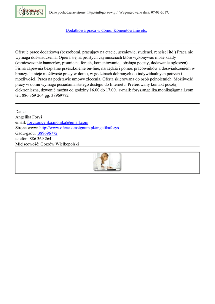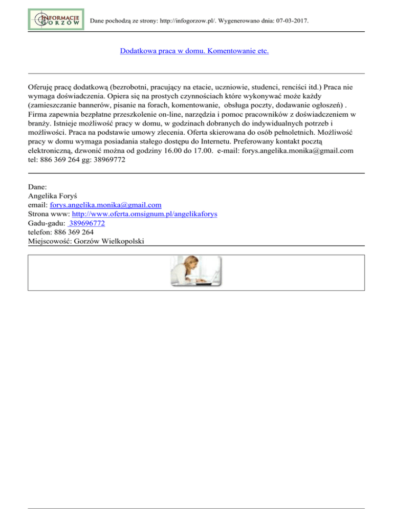 Dane pochodzą ze strony: http://infogorzow.pl/. Wygenerowano dnia: 07-03-2017. Dodatkowa praca w domu. Komentowanie etc. Oferuję pracę dodatkową (bezrobotni, pracujący na etacie, uczniowie, studenci, renciści itd.) Praca nie wymaga doświadczenia. Opiera się na prostych czynnościach które wykonywać może każdy (zamieszczanie bannerów, pisanie na forach, komentowanie, obsługa poczty, dodawanie ogłoszeń) . Firma zapewnia bezpłatne przeszkolenie on-line, narzędzia i pomoc pracowników z doświadczeniem w branży. Istnieje możliwość pracy w domu, w godzinach dobranych do indywidualnych potrzeb i możliwości. Praca na podstawie umowy zlecenia. Oferta skierowana do osób pełnoletnich. Możliwość pracy w domu wymaga posiadania stałego dostępu do Internetu. Preferowany kontakt pocztą elektroniczną, dzwonić można od godziny 16.00 do 17.00. e-mail: [email protected] tel: 886 369 264 gg: 38969772 Dane: Angelika Foryś email: [email protected] Strona www: http://www.oferta.omsignum.pl/angelikaforys Gadu-gadu: 389696772 telefon: 886 369 264 Miejscowość: Gorzów Wielkopolski