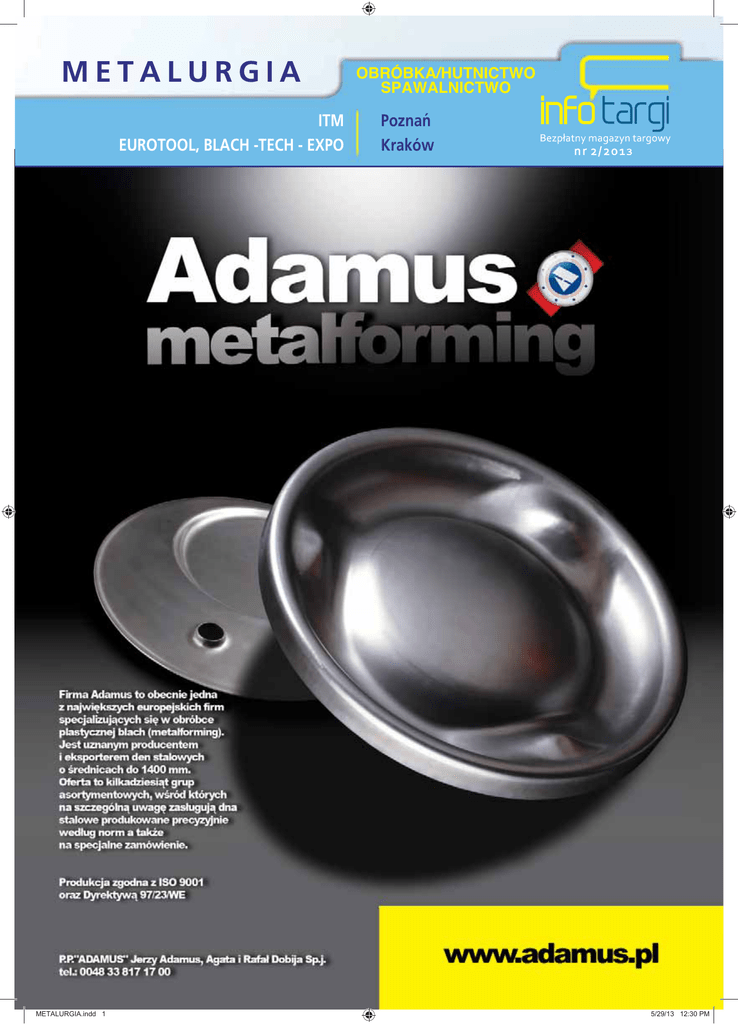 .&5"-63(*" *5. &630500-#-"$)5&$)&910 0#3Î#,")65/*$580 41"8"-/*$580 1P[OBO ,SBLwX 1 METALURGIA.indd 1 5/29/13 12:30 PM ,MVUIF1PMBOE4Q[PP Przedstawiciel niemieckich zakładów chemicznych KLUTHE GmbH KLUTHE POLAND Sp. z o. o. ul. Przylesie 8, 05-640 Mogielnica tel./fax: 48 66 35 552 tel./fax: 48 66 35 305 mobile: 600 911 201 e-mail: [email protected] KLUTHE POLAND Sp. z o. o. jest jedynym w Polsce oddziałem i dystrybutorem produktów niemieckich Chemicznych Zakładów KLUTHE GmbH z siedzibą w Heidelbergu, mającym za zadanie prezentację i wdrażanie Systemu - Kluthe w przemyśle polskim oraz prezentowanie jego ekonomicznych i technologicznych zalet. O B R Ó B K A C H E M I C Z N A MAT E R I A ŁÓ W www.kluthe.pl www.kluthe.com Oferujemy: - Produkty do chemicznej obróbki powierzchni przed lakierowaniem - Chłodziwa przemysłowe m. in. do: • obróbki skrawaniem, szlifowania metali kolorowych, jego stopów i żeliwa • obróbki aluminium i miedzi • walcowania stali • obróbki cieplnej • tłoczenia (w tym głębokiego) • szlifowania spiekanych węglików oraz obróbki elektrod węglowych - Środki do fosforowania, KTL - Środki myjące, zabezpieczające metale, drewno, beton - Środki neutralizujące i antykorozyjne stosowane po obróbce mechanicznej - Środki do usuwania farb i lakierów na zimno i gorąco - Środki do koagulacji farb i lakieru OFERUJEMY I ZAPEWNIAMY FACHOWĄ POMOC TECHNICZNĄ 2 METALURGIA.indd 2 5/29/13 12:30 PM AUTORYZOWANY PRZEDSTAWICIEL #0."3 Nasza firma jest autoryzowanym przedstawicielem firmy BOMAR, na terenie Polski. Firma BOMAR w swojej ofercie posiada szeroki wachlarz przecinarek taśmowych, co jakiś czas produkowane są nowe modele a stare udoskonalane w celu jak najlepszego zaspokojenia oczekiwań rynku czyli klienta. Przecinarki są zróżnicowane funkcjonalnie, od prostych ręcznych modeli poprzez grawitacyjne, półautomatyczne kończąc na w pełni zautomatyzowanych. DOŚWIADCZENIE Już wieloletnia obecność na rynku obrabiarek do metali świadczy o jakości sprzedawanych maszyn oraz standardów obsługi serwisowej. FACHOWE DORADZTWO TECHNICZNE Służymy fachowym doradztwem w zakresie doboru odpowiedniej przecinarki taśmowej, akcesoriów, wyposażenia dodatkowego, części i pił taśmowych. MAGAZYN CZĘŚCI Posiadamy w sprzedaży szeroki asortyment części zamiennych oraz materiałów eksploatacyjnych. ul. Zawiła 51a 30-442 Kraków tel.: +48 12 264 35 43 fax: +48 12 266 03 72 [email protected] www.hard.net.pl W NASZEJ OFERCIE - przecinarki taśmowe - wyposażenie dodatkowe - akcesoria - chłodziwa - systemy podajników - piły taśmowe - oryginalne części - autoryzowany serwis M A S Z Y N Y D O O B R Ó B K I M E TA L U SERWIS Zapewniamy serwis gwarancyjny i pogwarancyjny na terenie całego kraju. 3 METALURGIA.indd 3 5/29/13 12:30 PM ROZWIĄZANIA LOGISTYCZNE OBRÓBKA STALI RURY I PROFILE ROZWIĄZANIA PROJEKTOWE Wykorzystaj nasze możliwości łącząc różne procesy produkcyjne w ramach SSAB Shape w celu skrócenia czasu produkcji oraz zmniejszenia jej kosztów. Program SSAB Shape to najszybszy sposób na innowację produktów i zapewnienie pomyślnej przyszłości dzięki wykorzystaniu stali o wysokiej Niezależnie od tego, czy chcą Państwo zakupić gotowe produkty, złożyć zamówienie na materiały SSAB dostosowane do indywidualnych rozwiązań czy otrzymywać dostawy na czas – jesteśmy w stanie to wszystko zapewnić. Nadszedł czas, aby dołączyć do Shape! SHAPE Poland SSAB Poland Sp. z o.o. ul. Kolejowa 15 55-020 Żórawina, Poland D +48 71 346 73 11 [email protected] www.ssab.com METALURGIA.indd 4 5/29/13 12:30 PM GRUPA SECO/WARWICK to zintegrowana światowa firma dostarczająca urządzenia przemysłowe do procesów cieplnych i usługi w tej dziedzinie, odznaczające się wyjątkową jakością. Zapewniamy pełen wachlarz usług takich jak: profesjonalne wsparcie techniczne, projekt, SECO/WARWICK Europe S.A. produkcję, instalację, uruchomienie i szkolenia związane z obsługą urządzeń. ul. Świerczewskiego 76 66-200 Świebodzin tel.: 68 3819 800 fax: 68 3819 805 SECO/WARWICK to produkcja najwyższej jakości urządzeń mierzona w tysiącach dostarczonych instalacji, gwarantująca doskonałe parametry i przewagę konkurencyjną. Zawsze kładliśmy olbrzymi nacisk na dostawę najnowocześniejszych urządzeń oraz nowatorskich technologii. Przewagę nad konkurencją daje nam nasz wyposażony w przemysłowe e-mail: [email protected] www.secowarwick.com piece, Światowy Ośrodek Badawczo-Rozwojowy. Powstają w nim nowe technologie, wydajne i przyjazne dla środowiska naturalnego. GRUPA SECO/WARWICK oferuje urządzenia i usługi: • Kompatybilność z systemem NADCAP • Piece do różnorodnych procesów obróbki cieplnej metali, • Obsługę serwisową budowane według wymagań klienta • Szkolenia techniczne i technologiczne • Dostawa urządzeń wraz z technologią • Próby i badania w warunkach przemysłowych i laboratoryjnych • Dostawa urządzeń towarzyszących • Analizy i symulacje • Montaż i uruchomienie „pod klucz” • Współpracę z wyspecjalizowanmi ośrodkami technologicznymi • Wykonanie w standardach europejskich i amerykańskich METALURGIA.indd 5 i naukowymi 5/29/13 12:30 PM Wiertła lufowe Tuszyma 140 39-321 Tuszyma tel./fax: +48 17 581 32 15 tel./fax: +48 17 717 52 41 e-mail: [email protected] www.cera-tec.pl Zmiany w gałęziach przemysłu formierskiego, lotniczego, medycznego czy samochodowego spowodowały postęp w jakości produkcji. Chęć osiągnięcia jak najlepszego produktu zmusiła producentów do szukania nowych i bardziej wydajnych technologii. Jedną z takich technologii jest technologia głębokiego wiercenia bardzo długich otworów, do których służą wiertła lufowe inaczej zwane wiertłami wrzecionowymi. Zaliczają się one do wierteł o specjalnej konstrukcji lub zastosowaniu. Zazwyczaj zawierają kanały do doprowadzania chłodziwa i jednocześnie do odprowadzania