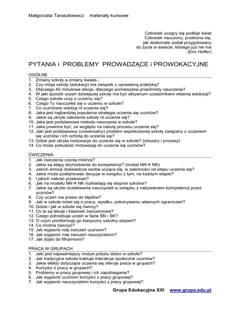Małgorzata Taraszkiewicz materiały kursowe Człowiek uczący się podbije świat Człowiek nauczony, przekona się, jak doskonale został przygotowany do Ŝycia w świecie, którego juŜ nie ma (Eric Hoffer) PYTANIA i PROBLEMY PROWADZĄCE i PROWOKACYJNE OGÓLNE 1. Zmiany szkoły a zmiany świata... 2. Czy misja szkoły (edukacji) ma związek z uprawianą praktyką? 3. Dlaczego 45 minutowe lekcje, dlaczego pomieszane przedmioty nauczania? 4. W jaki sposób uczeń dzisiejszej szkoły ma być aktywnym uczestnikiem własnej edukacji? 5. Czego szkoła uczy o uczeniu się? 6. Czego Ty nauczyłeś się o uczeniu w szkole? 7. Co uczniowie wiedzą nt uczenia się? 8. Jaka jest najbardziej popularna strategia uczenia się uczniów? 9. Jakie są ukryte załoŜenia szkoły nt uczenia się? 10. Jaka jest podstawowa metoda nauczania w szkole? 11. Jaka powinna być, ze względu na naturę procesu uczenia się? 12. Jaki jest podstawowy (uniwersalny) problem współczesnej szkoły związany z uczeniem się uczniów i ich ochotą do uczenia się? 13. Gdzie jest ukryta motywacja do uczenia się w szkole? (obszary i procesy) 14. Co moŜe pobudzać motywację do uczenia się uczniów? ĆWICZENIA 1. Jak ćwiczenia czynią mistrza? 2. Jakie są etapy dochodzenia do kompetencji? (mobel NN NK) 3. Jakich emocji doświadcza osoba ucząca się, w zaleŜności od etapu uczenia się? 4. Jakie moŜe podejmowac decyzje w związku z tym, na kaŜdym etapie? 5. I jakich nabrać przekonań? 6. Jak na modelu NN NK rozkładają się stopnie szkolne? 7. Jakie są ukryte oczekiwania nauczycieli w związku z nabywaniem kompetencji przez uczniów? 8. Czy uczeń ma prawo do błędów? 9. Jak w szkole mówi się o pracy, wysiłku, pokonywaniu własnych ograniczeń? 10. Gdzie i jak w szkole się ćwiczy? 11. Co to są lekcje i klasówki ćwiczeniowe? 12. Czego potrzebuje uczeń w fazie ŚN i ŚK? 13. O czym poinformuje go klasyczny szkolny stopień? 14. Co moŜna ćwiczyć? 15. Jak wyjasnić rolę ćwiczeń uczniom? 16. Jak wyjasnić rolę ćwiczeń nauczycielom? 17. Jak dojść do filharmonii? PRACA W GRUPACH 1. Jaki jest najwaŜniejszy motyw pobytu dzieci w szkole? 2. Jak tradycyjna szkoła traktuje interakcje społeczne uczniów? 3. Jakie efekty dotyczące uczenia się oferuje praca w grupach? 4. Korzyści z pracy w grupach? 5. Problemy w pracy grupowej i ich zapobieganie? 6. Jak wyjasnić uczniom korzyści z pracy grupowej? 7. Jak wyjasnić nauczycielom korzyści z pracy grupowej? Grupa Edukacyjna XXI www.grupa.edu.pl Małgorzata Taraszkiewicz materiały kursowe 8. Umiejętności współpracy w naszym społeczeństwie. OCENIANIE, KTÓRE POMAGA SIĘ UCZYĆ 1. Ocenianie czy informacje zwrotne korygujące? 2. Jakich informacji potrzebuje osoba ucząca się? 3. Efekt pt „ocena od dobrego przyjaciela i dobrego nieprzyjaciela” 4. Efekt kury a dylemat czy kolejna „dwójka” zwiększy pracę szarych komórek? 5. Co wpływa na ocenianie uczniów? 6. Czy jest moŜliwa ocena obiektywna? 7. Po co i komu potrzebne jest ocenianie stopniami? METODYKA PRACY 1. Czy tzw. „metody aktywizujące uczniów” aktywizują wszystkich uczniów? 2. Jakie są preferencje sensoryczne tradycyjnej szkoły? (WAK) 3. Jakie typy inteligencji preferuje tradycyjna szkoła? (WI) 4. Na czym polegają kolizje stylu uczenia (się) pomiędzy nauczycielami i uczniami? 5. Jak metody pracy nauczyciela wpływają na efekty uczenia się uczniów? 6. Które metody pracy „wciągają” uczniów, a które „wycinają” z pola ich sukcesu? (WAK, WI, IE) 7. Metody pracy a preferencje sensoryczne nauczyciela i uczniów? 8. Metody pracy a profile inteligencji nauczyciela i uczniów? 9. RównowaŜność wszystkich przedmiotów nauczania, ale nie równowaŜność dla kaŜdego ucznia? 10. Metody pracy a style uczenia się nauczyciela i uczniów? 11. Świadomość własnych preferencji nauczyciela a oferta dla uczniów? 12. Jak uczyć (się) polisensorycznie (WAK)? 13. Jak uczyć (się) multiinteligentnie? 14. Jak uczyć (się) w zgodzie z potrzebami praktyczno-pragmatycznymi uczniów? 15. Jak uczyć uczniów własnego stylu uczenia się? 16. Jak bogacić style uczenia się uczniów? STANY PSYCHOFIZYCZNE SPRZYJAJĄCE UCZENIU SIĘ 1. Jak uczeń po dzwonku ma być: skupiony, skoncentrowany, zmotywowany, aktywny i z otwartą pamięcią? 2. Jak ma taki być, ew. z wizją klasówki lub odpytywania? 3. Jakie uczeń posiada narzędzia do wejścia w optymalny stan? 4. Jak się wprowadzić w odpowiedni stan do uczenia się? 5. Czy stres pomaga w uczeniu się? 6. Jak działa uczeń w stresie? 7. Jak lekcje i klasówki ćwiczeniowe wpływają na obniŜenie poczucia stresu i podwyŜszenie sprawności rozumień i wykonań u uczniów? 8. Co uczeń wie o uczeniu się od strony stanów psychofizycznych? 9. Jak ruch wpływa na efektywność uczenia się? MAPOWANIE 1. Uczenie „preparatowe” czy tworzenie obrazu całości? 2. Mapowanie korzyści – tworzenie atrakcyjnych wizji. 3. Mapowanie tematu/problemu – tworzenie obupólkulowego obrazu całości 4. Mapa jako mega hak pamięciowy Grupa Edukacyjna XXI www.grupa.edu.pl Małgorzata Taraszkiewicz materiały kursowe 5. Mapa jako obraz myślenia ze zrozumieniem KONTRAKTY EDUKACYJNE 1. Umowa społeczna – wtęp do współodpowiedzialności za efekty edukacji nauczyciela, ucznia i rodzica. 2. Za co jest odpowiedzialny nauczyciel; pod jakimi ew. warunkami? 3. Za co jest odpowiedzialny uczeń; pod jakimi ew. warunkami? 4. Za co jest odpowiedzialny rodzic; pod jakimi ew. warunkami? 5. Jak powinien być skonstruowany dobry kontakt? REFLEKSYJNA PRAKTYKA 1. Strategia dla nauczyciela i uczniów 2. Jaka jest efektywność uczenia szkoły w Polsce? 3. Kto Ci robi kanapki? PODSUMOWANIE 1. Jak moŜna podnieść efektywność uczenia (się), nie zmieniając „niczego”? 2. Jak wprowadzić lekcje z uczenia się? 3. Tematy i treści lekcji dla uczniów. Grupa Edukacyjna XXI www.grupa.edu.pl Małgorzata Taraszkiewicz materiały kursowe Grupa Eduka