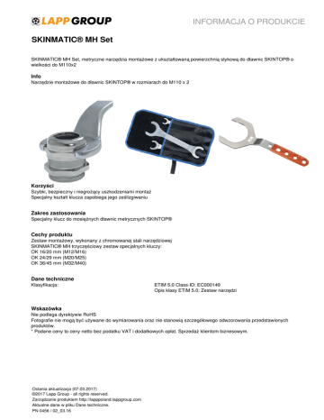 INFORMACJA O PRODUKCIE SKINMATIC® MH Set SKINMATIC® MH Set, metryczne narzędzia montażowe z ukształtowaną powierzchnią stykową do dławnic SKINTOP® o wielkości do M110x2 Info Narzędzie montażowe do dławnic SKINTOP® w rozmiarach do M110 x 2 Korzyści Szybki, bezpieczny i niegrożący uszkodzeniami montaż Specjalny kształt klucza zapobiega jego ześlizgiwaniu Zakres zastosowania Specjalny klucz do mosiężnych dławnic metrycznych SKINTOP® Cechy produktu Zestaw montażowy, wykonany z chromowanej stali narzędziowej SKINMATIC® MH trzyczęściowy zestaw specjalnych kluczy: OK 16/20 mm (M12/M16) OK 24/29 mm (M20/M25) OK 36/45 mm (M32/M40) Dane techniczne Klasyfikacja: Wskazówka ETIM 5.0 Class-ID: EC000149 Opis klasy ETIM 5.0: Zestaw narzędzi Nie podlega dyrektywie RoHS Fotografie nie mogą być używane do wymiarowania oraz nie stanowią szczegółowego odwzorowania przedstawionych produktów. * Podane ceny to ceny netto bez podatku VAT i dodatkowych opłat. Sprzedaż klientom biznesowym. Ostania aktualizacja (07.03.2017) ©2017 Lapp Group - all rights reserved. Zarządzanie produktem http://lapppoland.lappgroup.com Aktualne dane w pliku Dane techniczne. PN 0456 / 02_03.16 Powered by TCPDF (www.tcpdf.org) Szerokość wzdłuż płaskiej części [mm] Rozmiary dławnic z mosiądzu Długość całkowita [mm] 16/20, 24/29, 36/45 M 12, M 16, M 20, M 32, M 40 200/220/250 61791267 54 M 50 61791268 67 M 63 61791269 75 M 63 PLUS 61791286 95 M 75 61791287 115 M 90 61791288 135 M 110 SKINMATIC® MH-Set 61791273 SKINMATIC® MH klucz płaski SKINMATIC® MH Set Ostania aktualizacja (07.03.2017) ©2017 Lapp Group - all rights reserved. Zarządzanie produktem http://lapppoland.lappgroup.com Aktualne dane w pliku Dane techniczne. PN 0456 / 02_03.16 INFORMACJA O PRODUKCIE Powered by TCPDF (www.tcpdf.org) Numer katalogowy