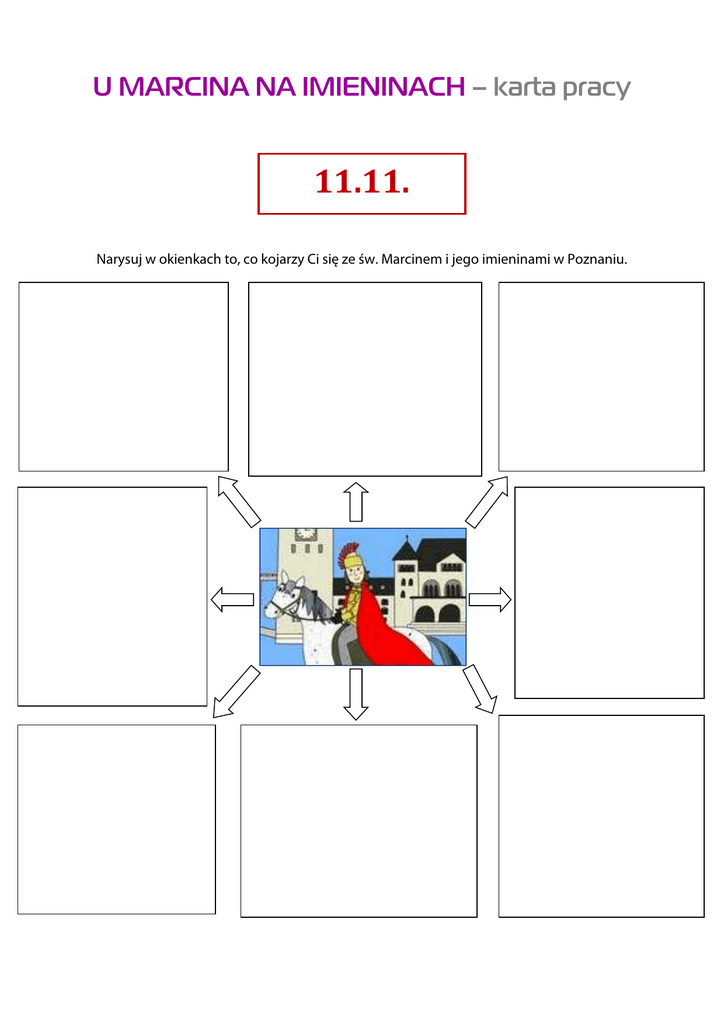 U MARCINA NA IMIENINACH – karta pracy 11.11. Narysuj w okienkach to, co kojarzy Ci się ze św. Marcinem i jego imieninami w Poznaniu. U MARCINA NA IMIENINACH – karta pracy 1. Tu wpisz datę imienin Marcina. 2. Zapisz nazwę instytucji kultury przedstawionej na zdjęciu oraz logo. .................................................................................................................... 3. Rozwiąż krzyżówkę. 1. 1. Leżał pod murami Amiens na obrazie "Wjazd św. Marcina do Amiens" 2. Barwny, maszeruje ulicą Święty Marcin 11 listopada. 2. 3. 4. 3. Żołnierz legionu rzymskiego. 5. 4. Zdradziły kryjówkę Marcina. 6. 5. Miesiąc imienin Marcina. 7. 6. Przekazywana z pokolenia na pokolenie. 8. 7. Pora roku, w której Marcin spotkał nędzarza. 9. 8. Słodki smakołyk o kształcie podkowy. 10. 9. Kolor płaszcza św. Marcina. 11. 10. Przekazuje go prezydent św. Marcinowi w dniu imienin ulicy. 12. 11. Maszeruje po niej barwny korowód. 12. Opowieść trochę prawdziwa, trochę wymyślona. Rozwiązanie : ....................................................................................................
