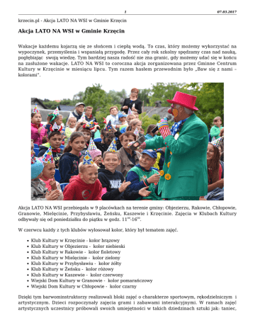 1 07.03.2017 krzecin.pl - Akcja LATO NA WSI w Gminie Krzęcin Akcja LATO NA WSI w Gminie Krzęcin Wakacje każdemu kojarzą się ze słońcem i ciepłą wodą. To czas, który możemy wykorzystać na wypoczynek, przemyślenia i wspaniałą przygodę. Przez cały rok szkolny spędzamy czas nad nauką, pogłębiając swoją wiedzę. Tym bardziej nasza radość nie zna granic, gdy możemy udać się w końcu na zasłużone wakacje. LATO NA WSI to coroczna akcja zorganizowana przez Gminne Centrum Kultury w Krzęcinie w miesiącu lipcu. Tym razem hasłem przewodnim było „Baw się z nami – kolorami”. Akcja LATO NA WSI przebiegała w 9 placówkach na terenie gminy: Objezierzu, Rakowie, Chłopowie, Granowie, Mielęcinie, Przybysławiu, Żeńsku, Kaszewie i Krzęcinie. Zajęcia w Klubach Kultury odbywały się od poniedziałku do piątku w godz. 1100-1600. W czerwcu każdy z tych klubów wylosował kolor, który był tematem zajęć. Klub Kultury w Krzęcinie - kolor brązowy Klub Kultury w Objezierzu - kolor niebieski Klub Kultury w Rakowie - kolor fioletowy Klub Kultury w Mielęcinie - kolor zielony Klub Kultury w Przybysławiu - kolor żółty Klub Kultury w Żeńsku - kolor różowy Klub Kultury w Kaszewie - kolor czerwony Wiejski Dom Kultury w Granowie - kolor pomarańczowy Wiejski Dom Kultury w Chłopowie - kolor czarny Dzięki tym barwominstruktorzy realizowali bloki zajęć o charakterze sportowym, rękodzielniczym i artystycznym. Dzieci rozpoczynały zajęcia grami i zabawami interakcyjnymi. W ramach zajęć artystycznych uczestnicy próbowali swoich umiejętności w takich dziedzinach sztuki jak: taniec, 2 07.03.2017 teatr, śpiew czy plastyka. Na zajęciach sportowych dzieci grały w gry zespołowe, bawiły się w specjalnie dostosowane do ich możliwości ruchowych zabawy zręcznościowe.Akcja „LATO NA WSI” to okazja do spotkań integracyjnych między klubami, podczas których dzieci mogły rywalizować między sobą w różnych dziedzinach. Takie spotkania kończyły się wspólnym ogniskiem i pieczeniem kiełbasek. Oprócz zajęć odbywały się spotkania orazpogadankiz przedstawicielami różnych instytucji, między innymi: -– panem Grzegorzem Knerą z Ochotniczej Straży Pożarnej w Chłopowie(spotkanie dotyczyło tematu bezpiecznych wakacji w połączeniu z pokazem sprzętu strażackiego) - Z Prezesem Oddziału Powiatowego WOPR w Choszcznie Bronisławem Pawlaczykiem (bezpieczne korzystanie i przebywanie nad wodą, a także umiejętność używania sprzętu ratunkowego oraz udzielanie pierwszej pomocy) - Z policjantami z Posterunku Policji w Krzęcinie (demoralizacja osób nieletnich, nadużywanie alkoholu oraz środków odurzających, włóczęgostwo i bezpieczeństwo podczas wakacji). - Z przedstawicielami Polskiego Związku Wędkarstwa („Tajniki Wędkarstwa” – nad jeziorem w Rakowie) Dużą atrakcją tegorocznej akcji „Lato na wsi” były wyjazdy do Szczecina na kompleks basenoworekreacyjny ARKONKA. Wyjazdy zorganizowane zostały przy współpracy z panią Kazimierą Prokopiak – przewodniczącą Gminnej Komisji Rozwiązywania Problemów Alkoholowych.Odbyły się dwa wyjazdy, w których łącznie wzięło udział około 100 osób z Gminy Krzęcin. Dzieci i młodzież,oprócz szaleństw basenowych, miały zapewnioną kiełbaskę z ogniska i w drodze powrotnej obiad w McDonald’s. Mimo, że trwają wakacje,instruktorzy nie zapomnieli o książkach i wraz z dziećmi wybrali się na wycieczkę do Publicznej Biblioteki w Krzęcinie, gdzie w ,,KOLOROWY ŚWIAT BAJEK” wprowadziła ich Ewa Smoderek, organizując wspólne czytanie. Spotkanie zakończyło się bajecznymi kolorowymi zajęciami plastycznymi. W tegorocznej akcji lato nie mogło zabraknąć artystycznych spotkań z mamą i tatą. ,,DZIEŃ Z KOLORAMI” to cykliczna impreza, która już trzeci raz zachęca rodziców do wspólnych działań ze swoimi pociechami. Rodzice, mimo swoich obowiązków i pracy zawodowej znaleźli czas, aby wziąć w niej udział. Było barwnie, wesoło, a przede wszystkim rodzinnie. 24 lipca w Wiejskim Domu Kultury w Chłopowie na zaproszenie Klubu Aktywnego Seniora odbyło się spotkanie z aktorem teatralnym, filmowym i telewizyjnym, obecnie aktorem teatru im. Osterwy w Gorzowie Wlkp., MICHAŁEM ANIOŁEM. W spotkaniu wzięli udział mieszkańcy Chłopowa, goście wypoczywający w Chłopowie oraz uczestnicy akcji „LATO NA WSI”. W podziękowaniu za spotkanie dzieci i młodzież podarowały aktorowi samodzielnie wykonanąpodczas warsztatówszkatułkę wykonaną metodą decoupage. W tym samym dniu na boisku „Orlik 2012” w Krzęcinie odbyły się otwarte Mistrzostwa Gminy Krzęcin w Piłce Nożnej 6-osobowej, w których wzięło udział ponad 70 osób z powiatu choszczeńskiego. Najlepszą drużyną okazał się KLON Krzęcin, który w finale pokonał ŚWIT Barnimie, najlepszym strzelcem został Przemysław Hładoniuk, a najlepszym bramkarzem Przemysław Grzegorczyk. Oprócz atrakcji dla dzieci i młodzieży, organizatorzy pomyśleli również o osobach dorosłych. 3 07.03.2017 Znakomitym pomysłem okazało się zorganizowanie pięciu koncertów zespołów śpiewaczych ,,Nadzieja” i ,,Stokrotki”, które miały na celu zaktywizować inne miejscowości do założenia Klubu Seniora lub Koła Gospodyń Wiejskich. Akcja „LATO NA WSI” w Gminie Krzęcin zakończyła się 30 lipca. Imprezę rozpoczęła wielobarwna parada, podążająca ulicami Krzęcina do amfiteatru. Następnie swoje pięć minut na scenie miały wszystkie placówki kultury, które przygotowywały krótkie, „kolorowe” występy artystyczne. Zakończenie akcji wzbogaciły występy artystyczne zaproszonych gości, również „kolorowych” klaunów RUPHERTA I RICO. W ich wykonaniu można było obejrzeć widowisko pt. „PAKUJEMY ZAPASY I JEDZIEMY NA WCZASY”. Po wyczerpujących kolorowych wariacjach z klaunami, każdy mógł usiąść i zjeść pyszną kiełbaskę z grilla. Niestety, wszystko co dobr