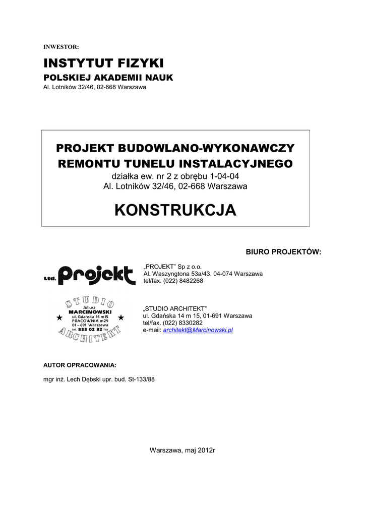 INWESTOR: INSTYTUT FIZYKI POLSKIEJ AKADEMII NAUK Al. Lotników 32/46, 02-668 Warszawa PROJEKT BUDOWLANO-WYKONAWCZY REMONTU TUNELU INSTALACYJNEGO działka ew. nr 2 z obrębu 1-04-04 Al. Lotników 32/46, 02-668 Warszawa KONSTRUKCJA BIURO PROJEKTÓW: „PROJEKT” Sp z o.o. Al. Waszyngtona 53a/43, 04-074 Warszawa tel/fax. (022) 8482268 „STUDIO ARCHITEKT” ul. Gdańska 14 m 15, 01-691 Warszawa tel/fax. (022) 8330282 e-mail: [email protected] AUTOR OPRACOWANIA: mgr inż. Lech Dębski upr. bud. St-133/88 Warszawa, maj 2012r SPIS TREŚCI Część konstrukcyjna I. Część opisowa. 1. Opis techniczny. 2. Kopia uprawnień i zaświadczenia przynależności do MOIIB projektanta. II. Rysunki. 1. Zestawienie elementów K-01 2. Zbrojenie elementów K-02 OPIS TECHNICZNA 1. Przedmiot opracowania. Przedmiotem niniejszego opracowania jest część konstrukcyjna projektu budowlanowykonawczy remontu tunelu instalacyjnego zlokalizowanego w rejonie dziedzińca budynku głównego pomiędzy budynkami nr1, 2 i 4 na terenie Instytutu Fizyki PAN w Warszawie, Al. Lotników 32/46. Inwestor: Instytut Fizyki Polskiej Akademii Nauk Al. Lotników 32/46, 02-668 Warszawa 2. Podstawa opracowania. Niniejszą dokumentację opracowano na podstawie: - projektu architektury, - opinii technicznej dotyczącej przedmiotowego tunelu opracowanej przez inż. B. Brauna w grudniu 2008r. 3. Opis stanu istniejącego. Na terenie Instytutu Fizyki PAN w części środkowej pomiędzy budynkami nr 1,2,4, pod aleją pieszą łączącą zespół budynków znajdują się tunele instalacyjne podziemne. Fragment tunelu między budynkami, w zakresie opracowania, od strony południowej posiada ścianę boczną murowaną z cegły pełnej o wysokości ok. 2,1m zakończoną żelbetową ścianką wspornikową wysokości ok. 1,5m. Ścianka żelbetowa zakotwiona jest jedynie wieńcu ściany kanału, na którym opierają się prefabrykowane, żelbetowe płyty zamykające kanał. W wyniku działania na ściankę żelbetową parcia spoczynkowego warstw wykończeniowych znajdujących się nad przekryciem kanału oraz naziomu ściana wspornikowa uległa obróceniu tak, że jej wierzchołek w przemieścił się poziomo o ok. 6,5cm. Wychylenie to jest zauważalne „gołym okiem”. Do ściany te przylegają zewnętrzne schody prowadzące na niższy dziedziniec zielony. Schody te zostały wykonane jako konstrukcja żelbetowa monolityczna. 4. Stan projektowy. 4.1 Wzmocnienie wspornikowej ścianki żelbetowej. Wzmocnienie to projektuje się jako odciążającą ścianę oporową wylaną na stropie zamykającym tunel instalacyjny. Pozioma płyta dolna ścianki oporowej wylana zostanie na warstwie 5cm styropianu. Pomiędzy istniejącą ścianką wspornikową a pionową częścią ściany oporowej przewiduje się również wykonanie warstwy styropianu gr. 3cm. 4.2 Schody zewnętrzne. Schody te projektuje się jako konstrukcję płytową żelbetową monolityczną o schemacie płyty dwuprzęsłowej w miejscu przewidzianych do wyburzenia istniejących schodów zewnętrznych. Schody te opierają się na ścianie tunelu oraz na ścianach żelbetowych. Zaprojektowano również ławę pod ścianę murowaną zamykającą przestrzeń poniżej płyty schodów. 5. Zabezpieczenie i naprawa istniejący elementów żelbetowych tunelu. Po odsłonięciu prefabrykowanych płyt stropowych oraz wsporników żelbetowych należy przeprowadzić naprawy tych elementów. Sposób naprawy elementów Żelbetowych: - zabezpieczenie odsłoniętych odcinków stali zbrojeniowej powłoką antykorozyjną np. MonoTop 610 firmy Sika (sposób przygotowania powierzchni odkrytych prętów oraz powierzchni betonu wg zaleceń producenta), - wypełnienie przestrzeni przy odsłoniętych odcinkach zbrojenia zaprawą MonoTop 612 firmy Sika (przygotowanie powierzchni betonu wg zaleceń producenta), - wypełnienie wnęk w miejscach oparcia płyt prefabrykowanych na ścianach wykonać przez wprowadzenie pod ciśnieniem zaczynu cementowego, - nałożenie od spodu na całej powierzchni płyt prefabrykowanych środka impregnacyjnego beton zawierającego migrujące inhibitory korozji np. Sika FerroGard 903 (nanoszenie preparatu wg instrukcji producenta) - wzmocnienie płyt w przypadku większej ilości osłoniętych i skorodowanych prętów w jednej płycie (płyty szerokości 50cm posiadają 5 prętów zbrojeniowych w rozstawie co 10cm): - jeden pręt skorodowany w płycie i brak skorodowanych prętów w płytach sąsiednich wystarczy – wystarczy zabezpieczenie opisane wyżej, - dwa i więcej prętów skorodowanych lub po jednym pręcie w dwóch sąsiadujących płytach - wzmocnienie przez naklejanie taśm z włókna węglowego np. Sika Carbodur za pomocą kleju epoksydowego Sikadur 30. Dopuszcza się możliwość zastosowania innych materiałów o tych samych właściwościach i jakości niż te, które zostały zaproponowane.