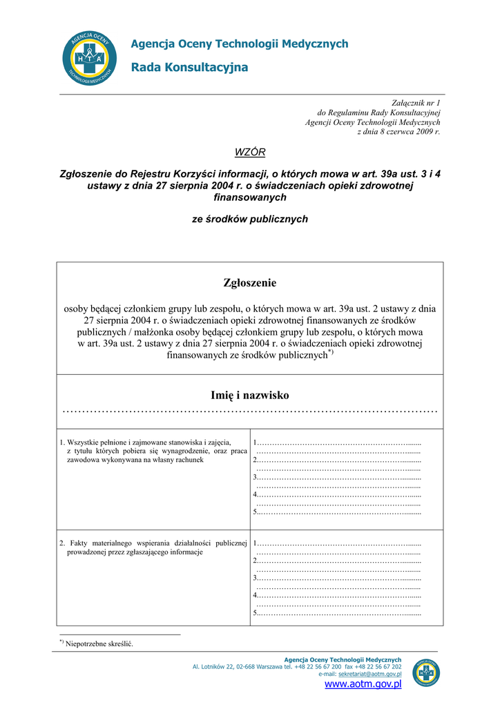 Agencja Oceny Technologii Medycznych Rada Konsultacyjna Załącznik nr 1 do Regulaminu Rady Konsultacyjnej Agencji Oceny Technologii Medycznych z dnia 8 czerwca 2009 r. WZÓR Zgłoszenie do Rejestru Korzyści informacji, o których mowa w art. 39a ust. 3 i 4 ustawy z dnia 27 sierpnia 2004 r. o świadczeniach opieki zdrowotnej finansowanych ze środków publicznych Zgłoszenie osoby będącej członkiem grupy lub zespołu, o których mowa w art. 39a ust. 2 ustawy z dnia 27 sierpnia 2004 r. o świadczeniach opieki zdrowotnej finansowanych ze środków publicznych / małŜonka osoby będącej członkiem grupy lub zespołu, o których mowa w art. 39a ust. 2 ustawy z dnia 27 sierpnia 2004 r. o świadczeniach opieki zdrowotnej finansowanych ze środków publicznych*) Imię i nazwisko …………………………………………………………………………………… 1. Wszystkie pełnione i zajmowane stanowiska i zajęcia, 1……………………………………………………....... z tytułu których pobiera się wynagrodzenie, oraz praca ……………………………………………………....... zawodowa wykonywana na własny rachunek 2.………………………………………………….......... ……………………………………………………....... 3.………………………………………………….......... ……………………………………………………....... 4.……………………………………………………...... ……………………………………………………....... 5..…………………………………………………......... 2. Fakty materialnego wspierania działalności publicznej 1……………………………………………………....... prowadzonej przez zgłaszającego informacje ……………………………………………………....... 2.………………………………………………….......... ……………………………………………………....... 3.………………………………………………….......... ……………………………………………………....... 4.……………………………………………………...... ……………………………………………………....... 5..…………………………………………………......... *) Niepotrzebne skreślić. Agencja Oceny Technologii Medycznych Al. Lotników 22, 02-668 Warszawa tel. +48 22 56 67 200 fax +48 22 56 67 202 e-mail: [email protected] www.aotm.gov.pl 3. Otrzymane darowizny, jeŜeli wartość takiej darowizny przekracza 20 % przeciętnego wynagrodzenia w gospodarce narodowej w poprzednim roku kalendarzowym ogłaszanego przez Prezesa Głównego Urzędu Statystycznego na podstawie art. 20 pkt 1 lit. a ustawy z dnia 17 grudnia 1998 r. o emeryturach i rentach z Funduszu Ubezpieczeń Społecznych (Dz. U. z 2004 r. Nr 39, poz. 353, z późn. zm.) 1……………………………………………………....... ……………………………………………………....... 2.………………………………………………….......... ……………………………………………………....... 3.………………………………………………….......... ……………………………………………………....... 4.……………………………………………………...... ……………………………………………………....... 5..…………………………………………………......... 4. Wyjazdy krajowe i zagraniczne, jeŜeli ich koszt nie został 1……………………………………………………....... pokryty przez zgłaszającego informacje lub jego małŜonka ……………………………………………………....... albo instytucje ich zatrudniające 2.………………………………………………….......... ……………………………………………………....... 3.………………………………………………….......... ……………………………………………………....... 4.……………………………………………………...... ……………………………………………………....... 5..…………………………………………………......... 5. Inne uzyskane korzyści, jeŜeli wartość takiej korzyści przekracza 20 % przeciętnego wynagrodzenia w gospodarce narodowej w poprzednim roku kalendarzowym ogłaszanego przez Prezesa Głównego Urzędu Statystycznego na podstawie art. 20 pkt 1 lit. a ustawy z dnia 17 grudnia 1998 r. o emeryturach i rentach z Funduszu Ubezpieczeń Społecznych (Dz. U. z 2004 r. Nr 39, poz. 353, z późn. zm.), niezwiązane z zajmowaniem stanowisk lub wykonywaniem zajęć albo pracy zawodowej, o której mowa w pkt 1 niniejszego zgłoszenia 1……………………………………………………....... ……………………………………………………....... 2.………………………………………………….......... ……………………………………………………....... 3.………………………………………………….......... ……………………………………………………....... 4.……………………………………………………...... ……………………………………………………....... 5..…………………………………………………......... 6. Informacje o udziale w organach fundacji, spółek handlowych lub spółdzielni 1……………………………………………………....... ……………………………………………………....... 2.………………………………………………….......... ……………………………………………………....... 3.………………………………………………….......... ……………………………………………