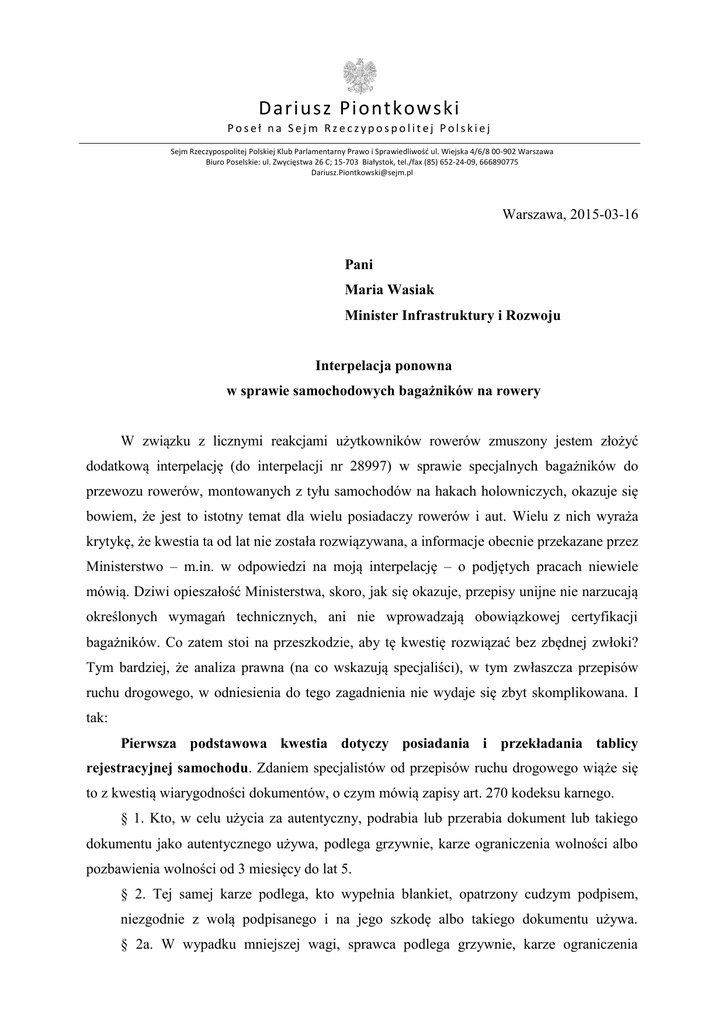 Dariusz Piontkowski Poseł na Sejm Rzeczypospolitej Polskiej Sejm Rzeczypospolitej Polskiej Klub Parlamentarny Prawo i Sprawiedliwość ul. Wiejska 4/6/8 00-902 Warszawa Biuro Poselskie: ul. Zwycięstwa 26 C; 15-703 Białystok, tel./fax (85) 652-24-09, 666890775 [email protected] Warszawa, 2015-03-16 Pani Maria Wasiak Minister Infrastruktury i Rozwoju Interpelacja ponowna w sprawie samochodowych bagażników na rowery W związku z licznymi reakcjami użytkowników rowerów zmuszony jestem złożyć dodatkową interpelację (do interpelacji nr 28997) w sprawie specjalnych bagażników do przewozu rowerów, montowanych z tyłu samochodów na hakach holowniczych, okazuje się bowiem, że jest to istotny temat dla wielu posiadaczy rowerów i aut. Wielu z nich wyraża krytykę, że kwestia ta od lat nie została rozwiązywana, a informacje obecnie przekazane przez Ministerstwo – m.in. w odpowiedzi na moją interpelację – o podjętych pracach niewiele mówią. Dziwi opieszałość Ministerstwa, skoro, jak się okazuje, przepisy unijne nie narzucają określonych wymagań technicznych, ani nie wprowadzają obowiązkowej certyfikacji bagażników. Co zatem stoi na przeszkodzie, aby tę kwestię rozwiązać bez zbędnej zwłoki? Tym bardziej, że analiza prawna (na co wskazują specjaliści), w tym zwłaszcza przepisów ruchu drogowego, w odniesienia do tego zagadnienia nie wydaje się zbyt skomplikowana. I tak: Pierwsza podstawowa kwestia dotyczy posiadania i przekładania tablicy rejestracyjnej samochodu. Zdaniem specjalistów od przepisów ruchu drogowego wiąże się to z kwestią wiarygodności dokumentów, o czym mówią zapisy art. 270 kodeksu karnego. § 1. Kto, w celu użycia za autentyczny, podrabia lub przerabia dokument lub takiego dokumentu jako autentycznego używa, podlega grzywnie, karze ograniczenia wolności albo pozbawienia wolności od 3 miesięcy do lat 5. § 2. Tej samej karze podlega, kto wypełnia blankiet, opatrzony cudzym podpisem, niezgodnie z wolą podpisanego i na jego szkodę albo takiego dokumentu używa. § 2a. W wypadku mniejszej wagi, sprawca podlega grzywnie, karze ograniczenia Dariusz Piontkowski Poseł na Sejm Rzeczypospolitej Polskiej Sejm Rzeczypospolitej Polskiej Klub Parlamentarny Prawo i Sprawiedliwość ul. Wiejska 4/6/8 00-902 Warszawa Biuro Poselskie: ul. Zwycięstwa 26 C; 15-703 Białystok, tel./fax (85) 652-24-09, 666890775 [email protected] wolności albo pozbawienia wolności do lat 2. § 3. Kto czyni przygotowania do przestępstwa określonego w § 1, podlega grzywnie, karze ograniczenia wolności albo pozbawienia wolności do lat 2. Jak widać na podstawie tych przepisów nie można – w przypadku korzystania z uchwytów – zarzucić celowości działania przekładania tablicy rejestracyjnej lub wykorzystania formy naklejki z numerem rejestracyjnym jako podrabianie dokumentu tablicy rejestracyjnej. Producenci uchwytów na rowery przewidzieli te zastrzeżenia i stosują zewnętrzną ramkę do przełożenia tablicy rejestracyjnej. Nie można w tej sytuacji uznać, że przełożenie tablicy rejestracyjnej do zestawu uchwytu jest naruszeniem powyższego przepisu, gdyż dokument, jakim jest tablica rejestracyjna, nie jest przerabiany i nie są to działania, mające na celu wprowadzenia organów ścigania w błąd, ani mające na celu osiągnięcia jakiekolwiek korzyści. Miejsce wystawienia tablicy rejestracyjnej w aucie jest ściśle określone, lecz w określonych warunkach (np. po zdarzeniu drogowym, po uzyskaniu nowych tablic rejestracyjnych lub w innym zdarzeniu losowym) można przełożyć tablicę w inne miejsce widoczne np. w tylne okno pojazdu. Drugą kwestią przy korzystaniu z zawiesia rowerów jest problem widoczności tylnego oświetleniem. Otóż, zdaniem specjalistów widoczność świateł w nowoczesnych samochodach nie jest w takiej sytuacji utrudniona z uwagi na wysoką wydajność świateł oraz ich zróżnicowanie. Czerwone tylne światła zwiastują proces hamowania lub inne zagrożenie, które powinno powodować u użytkownika pojazdu jadącego za nim określoną wzmożoną uwagę. Natomiast światło pomarańczowe również jest widoczne z uwagi na dużą wydajność świetlną, a ponadto występuje w kilku punktach na obrysie pojazdu. Do powyższych argumentów dochodzi także praktyka kontroli ruchu drogowego. W związku z brakiem odpowiednich przepisów policjanci nie mają pewności, jak mają się zachować i w praktyce można spodziewać się skrajnie odmiennych postaw. Przy tym z reguły pojazdy obcych krajów nie są weryfikowane pod kontem użycia i korzystania z uchwytów rowerowych na hakach, bowiem policjanci uznają, iż mają oni prawo je używać. Trzeba zauważyć, że coraz więcej osób chce korzystać z mocowania rowerów z wykorzystaniem uchwytów rowerowych na hakach. W dodatku to rozwiązanie jest łatwiejsze w użyciu, bowiem, ze względu na znaczne gabaryty niektórych samochodów, nie każda osoba Dariusz Piontkowski Poseł na Sejm Rzeczypospolitej Polskiej Sejm Rzeczypospolitej Polskiej Klub Parlamentarny Prawo i Sprawiedliwość ul. Wiejska 4/6/8 00-902 Warszawa Biuro Poselskie: ul. Zwycięstwa 26 C; 15-703 Białystok, tel./fax (85) 652-24-09, 666890775 [email protected] jest w stanie samodzielnie zamontować rower na uchwycie dachowym. Nie mówiąc o tym, że zamontowanie roweru na uchwycie dachowym powoduje dodatkowe utrudnienie w kierowaniu pojazdem, bowiem zmienia się środek ciężkości, co powodują możliwość spowodowania kolizji w wyniku zmiany kierunku ruchu pojazdu. Rozwiązanie zamocowania roweru na haku, w zasięgu rąk i możliwości udźwigu kierującego, jest znacznie wygodniejsze. Zmiana przepisów powinna być dostosowana do życia i z taką inicjatywą powinno wyjść Ministerstwo, bowiem sprawa ma znaczenie ogólnospołeczne. Mając powyższe na względzie, uprzejmie proszę o odpowiedź na następujące pytania: 1. Kiedy dokładnie (w odpowiedzi podano, że w 2013 r.) i 