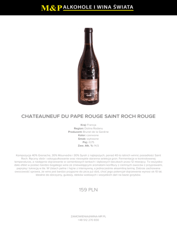 CHATEAUNEUF DU PAPE ROUGE SAINT ROCH ROUGE Kraj: Francja Region: Dolina Rodanu Producent: Brunel de la Gardine Kolor: czerwone Smak: wytrawne Poj.: 0,75 Zaw. Alk. %: 14,5 Kompozycja 40% Grenache, 30% Mourvedre i 30% Syrah z najlepszych, ponad 40-to letnich winnic posiadłości Saint Roch. Ręczny zbiór i odszypułkowanie oraz niezwykle staranna selekcja gron. Fermentacja w kontrolowanej temperaturze, a następnie dojrzewanie w cementowych tankach i dębowych beczkach przez 12 miesięcy. To wszystko dało efekt w postaci bardzo bogatego wina ze zniewalającymi aromatami konfitury z ciemnych owoców z przyprawami, papryką i lukrecją w tle. W Ustach pełne i hojne z intensywną, a jednocześnie aksamitną taniną. Dobrze zachowana owocowość sprawia, że wino jest bardzo przyjazne do picia już dziś, choć jego potencjał dojrzewania wynosi ok 10 lat. Idealne do dziczyzny, gulaszy, steków wołowych i wszystkich dań na bazie grzybów. 159 PLN [email protected] +48 512 270 830