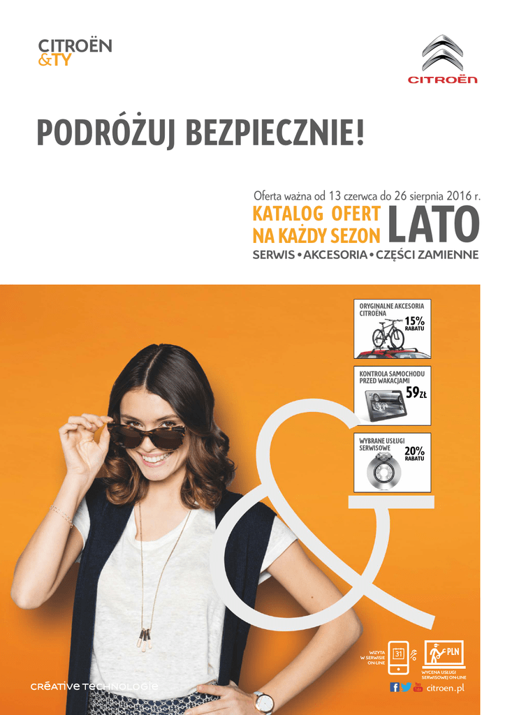 CITROËN &TY PODRÓŻUJ BEZPIECZNIE! Oferta ważna od 13 czerwca do 26 sierpnia 2016 r. KATALOG OFERT NA KAŻDY SEZON LATO SERWIS AKCESORIA CZĘŚCI ZAMIENNE ORYGINALNE AKCESORIA CITROËNA 15% RABATU KONTROLA SAMOCHODU PRZED WAKACJAMI 59ZŁ 20% RABATU WIZYTA W SERWISIE ON-LINE PLN WYCENA USŁUGI SERWISOWEJ ON-LINE citroen.pl KOMFORT I ŚWIEŻOŚĆ W UPALNE DNI! 89ZŁ USŁUGA OBEJMUJE: OCZYSZCZENIE PRZEWODÓW WENTYLACYJNYCH W UKŁADZIE KLIMATYZACJI Z GRZYBÓW I DROBNOUSTROJÓW ZA POMOCĄ SPECJALNYCH PREPARATÓW. ZABIEG SKUTECZNIE USUWA NIEPRZYJEMNE ZAPACHY I JEST SZCZEGÓLNIE ISTOTNY DLA ALERGIKÓW. WARTO WIEDZIEĆ DZIAŁANIE UKŁADU KLIMATYZACJI PROWADZI DO SKRAPLANIA SIĘ PARY WODNEJ ORAZ DO ROZWOJU DROBNOUSTROJÓW I GRZYBÓW W JEGO WNĘTRZU. . SĄ ONE PRZYCZYNĄ PRZYKRYCH ZAPACHÓW W SAMOCHODZIE ORAZ MOGĄ WYWOŁYWAĆ OBJAWY ALERGII I RÓŻNE CHOROBY. COROCZNE OCZYSZCZANIE, ODGRZYBIANIE I DEZYNFEKCJA UKŁADU KLIMATYZACJI UMOŻLIWIA UNIKNIĘCIE TYCH PROBLEMÓW. . DLATEGO, ABY MÓC W PEŁNI KORZYSTAĆ Z KOMFORTU JAKI ZAPEWNIA UKŁAD KLIMATYZACJI SZCZEGÓLNIE PRZED NADEJŚCIEM CIEPŁYCH DNI NALEŻY PAMIĘTAĆ O JEJ SKUTECZNYM OCZYSZCZENIU. 2 OFERTA OBEJMUJE WSZYSTKIE MODELE SAMOCHODÓW MARKI CITROËN WYPOSAŻONE W KLIMATYZACJĘ. PROFESJONALNA KONTROLA I SPOKOJNIE RUSZASZ W DROGĘ! KONTROLA SAMOCHODU PRZED WAKACJAMI 59ZŁ WARTO WIEDZIEĆ WAKACJE TO CZAS DŁUGICH I DALEKICH PODRÓŻY. SAMOCHÓD POWINIEN WIĘC BYĆ DOKŁADNIE SPRAWDZONY TAK, ABY NIE ZAWIÓDŁ CIĘ W NAJMNIEJ OCZEKIWANYM MOMENCIE. . DLATEGO PRZED SEZONEM WYJAZDÓW WAKACYJNYCH SZCZEGÓLNIE POWINIENEŚ ZADBAĆ O STAN TECHNICZNY TWOJEGO CITROËNA. KOMPLEKSOWA KONTROLA I NA WAKACJE JEDZIESZ BEZ OBAW! KONTROLA NA ŚCIEŻCE DIAGNOSTYCZNEJ* 49ZŁ WARTO WIEDZIEĆ Z CZASEM ELEMENTY ZAWIESZENIA I UKŁADU HAMULCOWEGO ULEGAJĄ ZUŻYCIU CO W KONSEKWENCJI PROWADZI DO POGORSZENIA SIĘ TRAKCJI ORAZ SPADKU SKUTECZNOŚCI HAMOWANIA. . KONTROLA SAMOCHODU NA ŚCIEŻCE DIAGNOSTYCZNEJ POZWOLI NA DOKŁADNĄ WERYFIKACJĘ STANU ZAWIESZENIA I DZIAŁANIA HAMULCÓW W TWOIM CITROËNIE, CO JEST SZCZEGÓLNIE ISTOTNE PRZED WYJAZDEM W DŁUŻSZĄ TRASĘ. *USŁUGA DOSTĘPNA W WYBRANYCH SERWISACH CITROËNA. 59ZŁ KONTROLA SAMOCHODU PRZED WAKACJAMI WIZUALNA KONTROLA 1. STANU TARCZ I KLOCKÓW HAMULCOWYCH 2. STANU REFLEKTORÓW PRZEDNICH, KIERUNKOWSKAZÓW, LAMP TYLNYCH 3. 4. STANU PIÓR WYCIERACZEK PRZEDNICH I TYLNEJ 5. STANU NAŁADOWANIA AKUMULATORA 6. STANU PASKA OSPRZĘTU ( KONTROLA WIZUALNA ) 7. FUNKCJONOWANIA UKŁADU SPRYSKIWACZA SZYBY / REFLEKTORÓW* * W ZALEŻNOŚCI OD WYPOSAŻENIA 8. FUNKCJONOWANIA ŚWIATEŁ, OŚWIETLENIA I SYGNALIZACJI 9. FUNKCJONOWANIA HAMULCA POSTOJOWEGO 10. FUNKCJONOWANIA OGRZEWANIA I WENTYLACJI 11. WAŻNOŚCI GAŚNICY SAMOCHODOWEJ PRAWIDŁOWA NIEPRAWIDŁOWA UWAGI PRAWIDŁOWA NIEPRAWIDŁOWA UWAGI STANU OPON I FELG ( WERYFIKACJA CIŚNIENIA ) KONTROLA POZIOMU: 1. OLEJU SILNIKOWEGO 2. PŁYNU DO SPRYSKIWACZA 3. PŁYNU W UKŁADZIE CHŁODZENIA 4. PŁYNU HAMULCOWEGO 5. PŁYNU W UKŁADZIE WSPOMAGANIA DANE SAMOCHODU: MODEL NR REJESTRACYJNY Wykonano w dniu: ROK PRODUKCJI PRZEBIEG UWAGA: WYKONANIE CZYNNOŚCI OBJĘTYCH KONTROLĄ NIE ZASTĘPUJE PRZEGLĄDU OKRESOWEGO. UWAGI: KONTROLA NA ŚCIEŻCE DIAGNOSTYCZNEJ * ZAKRES KONTROLI OBEJMUJE WERYFIKACJĘ: 1. STANU I CIŚNIENIA KÓŁ JEZDNYCH 2. STANU TECHNICZNEGO UKŁADU ZAWIESZENIA 3. SKUTECZNOŚCI TŁUMIENIA AMORTYZATORÓW 4. STANU TECHNICZNEGO, SKUTECZNOŚCI I RÓWNOMIERNOŚCI DZIAŁANIA HAMULCÓW 5. SKUTECZNOŚCI DZIAŁANIA HAMULCA POSTOJOWEGO 6. JAKOŚCI PŁYNU HAMULCOWEGO 49ZŁ WARTO WIEDZIEĆ KONTROLA OPON KONTROLA AMORTYZATORÓW STAN BIEŻNIKA I CIŚNIENIE W OPONACH WPŁYWA BEZPOŚREDNIO NA BEZPIECZEŃSTWO JAZDY ORAZ ZUŻYCIE PALIWA. ZBYT NISKI BIEŻNIK – PONIŻEJ 1,6 MM – TO WSKAZANIE DO WYMIANY OPON W DANEJ OSI SAMOCHODU. JEŚLI TEGO NIE ZROBIMY, NA MOKREJ NAWIERZCHNI WARSTWA WODY ZACZNIE ODDZIELAĆ OPONĘ OD JEZDNI (ZJAWISKO „AQUAPLANINGU”), CO GROZI UTRATĄ PRZYCZEPNOŚCI, POŚLIZGIEM LUB WYDŁUŻONĄ DROGA HAMOWANIA. SPRAWNE AMORTYZATORY ODPOWIEDZIALNE SĄ NIE TYLKO ZA KOMFORT JAZDY CZY ODPOWIEDNI KONTAKT KOŁA Z NAWIERZCHNIĄ, ALE I ZA KRÓTSZĄ DROGĘ HAMOWANIA. W PROFESJONALNYCH SERWISACH SIŁĘ HAMOWANIA (PO KONTROLI UKŁADU HAMULCOWEGO) I SKUTECZNOŚĆ TŁUMIENIA AMORTYZATORÓW TESTUJE SIĘ NA LINII DIAGNOSTYCZNEJ, A KIEROWCA OTRZYMUJE KOMPUTEROWE WYDRUKI Z WYNIKAMI BADANIA. KONTROLA ZAWIESZENIA KONTROLA HAMULCÓW KONTROLA ZAWIESZENIA OD KTÓREGO ZALEŻY UTRZYMANIE WŁAŚCIWEGO TORU JAZDY, SZCZEGÓLNIE W OBCIĄŻONYM WAKACYJNYM BAGAŻEM SAMOCHODZIE. PODSTAWĄ BEZPIECZEŃSTWA JEST SPRAWNIE DZIAŁAJĄCY UKŁAD HAMULCOWY. PRZED WYJAZDEM OBOWIĄZKOWO ZATEM MUSIMY SPRAWDZIĆ STAN KLOCKÓW HAMULCOWYCH ORAZ TARCZ. JEŚLI TARCZE SĄ CIENKIE LUB NIERÓWNO ZUŻYTE, A KLOCKI SĄ BARDZO WYTARTE, TO NALEŻY WYMIENIĆ TE ELEMENTY. WARTO PAMIĘTAĆ O TYM, ŻE WYMIENIAMY ZARÓWNO KLOCKI, JAK I TARCZE NA OBU KOŁACH TEJ SAMEJ OSI. *USŁUGA DOSTĘPNA W WYBRANYCH SERWISACH CITROËNA. Z NAMI SKUTECZNIE TRAFISZ DO CELU PODRÓŻY! CENY SPECJALNE WARTO WIEDZIEĆ JEŚLI POSIADASZ NOWY SAMOCHÓD Z SYSTEMEM eMyWay LUB SMEG ZAKUPIONY PO 1 LIPCA 2015, ZAPYTAJ W SERWISIE CITROËNA O SZCZEGÓŁY PROGRAMU MAPCARE. M A P Y D O FA B R Y C Z N E G O S Y S T E M U N A W I G A C J I W PA Ń S T W A SAMOCHODZIE POWINNY BYĆ AKTUALIZOWANE. . KAŻDE NOWE WYDANIE UWZGLĘDNIA ZMIANY SIECI DROGOWEJ, STAJE SIĘ TAKŻE BOGATSZE O TYSIĄCE NOWYCH PUNKTÓW POI (STACJE OBSŁUGI, PARKINGI, ATRAKCJE ITP.). . ABY ZAPEWNIĆ PODRÓŻ W JESZCZE WIĘKSZYM STOPNIU SPOKOJNIEJSZĄ, NIEKTÓRE WERSJE ZAWIERAJĄ TAKŻE INFORMACJE O RADARACH. 5 Z NAMI ZACHOWASZ DYSTANS! DLA WSZYSTKICH MODELI SAMOCHODÓW MARKI CITROËN POWYŻEJ 2 LAT WARTO WIEDZIEĆ KLOCKI HAMULCOWE STANOWIĄ JEDEN Z NAJWAŻNIEJSZYCH ELEMENTÓW W UKŁADZIE HAMULCOWYM, KTÓREGO SPRAWNOŚĆ BEZPOŚREDNIO WPŁYWA NA BEZPIECZEŃSTWO NA DRODZE. M O C N O Z U Ż Y T E K LO C K I P O W O D U J Ą Z M N I E J S Z E N I E SKUTECZNOŚCI DZIAŁANIA UKŁADU HAMULCOWEGO ORAZ P R O WA D 