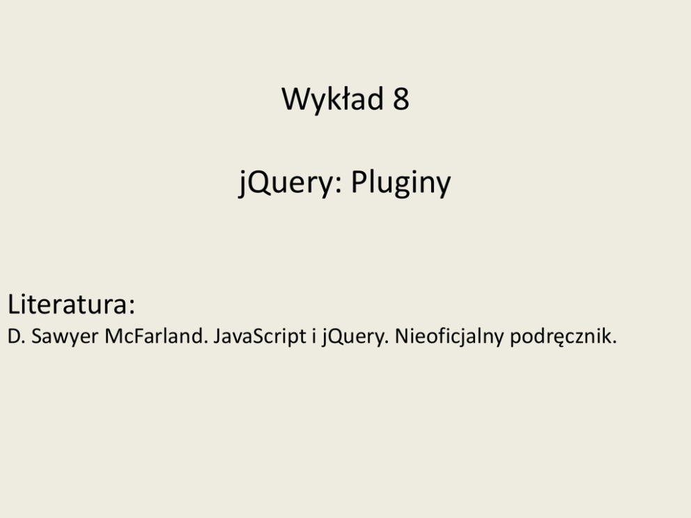 Wykład 8 jQuery: Pluginy Literatura: D. Sawyer McFarland. JavaScript i jQuery. Nieoficjalny podręcznik. Rozwijane menu (cz. 1) Plugin: Mega Drop Down Menu - menu poziome rozwijane do dołu Przykłady: http://www.designchemical.com/lab/jquery-mega-drop-down-menuplugin/examples/ Pobranie: http://www.designchemical.com Pozycja menu: JQUERY i dalej Mega Drop Down Menu Plugin Pozycja menu: Download W pobranej paczce będzie m.in. plik index.html gdzie jest przykład użycia Jak skorzystać z pluginu: 1. dołączyć arkusz stylów, który stylizuje menu 2. dołączyć bibliotekę jQuery 3. dołączyć skrypt pluginu 4. napisać skrypt uruchamiający menu 5. kod html menu: lista punktowana a) dla listy nadać atrybut "id" o dowolnej wartości. Nadaną wartość należy użyć w selekcji w p. 4. Ponadto nadać dla listy atrybut "class" o wartości "megamenu" b) listę umieścić w elemencię div. Atrybut class tego div-a decyduje o kolorze menu. Jeśli nadamy "red" należy dodać arkusz red.css Przykład użycia: menu.html (Uwaga: ścieżki są ustawione, tak że ten plik należy umieścić w tym samym katalogu, w którym jest katalog megamenu z wypakowanym pluginem Rozwijane menu (cz. 2) Inne menu: • menu pionowe wysuwane do dołu: Vertical Accordion Menu Plugin • menu pionowe wysuwane w bok: Vertical Mega Menu Plugin Sposób pobrania i uruchomienia menu analogicznie jak pluginu Mega Drop Down Menu z poprzedniego slajdu Pobranie: http://www.designchemical.com Pozycja menu: JQUERY i dalej albo Vertical Accordion Menu Plugin albo Vertical Mega Menu Plugin a tam Pozycja menu: Download Galeria zdjęć Plugin: FancyBox: http://fancybox.net/ Przykłady do obejrzenia: http://fancyapps.com/fancybox/ i dalej link "Examples" Pobranie: link "license & download". Po rozpakowaniu w katalogu demo/index.html przykładowe galerie Jak skorzystać z pluginu: 1. dołączyć arkusz stylów, który stylizuje galerię 2. dołączyć bibliotekę jQuery 3. dołączyć skrypt pluginu 4. napisać skrypt uruchamiający galerię 5. kod html galerii: a) linki do obrazków umieścić w div, któremu nadać dowolną wartość atrybutu id b) opisem linku jest obrazek-miniatura c) do każdego linku dodać atrybut "rel" o tej samej wartości (utworzenie grupy obrazków do wyświetlenia) Przykład użycia: galeria.html (Uwaga: ścieżki są ustawione, tak że ten plik należy umieścić w tym samym katalogu, w którym jest katalog fancybox z wypakowanym pluginem Inny plugin: Lightbox2: http://lokeshdhakar.com/ Slider Plugin: AnythingSlider Przykłady do obejrzenia: http://css-tricks.github.io/AnythingSlider/ W formie slajdów może być wyświetlana dowolna zawartość HTML nie tylko zdjęcia Pobranie: http://css-tricks.github.io/AnythingSlider/ i link "Download" Jak skorzystać z pluginu: Należy wykonać analogiczne kroki jak w pluginach z poprzednich slajdów. Po wypakowaniu pluginu jest tam m.in. plik simple.html na którym można się wzorować. Przykład użycia: galeriaslider.html (Uwaga: ścieżki są ustawione, tak że ten plik należy umieścić w tym samym katalogu, w którym jest katalog anythingslider z wypakowanym pluginem Sprawdzanie poprawności formularzy plugin jQuery Validation. Pobranie : http://jqueryvalidation.org/ link "Download" Przykłady do obejrzenia: po wypakowaniu pluginu: demo/index.html Jak skorzystać z pluginu: analogicznie jak w przypadku poprzednich pluginów Aby było sprawdzane dane pole formularza należy dodać atrybut class z odpowiednią wartością. Np.: • aby pole tekstowe było niepuste: <input type="text" class="required"> • poprawny adres email: <input type="text" class="email"> • tylko wartość liczbowa: <input type="text" class="digits"> Własne informację o błędach tworzymy poprzez atrybut title. Np.: <input type="text" class="email" title="Podałeś niepoprawny adres email"> Przykład użycia: formularz.html (Uwaga: ścieżki są ustawione, tak że ten plik należy umieścić w tym samym katalogu, w którym jest katalog validation z wypakowanym pluginem) Więcej możliwości sprawdzania: patrz http://jqueryvalidation.org link "Documentation" Wygodny wybór daty w formularzu Plugin jQuery UI Datepicker Pobranie: http://jqueryui.com/download/ Wystarczy wybrać tylko komponent (widget) DatePicker, pozostałe odznaczyć. Na dole strony: Theme Base i dalej link "Download" Jak skorzystać z pluginu: analogicznie jak w przypadku poprzednich pluginów Przykład użycia: data.html (Uwaga: ścieżki są ustawione, tak że plik ten należy umieścić w tym samym katalogu, w którym jest katalog data z wypakowanym pluginem) Więcej o Datepicker: http://api.jqueryui.com/datepicker/ tam m.in. o ustawieniach, np. w jakim formacie zostanie wprowadzona data