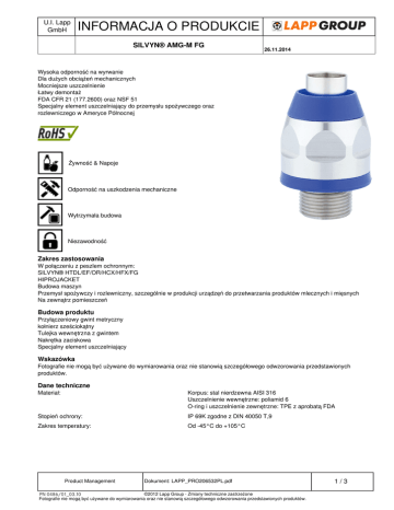 U.I. Lapp GmbH INFORMACJA O PRODUKCIE SILVYN® AMG-M FG 26.11.2014 Wysoka odporność na wyrwanie Dla dużych obciążeń mechanicznych Mocniejsze uszczelnienie Łatwy demontaż FDA CFR 21 (177.2600) oraz NSF 51 Specjalny element uszczelniający do przemysłu spożywczego oraz rozlewniczego w Ameryce Północnej Żywność & Napoje Odporność na uszkodzenia mechaniczne Wytrzymała budowa Niezawodność Zakres zastosowania W połączeniu z peszlem ochronnym: SILVYN® HTDL/EF/OR/HCX/HFX/FG HIPROJACKET Budowa maszyn Przemysł spożywczy i rozlewniczny, szczególnie w produkcji urządzęń do przetwarzania produktów mlecznych i mięsnych Na zewnątrz pomieszczeń Budowa produktu Przyłączeniowy gwint metryczny kołnierz sześciokątny Tulejka wewnętrzna z gwintem Nakrętka zaciskowa Specjalny element uszczelniający Wskazówka Fotografie nie mogą być używane do wymiarowania oraz nie stanowią szczegółowego odwzorowania przedstawionych produktów. Dane techniczne Materiał: Korpus: stal nierdzewna AISI 316 Uszczelnienie wewnętrzne: poliamid 6 O-ring i uszczelnienie zewnętrzne: TPE z aprobatą FDA Stopień ochrony: IP 69K zgodne z DIN 40050 T,9 Zakres temperatury: Od -45°C do +105°C Product Management Dokument: LAPP_PRO206532PL.pdf ©2012 Lapp Group - Zmiany techniczne zastrzeżone PN 0486/01_03.10 Fotografie nie mogą być używane do wymiarowania oraz nie stanowią szczegółowego odwzorowania przedstawionych produktów. 1/3 Powered by TCPDF (www.tcpdf.org) Wielkość nominalna Min. średnica wewnętrzna Dla średnicy zewętrznej peszla [mm] Średnica wewnętrzna Rozmiar klucza SW [mm] Liczba sztuk w opakowaniu 55503275 16 x 1,5 3/8" 10,2 17.8 10.2 27 10.0 55503276 20 x 1,5 1/2" 13,9 21.1 13.9 30 10.0 55503277 25 x 1,5 3/4" 18,5 26.4 18.5 36 5.0 55503278 32 x 1,5 1" 23,8 33.1 23.8 46 5.0 55503271 40 x 1,5 1 1/4" 31,8 41.8 31.8 54 2.0 55503269 50 x 1,5 1 1/2" 36,8 47.8 36.8 63 1.0 55503397 63 x 1,5 2" 47,8 59.9 47.8 77 1.0 SILVYN AMG FG SILVYN® AMG-M FG Dokument: LAPP_PRO206532PL.pdf INFORMACJA O PRODUKCIE Oznaczenie wyrobu U.I. Lapp GmbH Product Management 26.11.2014 ©2012 Lapp Group - Zmiany techniczne zastrzeżone PN 0486/01_03.10 Fotografie nie mogą być używane do wymiarowania oraz nie stanowią szczegółowego odwzorowania przedstawionych produktów. Numer artykułu 2/3 Powered by TCPDF (www.tcpdf.org) U.I. Lapp GmbH INFORMACJA O PRODUKCIE SILVYN® AMG-M FG Product Management 26.11.2014 Dokument: LAPP_PRO206532PL.pdf ©2012 Lapp Group - Zmiany techniczne zastrzeżone PN 0486/01_03.10 Fotografie nie mogą być używane do wymiarowania oraz nie stanowią szczegółowego odwzorowania przedstawionych produktów. 3/3