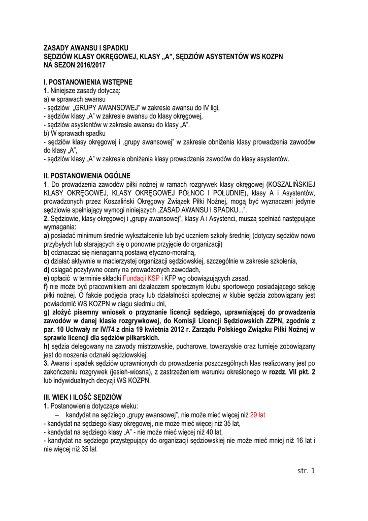 ZASADY AWANSU I SPADKU SĘDZIÓW KLASY OKRĘGOWEJ, KLASY „A”, SĘDZIÓW ASYSTENTÓW WS KOZPN NA SEZON 2016/2017 I. POSTANOWIENIA WSTĘPNE 1. Niniejsze zasady dotyczą: a) w sprawach awansu - sędziów „GRUPY AWANSOWEJ” w zakresie awansu do IV ligi, - sędziów klasy „A” w zakresie awansu do klasy okręgowej, - sędziów asystentów w zakresie awansu do klasy „A”. b) W sprawach spadku - sędziów klasy okręgowej i „grupy awansowej” w zakresie obniżenia klasy prowadzenia zawodów do klasy „A”, - sędziów klasy „A” w zakresie obniżenia klasy prowadzenia zawodów do klasy asystentów. II. POSTANOWIENIA OGÓLNE 1. Do prowadzenia zawodów piłki nożnej w ramach rozgrywek klasy okręgowej (KOSZALIŃSKIEJ KLASY OKRĘGOWEJ, KLASY OKRĘGOWEJ PÓŁNOC I POŁUDNIE), klasy A i Asystentów, prowadzonych przez Koszaliński Okręgowy Związek Piłki Nożnej, mogą być wyznaczeni jedynie sędziowie spełniający wymogi niniejszych „ZASAD AWANSU I SPADKU...”. 2. Sędziowie, klasy okręgowej i „grupy awansowej”, klasy A i Asystenci, muszą spełniać następujące wymagania: a) posiadać minimum średnie wykształcenie lub być uczniem szkoły średniej (dotyczy sędziów nowo przybyłych lub starających się o ponowne przyjęcie do organizacji) b) odznaczać się nienaganną postawą etyczno-moralną, c) działać aktywnie w macierzystej organizacji sędziowskiej, szczególnie w zakresie szkolenia, d) osiągać pozytywne oceny na prowadzonych zawodach, e) opłacić w terminie składki Fundacji KSP i KFP wg obowiązujących zasad, f) nie może być pracownikiem ani działaczem społecznym klubu sportowego posiadającego sekcję piłki nożnej. O fakcie podjęcia pracy lub działalności społecznej w klubie sędzia zobowiązany jest powiadomić WS KOZPN w ciągu siedmiu dni, g) złożyć pisemny wniosek o przyznanie licencji sędziego, uprawniającej do prowadzenia zawodów w danej klasie rozgrywkowej, do Komisji Licencji Sędziowskich ZZPN, zgodnie z par. 10 Uchwały nr IV/74 z dnia 19 kwietnia 2012 r. Zarządu Polskiego Związku Piłki Nożnej w sprawie licencji dla sędziów piłkarskich. h) sędzia delegowany na zawody mistrzowskie, pucharowe, towarzyskie oraz turnieje zobowiązany jest do noszenia odznaki sędziowskiej. 3. Awans i spadek sędziów uprawnionych do prowadzenia poszczególnych klas realizowany jest po zakończeniu rozgrywek (jesień-wiosna), z zastrzeżeniem warunku określonego w rozdz. VII pkt. 2 lub indywidualnych decyzji WS KOZPN. III. WIEK I ILOŚĆ SĘDZIÓW 1. Postanowienia dotyczące wieku: kandydat na sędziego „grupy awansowej”, nie może mieć więcej niż 29 lat - kandydat na sędziego klasy okręgowej, nie może mieć więcej niż 35 lat, - kandydat na sędziego klasy „A” - nie może mieć więcej niż 40 lat, - kandydat na sędziego przystępujący do organizacji sędziowskiej nie może mieć mniej niż 16 lat i nie więcej niż 35 lat str. 1 - w przypadku sędziów wnioskujących o reaktywację i mających powyżej 38 lat decyzja o przydatności będzie podejmowana przez WS KOZPN Jako miarodajny przyjmuje się wiek osiągnięty przez sędziego w danym roku kalendarzowym jaki sędzia osiągnie 31 grudnia 2017r. 2. Sędzia, który w danym roku kalendarzowym osiągnie granicę wieku, nie uzyskuje prolongaty uprawnień na następny sezon rozgrywkowy (traci uprawnienia po zakończeniu rundy wiosennej). - sędzia klasy okręgowej może pozostać na liście sędziów tej klasy do 50 roku życia, natomiast sędziowie, którzy prowadzili IV ligę i wyższą do 55 roku życia - sędzia klasy „A” do 60 roku życia, - sędzia asystent do 67 roku życia. W szczególnie uzasadnionych przypadkach (np. duże zasługi sędziego dla organizacji, wysoki poziom prowadzenia zawodów, sportowa sylwetka) wiek ten (67 l.) może być przedłużony. Decyzję o czasookresie i warunkach prolongaty uprawnień sędziowskich na okres powyżej 67 roku życia podejmuje Zarząd WS KOZPN. 3. W uzasadnionych przypadkach Zarząd Wydziału Sędziowskiego KOZPN może odstąpić od ww. reguły wieku. 4. Przed rozpoczęciem każdego kolejnego sezonu, na liście uprawnionych do prowadzenia zawodów w poszczególnych klasach rozgrywkowych, nie może być więcej sędziów niż: a) w klasie okręgowej plus „grupa awansowa” - do 65. sędziów b) w klasie A - do 40 sędziów. IV. EGZAMINY PRAKTYCZNE 1. Na zawodach sędziowie mogą być poddawani egzaminom praktycznym (obserwacjom). Oceny wystawiane są w skali od 5.00 do 10 pkt. stopniowanie co 0,10 pkt. 2. Jeśli sędzia uzyskał z egzaminu praktycznego ocenę niższą niż 7.00, to nie będzie on obsadzany na zawody w swojej klasie rozgrywkowej przez najbliższe 4 kolejki, po czym zostanie poddany na najbliższych wyznaczonych mu zawodach w swojej klasie rozgrywkowej, obserwacji komisyjnej przeprowadzonej przez obserwatora mającego uprawnienia minimum III ligi po której Zarząd WS KOZPN podejmie decyzję co do dalszej przydatności sędziego. Sędzia, który w danym sezonie rozgrywkowym po raz drugi otrzyma z egzaminu praktycznego ocenę niższą niż 7,00 , zostanie wycofany z listy sędziów w swojej klasie rozgrywkowej. a) Jeżeli w trakcie egzaminu praktycznego sędzia główny podejmie błędne decyzje o dużym znaczeniu (np. wypaczenie wyniku punktowego lub bramkowego), Z WINY SĘDZIEGO ASYSTENTA, W SYTUACJI, GDY Z NATURALNIE ZAJMOWANEJ POZYCJI NIE MÓGŁ SAMODZIELNIE PRAWIDŁOWO OCENIĆ SYTUACJI, to nie spowoduje to odsunięcia od prowadzenia zawodów w tej klasie rozgrywkowej, w której jest sędzią, ale nie może otrzymać oceny wyższej niż 7,90. b) Jeżeli sędzia z grupy sędziów asystentów lub sędzia klasy okręgowej, klasy A występujący w charakterze asystenta w danym spotkaniu otrzyma z egzaminu praktycznego ocenę 6.80 lub niższą, to nie będzie on brany pod uwagę przy obsadzie zawodów przez najbliższe 3 kolejki we wszystkich klasach rozgrywkowych. 3. Sędzia, który z egzaminu 