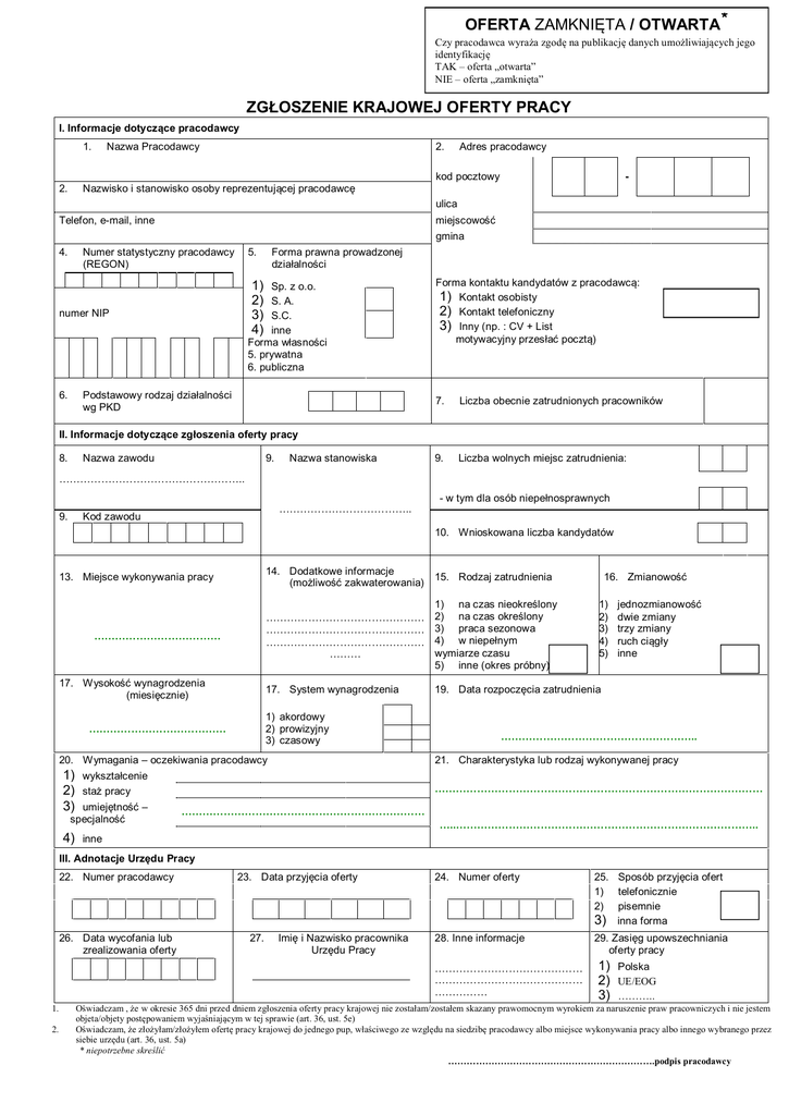 * OFERTA ZAMKNIĘTA / OTWARTA Czy pracodawca wyraża zgodę na publikację danych umożliwiających jego identyfikację TAK – oferta „otwarta” NIE – oferta „zamknięta” ZGŁOSZENIE KRAJOWEJ OFERTY PRACY I. Informacje dotyczące pracodawcy 1. Nazwa Pracodawcy 2. Adres pracodawcy kod pocztowy 2. - Nazwisko i stanowisko osoby reprezentującej pracodawcę ulica Telefon, e-mail, inne 4. miejscowość gmina Numer statystyczny pracodawcy (REGON) 5. 1) 2) 3) 4) Sp. z o.o. S. A. S.C. inne Forma własności 5. prywatna 6. publiczna numer NIP 6. Forma prawna prowadzonej działalności Podstawowy rodzaj działalności wg PKD Forma kontaktu kandydatów z pracodawcą: 1) Kontakt osobisty 2) Kontakt telefoniczny 3) Inny (np. : CV + List motywacyjny przesłać pocztą) 7. Liczba obecnie zatrudnionych pracowników 9. Liczba wolnych miejsc zatrudnienia: II. Informacje dotyczące zgłoszenia oferty pracy 8. Nazwa zawodu 9. Nazwa stanowiska …………………………………………….. - w tym dla osób niepełnosprawnych 9. ……………………………….. Kod zawodu 10. Wnioskowana liczba kandydatów 13. Miejsce wykonywania pracy ……………………………… 17. Wysokość wynagrodzenia (miesięcznie) 14. Dodatkowe informacje (możliwość zakwaterowania) 15. Rodzaj zatrudnienia ……………………………………… ……………………………………… ……………………………………… ……… 1) na czas nieokreślony 2) na czas określony 3) praca sezonowa 4) w niepełnym wymiarze czasu 5) inne (okres próbny)UUM 17. System wynagrodzenia 19. Data rozpoczęcia zatrudnienia 1) akordowy 2) prowizyjny 3) czasowy ………………………………… 20. Wymagania – oczekiwania pracodawcy 1) wykształcenie 2) staż pracy 3) umiejętność – specjalność 4) 16. Zmianowość 1) 2) 3) 4) 5) jednozmianowość dwie zmiany trzy zmiany ruch ciągły inne ……………………………………………….. 21. Charakterystyka lub rodzaj wykonywanej pracy ………………………………………………………………………………… …………………………………………………………… …..………………………………………………………………………….. inne III. Adnotacje Urzędu Pracy 22. Numer pracodawcy 26. Data wycofania lub zrealizowania oferty 23. Data przyjęcia oferty 27. Imię i Nazwisko pracownika Urzędu Pracy 24. Numer oferty 25. Sposób przyjęcia ofert 1) telefonicznie 2) pisemnie 3) inna forma 28. Inne informacje 29. Zasięg upowszechniania oferty pracy …………………………………… …………………………………… …………… 1. 2. 1) 2) 3) Polska UE/EOG ……….. Oświadczam , że w okresie 365 dni przed dniem zgłoszenia oferty pracy krajowej nie zostałam/zostałem skazany prawomocnym wyrokiem za naruszenie praw pracowniczych i nie jestem objeta/objety postępowaniem wyjaśniającym w tej sprawie (art. 36, ust. 5e) Oświadczam, że złożyłam/złożyłem ofertę pracy krajowej do jednego pup, właściwego ze względu na siedzibę pracodawcy albo miejsce wykonywania pracy albo innego wybranego przez siebie urzędu (art. 36, ust. 5a) * niepotrzebne skreślić ………………………………………………………….podpis pracodawcy