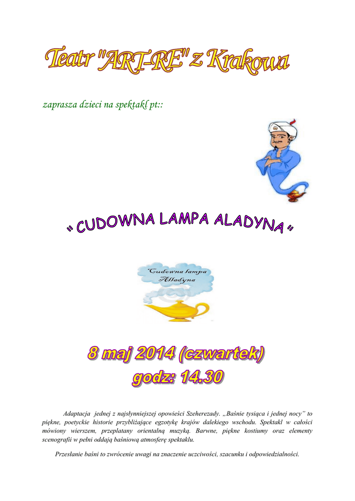 zaprasza dzieci na spektakl pt:: Adaptacja jednej z najsłynniejszej opowieści Szeherezady. „Baśnie tysiąca i jednej nocy” to piękne, poetyckie historie przybliżające egzotykę krajów dalekiego wschodu. Spektakl w całości mówiony wierszem, przeplatany orientalną muzyką. Barwne, piękne kostiumy oraz elementy scenografii w pełni oddają baśniową atmosferę spektaklu. Przesłanie baśni to zwrócenie uwagi na znaczenie uczciwości, szacunku i odpowiedzialności.