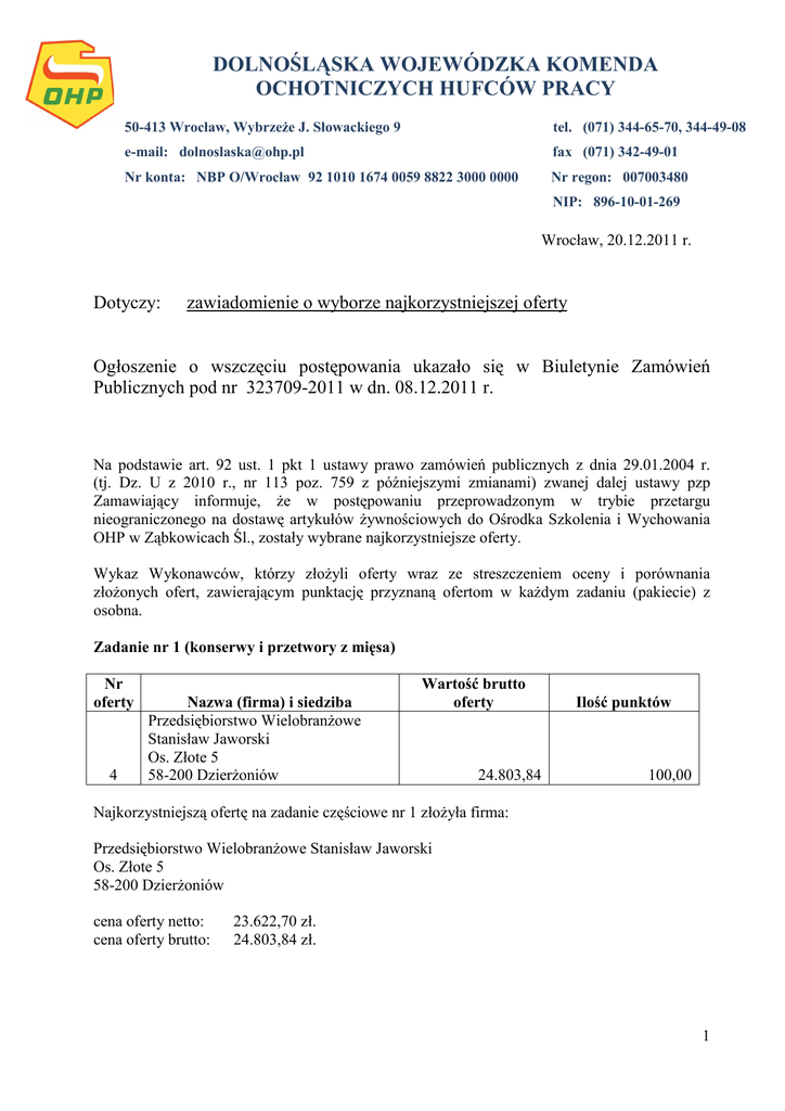 DOLNOŚLĄSKA WOJEWÓDZKA KOMENDA OCHOTNICZYCH HUFCÓW PRACY 50-413 Wrocław, WybrzeŜe J. Słowackiego 9 tel. (071) 344-65-70, 344-49-08 e-mail: [email protected] fax (071) 342-49-01 Nr konta: NBP O/Wrocław 92 1010 1674 0059 8822 3000 0000 Nr regon: 007003480 NIP: 896-10-01-269 Wrocław, 20.12.2011 r. Dotyczy: zawiadomienie o wyborze najkorzystniejszej oferty Ogłoszenie o wszczęciu postępowania ukazało się w Biuletynie Zamówień Publicznych pod nr 323709-2011 w dn. 08.12.2011 r. Na podstawie art. 92 ust. 1 pkt 1 ustawy prawo zamówień publicznych z dnia 29.01.2004 r. (tj. Dz. U z 2010 r., nr 113 poz. 759 z późniejszymi zmianami) zwanej dalej ustawy pzp Zamawiający informuje, Ŝe w postępowaniu przeprowadzonym w trybie przetargu nieograniczonego na dostawę artykułów Ŝywnościowych do Ośrodka Szkolenia i Wychowania OHP w Ząbkowicach Śl., zostały wybrane najkorzystniejsze oferty. Wykaz Wykonawców, którzy złoŜyli oferty wraz ze streszczeniem oceny i porównania złoŜonych ofert, zawierającym punktację przyznaną ofertom w kaŜdym zadaniu (pakiecie) z osobna. Zadanie nr 1 (konserwy i przetwory z mięsa) Nr oferty 4 Nazwa (firma) i siedziba Przedsiębiorstwo WielobranŜowe Stanisław Jaworski Os. Złote 5 58-200 DzierŜoniów Wartość brutto oferty 24.803,84 Ilość punktów 100,00 Najkorzystniejszą ofertę na zadanie częściowe nr 1 złoŜyła firma: Przedsiębiorstwo WielobranŜowe Stanisław Jaworski Os. Złote 5 58-200 DzierŜoniów cena oferty netto: cena oferty brutto: 23.622,70 zł. 24.803,84 zł. 1 Zadanie nr 2 (RóŜne rodzaje mięs i wędlin) Nr oferty 2 6 Nazwa (firma) i siedziba Zakłądy Mięsne „Niebieszczańscy” Sp. J. Proszówka 36 59-620 Gryfów Śląski Gminna Spółdzielnia „Samopomoc Chłopska” ul. 1-go Maja 25 57-200 Ząbkowice Śl. Wartość brutto oferty Ilość punktów 32.076,89 100,00 39.075,24 82,09 Najkorzystniejszą ofertę na zadanie częściowe nr 2 złoŜyła firma: Zakłądy Mięsne „Niebieszczańscy” Sp. J. Proszówka 36 59-620 Gryfów Śląski cena oferty netto: cena oferty brutto: 30.549,40 zł. 32.076,89 zł. Zadanie nr 3 (RóŜne produkty mleczarskie) Nr oferty 5 Firma (nazwa) oraz adres Wykonawcy Wartość brutto oferty Liczba pkt. w kryterium (cena=100%) 42.435,97 100,00 P.P.H.U „MLEK-POL” Sp. z o.o. ul. Wrocławska 44 57-200 Ząbkowice Śl. Najkorzystniejszą ofertę na zadanie częściowe nr 3 złoŜyła firma: P.P.H.U „MLEK-POL” Sp. z o.o. ul. Wrocławska 44 57-200 Ząbkowice Śl. cena oferty netto: cena oferty brutto: 40.415,20 zł. 42.435,97 zł. 2 Zadanie nr 4 (Pieczywo) Nr oferty 3 6 Firma (nazwa) oraz adres Wykonawcy Wartość brutto oferty Liczba pkt. w kryterium (cena=100%) 20.161,50 100,00 21.495,30 93,79 P.P.H.U. Piekarnia – Ciastkarnia Renata Struczyńska, Adam Struczyński ul. Główna 14, PRZYŁĘK 57-256 Bardo Gminna Spółdzielnia „Samopomoc Chłopska” ul. 1-go Maja 25 57-200 Ząbkowice Śl. Najkorzystniejszą ofertę na zadanie częściowe nr 4 złoŜyła firma: P.P.H.U. Piekarnia – Ciastkarnia Renata Struczyńska, Adam Struczyński ul. Główna 14 PRZYŁĘK 57-256 Bardo cena oferty netto: cena oferty brutto: 19.156,00 zł. 20.161,50 zł. Zadanie nr 5 (róŜne produkty spoŜywcze) Nr oferty Nazwa (firma) i siedziba 7 „BADYL” Firma Handlowo - Usługowa Sławomir Zyskowski ul. Osiedle Jasne 8A/1 58-200 DzierŜoniów Wartość brutto oferty 40.022,94 Liczba pkt. w kryterium (cena=100%) 100,00 Najkorzystniejszą ofertę na zadanie częściowe nr 5 złoŜyła firma: „BADYL” Firma Handlowo - Usługowa Sławomir Zyskowski ul. Osiedle Jasne 8A/1 58-200 DzierŜoniów cena oferty netto: cena oferty brutto: 36.873,00 zł. 40.022,94 zł. 3 Zadanie nr 6 (RóŜne warzywa i owoce) Nr oferty 1 7 Nazwa (firma) i siedziba Handel Hurt – Detal Owoce warzywa art. spoŜywcze Jacek Molka Ul. Ogrodowa 3 63-405 Sieroszewice „BADYL” Firma Handlowo - Usługowa Sławomir Zyskowski ul. Osiedle Jasne 8A/1 58-200 DzierŜoniów Wartość brutto oferty Liczba pkt. w kryterium (cena=100%) 19.742,55 100,00 29.157,30 67,71 Najkorzystniejszą ofertę na zadanie częściowe nr 6 złoŜyła firma: Handel Hurt – Detal Owoce warzywa art. spoŜywcze Jacek Molka Ul. Ogrodowa 3 63-405 Sieroszewice cena oferty netto: cena oferty brutto: 18.611,00 zł. 19.742,55 zł. Uzasadnienie wyboru najkorzystniejszej oferty dla zadań od 1 do 6: Kryteriami oceny ofert dla wszystkich zadań częściowych była cena: 100%. Wszyscy wykonawcy których oferty zostały wybrane jako najkorzystniejsze otrzymały najwyŜszą ilość punktów tj. 100, spełniają warunki udziału w postępowaniu, oferty ich są zgodne z ustawą prawo zamówień publicznych oraz Specyfikacją Istotnych Warunków Zamówienia i dlatego teŜ oferty tych Wykonawców zostały uznane jako najkorzystniejsze. Informacja o poprawieniu omyłek w ofertach Zamawiający nie dokonał poprawek w ofertach Informacja o wykonawcach którzy zostali wykluczeni oraz o ofertach odrzuconych śaden Wykonawca nie został wykluczony, oraz wszystkie oferty były waŜne, nie podlegające odrzuceniu. Informacja o terminie podpisania umowy Dotyczy zadania nr 1, 3 i 5. Na podstawie art. 94 ust. 2 pkt. 1a) ustawy pzp. w przypadku gdy złoŜono tylko jedną ofertę, Zamawiający moŜe zawrzeć umowę w terminie krótszym niŜ termin 5 dni od daty przesłania zawiadomienia o wyborze najkorzystniejszej oferty faksem lub mailem. 4 Dotyczy zadania nr 2, 4 i 6. Na podstawie art. 94 ust. 2 pkt. 3, ustawy pzp. w przypadku gdy nie odrzucono Ŝadnej oferty i nie wykluczono Ŝadnego Wykonawcy, Zamawiający moŜe zawrzeć umowę w terminie krótszym niŜ 5 dni od dnia przesłania zawiadomienia o wyborze najkorzystniejszej oferty faksem lub mailem. Wypełniając warunek zawarty w art. 92 ust. 1 pkt. 4 ustawy pzp., Dolnośląska Wojewódzka Komenda OHP wyznacza następujące terminy podpisania umowy: Zadanie nr 1 (konserwy i przetwory z mięsa) – 31.12.2011 r. Zadanie nr 2 (RóŜne rodzaje 