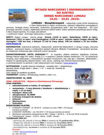 WYJAZD NARCIARSKI I SNOWBOARDOWY DO AUSTRII OKRĘG NARCIARSKI LUNGAU 16.01 - 24.01 .2015r. LUNGAU - Biosphärenpark - najbardziej czysta strefa ekologiczna w Ziemi Salzburskiej to region urozmaicony, zadowoli najbardziej wymagających narciarzy. Rozległe tereny narciarskie, znakomicie przygotowane stoki i sieć tras biegowych - oto czym przyciąga narciarzy Lungau, najbardziej słoneczna kotlina Austrii. Dobre położenie gwarantuje pewny śnieg, a łatwy dojazd sprawia, że Lungau jest jednym z ulubionych miejsc zimowego odpoczynku w Austrii. NARTY: Region Lungau tworzą okręgi Aineck /2210 m npm/, Katschberg /2020 m npm/, Speiereck /2411 m npm/ oraz Fanningberg /2150 m npm/. Łącznie region Lungau oferuje 58 wyciągów i 250 km tras, z których 72 km to trasy łatwe, 140 km średnie a 32 km trudne. www.lungau.at RAMINGSTEIN malowniczo położona miejscowość pośród Alp Salzburskich, w okręgu Lungau, otoczona jodłowo - sosnowymi lasami, o znakomitym górskim klimacie. Bliskość 4 kompleksów narciarskich sprawia, że miasteczko funkcjonuje jako znakomity kurort narciarski. ZAKWATEROWANIE: HOTEL DURIGON*** to wygodny, pięknie położony zabytkowy budynek, którego historia sięga XIV wieku. Pokoje 2,3 i 4 osobowe z pełnym węzłem sanitarnym i TV. Do dyspozycji: recepcja, dwie restauracje z nowoczesnym sprzetem muzycznym, bar, sala gier z bilardem, piłkarzykami , miejsce na ognisko/grilla, depozyt butów i nart, sauna , parking oraz Internet bezprzewodowy w pomieszczeniach na parterze ( sale restauracyjne oraz recepcja ) www.durigon.at WYŻYWIENIE: 3 posiłki dziennie /śniadanie - szwedzki stół + obiadokolacja pierwsze danie, drugie danie + deser / + LP + woda lub herbata do obiadokolacji. Inne napoje do posiłków są płatne. TRANSPORT: autokar z klimatyzacją, barkiem, video i wc. UBEZPIECZENIE: KL, NNW CENA: 1599,00 PLN – Wyjazd ze Stanisławowa Pierwszego CENA ZAWIERA : zakwaterowanie w hotelu /6 noclegów/ wyżywienie – 3 razy dziennie ( śniadanie + obiadokolacja + napój + LP na stok) transport Klasy LUX ubezpieczenie KL,NNW 6 dniowy transport do stoków Internet Wychowawcy Instruktor DODATKOWO PŁATNE: 6 DNIOWY KARNET ok. 92,00 € - urodzeni po roku 1999 + 5 € kaucja zwrotna za karnet 6 DNIOWY DOROŚLI – ok.183,00 € + 5 € kaucja zwrotna za karnet Możliwośċ wykupienia ubezpieczenia SKI + bagaż + 30,00 zl. – 6 dni lub 35,00 zł.dorośli. Fakultatywnie : basen – 5,00 € - dzieci , 6,80€ - dorośli TERMINARZ WPŁAT: - pierwszej raty zaliczki w kwocie 500zł w terminie do 31 października 2014r., - drugiej raty zaliczki w kwocie 500zł w terminie do 14 grudnia 2014r., - trzeciej raty zaliczki w kwocie 599zł w terminie do 10 stycznia 2015r., - pozostałej kwoty na karnet w terminie do 15 stycznia 2015r. Kontakt: e-mail- [email protected] tel. 502 345 658