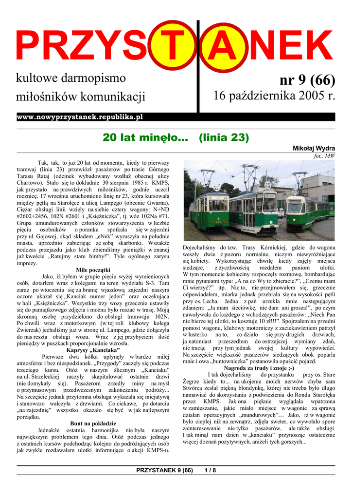 PRZYS T A NEK kultowe darmopismo miłośników komunikacji miejskiej www.nowyprzystanek.republika.pl nr 9 (66) 16 października 2005 r. ISSN 1730-6388 20 lat minęło... (linia 23) Mikołaj Wydra fot.: MW Tak, tak, to już 20 lat od momentu, kiedy to pierwszy tramwaj (linia 23) przewiózł pasażerów po trasie Górnego Tarasu Rataj (odcinek wybudowany wzdłuż obecnej ulicy Chartowo). Stało się to dokładnie 30 sierpnia 1985 r. KMPS, jak przystało na prawdziwych miłośników, godnie uczcił rocznicę. 17 września uruchomiono linię nr 23, która kursowała między pętlą na Starołęce a ulicą Lampego (obecnie Gwarna). Ciężar obsługi linii wzięły na siebie cztery wagony: N+ND #2602+2456, 102N #2601 i „Księżniczka”, tj. wóz 102Na #71. Grupa umundurowanych członków stowarzyszenia w liczbie pięciu osobników o poranku spotkała się w zajezdni przy ul. Gajowej, skąd składem „eNek” wyruszyła na południe miasta, uprzednio zabierając ze sobą skarbonki. Wszakże podczas przejazdu jako klub zbieraliśmy pieniążki w znanej już kweście „Ratujmy stare bimby!”. Tyle ogólnego zarysu imprezy. Miłe początki Jako, iż byłem w grupie pięciu wyżej wymienionych osób, dotarłem wraz z kolegami na teren wydziału S-3. Tam zaraz po wtoczeniu się za bramę wjazdową zajezdni naszym oczom ukazał się „Kanciak numer jeden” oraz oczekująca w hali „Księżniczka”. Wszystkie trzy wozy grzecznie ustawiły się do pamiątkowego zdjęcia i można było ruszać w trasę. Moją skromną osobę przydzielono do obsługi tramwaju 102N. Po chwili wraz z motorkowym (w tej roli klubowy kolega Zwierzak) jechaliśmy już w stronę ul. Lampego, gdzie dołączyła do nas reszta obsługi wozu. Wraz z jej przybyciem ilość pieniędzy w puszkach proporcjonalnie wzrosła. Kaprysy „Kanciaka” Pierwsze dwa kółka upłynęły w bardzo miłej atmosferze i bez niespodzianek. „Przygody” zaczęły się podczas trzeciego kursu. Otóż w naszym ślicznym „Kanciaku” na ul. Strzeleckiej raczyły skapitulować ostatnie drzwi (nie domykały się). Pasażerom zrzedły miny na myśl o przymusowym przedwczesnym zakończeniu podróży... Na szczęście jednak przytomna obsługa wykazała się inicjatywą i stanowczo walczyła z drzwiami. Co ciekawe, po dotarciu „na zajezdnię” wszystko okazało się być w jak najlepszym porządku. Bunt na pokładzie Jednakże ostatnia harmonijka nie była naszym największym problemem tego dnia. Otóż podczas jednego z ostatnich kursów podchodząc kolejno do podróżujących osób jak zwykle rozdawałem ulotki informujące o akcji KMPS-u. Dojechaliśmy do tzw. Trasy Kórnickiej, gdzie do wagonu weszły dwie z pozoru normalne, niczym niewyróżniające się kobiety. Wykorzystując chwilę kiedy zajęły miejsca siedzące, z życzliwością rozdałem paniom ulotki. W tym momencie kobieciny rozpoczęły rozmowę, bombardując mnie pytaniami typu: „A na co Wy to zbieracie?”, „Czemu mam Ci wierzyć?” itp. Nic to, nie przejmowałem się, grzecznie odpowiadałem, miarka jednak przebrała się na wysokości pętli przy os. Lecha. Jedna z pań urzekła mnie następującym zdaniem: „Ja mam sieciówkę, nie dam ani grosza!”, po czym nawoływała do każdego z wchodzących pasażerów: „Niech Pan nie bierze tej ulotki, to kosztuje 10 zł!!!”. Spojrzałem na przedni pomost wagonu, klubowy motorniczy z zaciekawieniem patrzył w lusterko na to, co działo się przy drugich drzwiach, ja natomiast przeszedłem do ostrzejszej wymiany zdań, nie tracąc przy tym jednak swojej kultury wypowiedzi. Na szczęście większość pasażerów siedzących obok poparła mnie i owa „buntowniczka” postanowiła opuścić pojazd. Nagroda za trudy i znoje ;-) I tak dojechaliśmy do przystanku przy os. Stare Żegrze kiedy to... na ukojenie moich nerwów chyba sam Stwórca zesłał piękną blondynkę, której nie trzeba było długo namawiać do skorzystania z podwiezienia do Ronda Starołęka przez KMPS. Jak ona pięknie wyglądała wpatrzona w zamieszanie, jakie miało miejsce w wagonie za sprawą działań operacyjnych „mundurowych”… Jako, iż w wagonie było cieplej niż na zewnątrz, zdjęła sweter, co wywołało spore zainteresowanie nie tylko pasażerów, ale także obsługi. I tak minął nam dzień w „kanciaku” przynosząc ostatecznie więcej doznań pozytywnych, aniżeli tych gorszych... PRZYSTANEK 9 (66) 1/8 Wybory 085 Dokonując wyborów, zazwyczaj liczymy się z ich konsekwencjami. I tak, wybierając !@#$%^ na kaczych nogach, niziołków, łotrów, liczymy się z brakiem szansy na jakiekolwiek zmiany przez najbliższy czas. Wybierając – lub pozwalając wybrać – złą drogę, ponosimy konsekwencje wyboru – czasem niekoniecznie własnego. Jeżeli nikt nie wybiera za nas, winni ewentualnych dysproporcji między plusami a minusami jesteśmy my sami. Wybierając na miejsce zamieszkania podpoznańską wieś, lub chociażby osiedle o charakterze wiejskim, położone za wylotowymi liniami kolejowymi, możemy spodziewać się ciszy, spokoju i dostojnego muczenia krów o poranku. Wybierając życie w mieście – w pakiecie dostaniemy knajpy, kina tudzież inną infrastrukturę wspaniałą o dwa kroki od domu, dogodną komunikację we wszystkich kierunkach... oraz, co oczywiste, zapachy z knajp, tłumy z kin, tupanie na blachach od wsypów węgla i środki transportu wszelakie: piszczące, dymiące lub strzelające luzownikami tuż pod oknem. Grupce mieszkańców osiedla Polanka, którzy nabyli mieszkania kilkadziesiąt metrów od trasy kórnickiej, tramwaj przeszkadza tak bardzo, że niektórzy z nich, zależnie od temperamentu – śląc listy i awanturując się w cyberprzestrzeni – domagają się bądź to ograniczeń w ruchu, bądź to zamknięcia tej trasy. Gdzie leży problem? Czy w nadwrażliwości słuchu co poniektórych, czy w złośliwości motorniczych? Czy doszło do uchybień ze strony MPK? A może mieszkańców sza