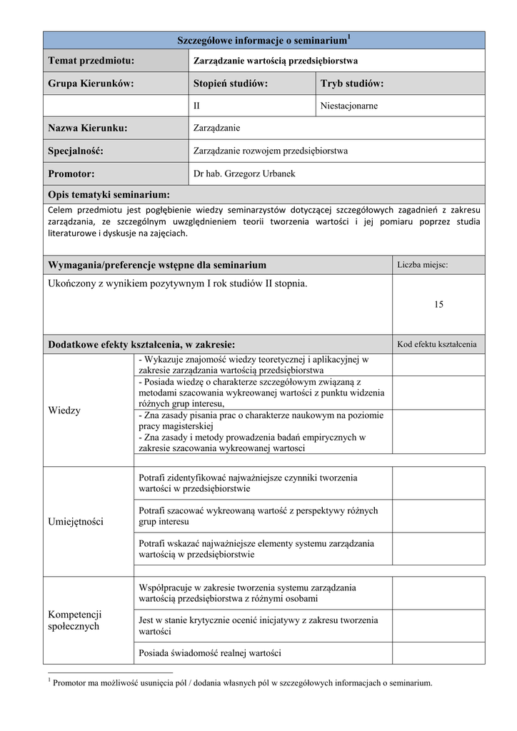 Szczegółowe informacje o seminarium1 Temat przedmiotu: Zarządzanie wartością przedsiębiorstwa Grupa Kierunków: Stopień studiów: Tryb studiów: II Niestacjonarne Nazwa Kierunku: Zarządzanie Specjalność: Zarządzanie rozwojem przedsiębiorstwa Promotor: Dr hab. Grzegorz Urbanek Opis tematyki seminarium: Celem przedmiotu jest pogłębienie wiedzy seminarzystów dotyczącej szczegółowych zagadnień z zakresu zarządzania, ze szczególnym uwzględnieniem teorii tworzenia wartości i jej pomiaru poprzez studia literaturowe i dyskusje na zajęciach. Wymagania/preferencje wstępne dla seminarium Liczba miejsc: Ukończony z wynikiem pozytywnym I rok studiów II stopnia. 15 Dodatkowe efekty kształcenia, w zakresie: Wiedzy Kod efektu kształcenia - Wykazuje znajomość wiedzy teoretycznej i aplikacyjnej w zakresie zarządzania wartością przedsiębiorstwa - Posiada wiedzę o charakterze szczegółowym związaną z metodami szacowania wykreowanej wartości z punktu widzenia różnych grup interesu, - Zna zasady pisania prac o charakterze naukowym na poziomie pracy magisterskiej - Zna zasady i metody prowadzenia badań empirycznych w zakresie szacowania wykreowanej wartosci Potrafi zidentyfikować najważniejsze czynniki tworzenia wartości w przedsiębiorstwie Umiejętności Potrafi szacować wykreowaną wartość z perspektywy różnych grup interesu Potrafi wskazać najważniejsze elementy systemu zarządzania wartością w przedsiębiorstwie Współpracuje w zakresie tworzenia systemu zarządzania wartością przedsiębiorstwa z różnymi osobami Kompetencji społecznych Jest w stanie krytycznie ocenić inicjatywy z zakresu tworzenia wartości Posiada świadomość realnej wartości 1 Promotor ma możliwość usunięcia pól / dodania własnych pól w szczegółowych informacjach o seminarium. Szczegółowy opis przedmiotu: Treści programowe (tematy/problemy zajęć): L.g. dyd 32 Ogólne zasady pisania pracy magisterskiej Formułowanie celów pracy i hipotez badawczych Sposoby korzystania ze źródeł literaturowych Źródła danych empirycznych do pracy magisterskiej Istota wartości Wpływ relacji pomiędzy zwrotem na zaangażowanym kapitale (ROIC), kosztem kapitału (wacc) i stopą wzrostu (g) na wartość przedsiębiorstwa Metody szacowania kosztu kapitału przedsiębiorstwa • Koszt kapitału własnego • Koszt kapitału obcego • Średni ważony koszt kapitału Przegląd mierników tworzenia wartości w przedsiębiorstwie • Perspektywa firmy • Perspektywa akcjonariuszy (właścicieli) Składniki systemu zarządzania wartością w przedsiębiorstwie Dodatkowa literatura: Obowiązkowa: • A. Rappaport, Wartość dla akcjonariuszy, WIG-Press, Warszawa, 1999. • A. Szablewski, K. Pniewski, B. Bartoszewicz (red.), Value Based Management – koncepcje, narzędzia, przykłady, Poltext, Warszawa, 2008. • A. Cwynar, P. Dżurak (red.), Systemy VBM i zysk ekonomiczny, Poltext, Warszawa, 2010. • T. Dudycz, Zarzadzanie wartością przedsiębiorstwa, PWE, Warszawa, 2005. Zalecana: • Koller T., R. Dobbs, B. Huyett, Value. The Four Cornerstones of Corporate Finance, Wiley, Hoboken 2011. • Koller T., M. Goddard, D. Wessels, Valuation: Measuring and Managing the Value of Companies, Wiley, Hoboken 2005. • Young S.D., EVA and Value-Based Management, McGraw-Hill, New York, 2001. • M. Panfil, A. Szablewski, Wycena przedsiębiorstwa – od teorii do praktyki, Poltext, Warszawa 2011. Sposób obliczania oceny semestralnej / końcowej z przedmiotu (algorytm): Ocena z I semestru seminarium – ocena dst. min. wymogi: przygotowany konspekt pracy, gotowy I rozdział, sformułowane cele pracy i hipotezy badawcze Ocena końcowa z seminarium – złożenie pracy (uzyskana ocena uzależniona jest od jakości złożonej pracy)