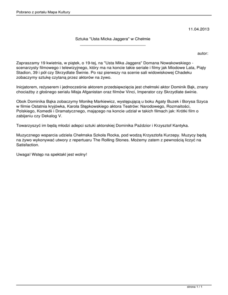 Pobrano z portalu Mapa Kultury 11.04.2013 Sztuka "Usta Micka Jaggera" w Chełmie ____________________________ autor: Zapraszamy 19 kwietnia, w piątek, o 19-tej, na "Usta Mika Jaggera" Domana Nowakowskiego scenarzysty filmowego i telewizyjnego, który ma na koncie takie seriale i filmy jak Miodowe Lata, Piąty Stadion, 39 i pół czy Skrzydlate Świnie. Po raz pierwszy na scenie sali widowiskowej Chadeku zobaczymy sztukę czytaną przez aktorów na żywo. Inicjatorem, reżyserem i jednocześnie aktorem przedsięwzięcia jest chełmski aktor Dominik Bąk, znany chociażby z głośnego serialu Misja Afganistan oraz filmów Vinci, Imperator czy Skrzydlate świnie. Obok Dominika Bąka zobaczymy Monikę Markiewicz, występującą u boku Agaty Buzek i Borysa Szyca w filmie Ostatnia kryjówka, Karola Stępkowskiego aktora Teatrów: Narodowego, Rozmaitości, Polskiego, Komedii i Dramatycznego, mającego na koncie udział w takich filmach jak: Krótki film o zabijaniu czy Dekalog V. Towarzyszyć im będą młodzi adepci sztuki aktorskiej Dominika Paździor i Krzysztof Kantyka. Muzycznego wsparcia udziela Chełmska Szkoła Rocka, pod wodzą Krzysztofa Kurzepy. Muzycy będą na żywo wykonywać utwory z repertuaru The Rolling Stones. Możemy zatem z pewnością liczyć na Satisfaction. Uwaga! Wstęp na spektakl jest wolny! strona 1 / 1