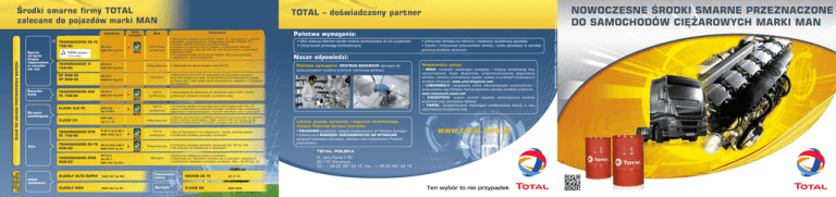 Środki smarne firmy ToTal zalecane do pojazdów marki MaN oleje do układu PrZeNieSieNia NaPędu (2) TraNSMiSSioN XS fe 75W-80 ręczne skrzynie biegów (wyposażone w retarder lub nie) MaN 341 Typ Z-5 TraNSMiSSioN Ti 75W-80 eP 80W-85 eP 80W-90 retarder Voith Skrzynie automatyczne PłYNY do ZaSToSoWań SPeCjalNYCH MaN 341 Typ e-3 aPi Gl-4 MaN 341 Typ Z-2 Technologia syntetyczna • Opracowany specjalnie do skrzyń biegów ZF pracujących w ciężkich warunkach, wyposażonych w zintegrowany retarder (Intarder ZF), w których warunki termiczne są najtrudniejsze. • Zalecany do ręcznych skrzyń biegów z wydłużonymi okresami pomiędzy wymianą oleju (do 300 tys. km) montowanych w pojazdach użytkowych MAN. • Szczególnie nadaje się do skrzyń biegów najnowszej generacji z „węglowymi” synchronizatorami. Półsyntetyczny • Odpowiedni do skrzyń biegów marki EATON. Mineralny MaN 341 Typ V-r 100 % syntetyczny • Zatwierdzony do stosowania do retarderów marki Voith z bardzo wydłużonym okresami pomiędzy wymianami oleju. fluide Xld fe MaN 339 Typ V-2/Z-2 100 % syntetyczny • Szczególnie zalecany do automatycznych skrzyń biegów marki Voith, ZF i Allison z maksymalnymi przebiegami pomiędzy wymianami oleju, stosowanych ciężarówkach wykorzystywanych w trudnych warunkach oraz w autobusach. fluide G3 TraNSMiSSioN rS fe 80W-90 MaN 339 Typ V1 i Z1 Pi Gl-4/ Gl-5/ MT-1 MaN 3343 Typ S aPi Gl-4/Gl-5/MT-1 MaN 3343 Typ M aPi Gl-5 aPi MT-1 Państwa wymagania: • Móc polecać klientom środki smarne dostosowane do ich oczekiwań • Utrzymywać przewagę konkurencyjną • Zatrzymać istniejących klientów i zwiększyć dodatkową sprzedaż • Szkolić i motywować pracowników serwisu i działu sprzedaży w zakresie promocji środków smarnych. Nasze odpowiedzi: Państwa wymagania: CeNTruM BadaWCZe zajmujące się opracowywaniem środków smarnych najnowszej generacji. • Zatwierdzony przez ZF do stosowania we wszystkich ręcznych skrzyniach biegów tej marki, ze standardowymi przebiegami pomiędzy wymianą oleju. • Nie nadaje się do stosowania w połączeniu z intarderem lub retarderem. aPi Gl-4 TraNSMiSSioN XPM 80W-90 układ chłodzenia aPi Gl-4 Zastosowania Skład TraNSMiSSioN XSV fe 75W-80 TraNSMiSSioN SYN fe 75W-90 osie aPi Gl-4 Cechy szczególne Nowatorskie usługi: • aNaC: narzędzie wspierające przeglądy i bieżącą konserwację floty samochodowej, dzięki eksperckiej, zindywidualizowanej diagnostyce silników i układów przeniesienia napędu, opartej na próbkach stosowanych środków smarnych. www.anac-diagnosis.com • luBCoNSulT: zarządzanie online rekomendacjami konstruktorów i producentów oraz Państwa harmonogramem wymiany środków smarnych. www.lubconsult.total.com • ViSioSToCk: system kontroli zapasów (automatyczna kontrola poziomów oraz zamawianie dostaw). • ParCk: oprogramowanie wspierające podejmowanie decyzji w celu optymalizacji zarządzania flotą • Zalecany do wszystkich przekładni automatycznych (automatyczne skrzynie Półsyntetyczny biegów, systemy wspomagania, cięgła i przemienniki momentu) oraz do systemów hydraulicznych, do których wymagany jest olej DEXRON® III. 100 % syntetyczny • Olej do hipoidalnych osi napędowych , bardzo wysokiej jakości. • Wydłużone przebiegi pomiędzy wymianami. Półsyntetyczny • Wydłużone przebiegi pomiędzy wymianami (do 160 tys. km). • Nie polecany do stosowania w intarderach. Mineralny MaN 342 Typ M-3 lokalne zespoły sprzedaży i wsparcia technicznego, znające Państwa bieżące potrzeby: • PoleCaNie produktów najlepiej dopasowanych do Państwa wymagań • Dostarczanie NarZędZi doPaSoWaNYCH do WYMaGań służących wspieraniu sprzedaży, szkoleniu oraz motywowaniu Państwa pracowników. www.total.com.pl TOTAL POLSKA • Wydłużone odstępy pomiędzy wymianami. • Odpowiedni do wszystkich rodzajów osi w pojazdach ciężarowych z wydłużonymi odstępami pomiędzy wymianami oleju – do 240 tys. km. GlaCelf auTo SuPra MaN 324 Typ SNf Podnoszenie kabiny eQuiViS ZS 15 HV lP 15 GlaCelf MdX MaN 324 Typ Nf Sprzęgło fluide da MaN 3289 Al. Jana Pawła II 80 00-175 Warszawa Tel.: + 48 22 481 94 15, Fax.: + 48 22 481 94 16 Ten wybór to nie przypadek Wd CoMMuNiCaTioN - update of 02/2012 - Photos credit : MaN, Total Specyfikacje ToTal – doświadczony partner NoWoCZeSNe Środki SMarNe PrZeZNaCZoNe do SaMoCHodÓW CięŻaroWYCH Marki MaN ToTal – innowacyjny partner W roku 1990 unia europejska wprowadziła normy euro, które wyznaczają maksymalny dopuszczalny poziom emisji szkodliwych substancji spalinach generowanych przez samochody ciężarowe o masie przekraczającej 3,5 ton. Norma euro V obowiązuje od października 2009 roku, natomiast norma euro iV wejdzie w życie od stycznia 2014 roku. Środki smarne firmy ToTal zalecane do pojazdów marki MaN Spełnić coraz ostrzejsze wymagania najnowszych norm EURO poprzez redukcję zawartości cząsteczek stałych oraz tlenków azotu w spalinach. Zapewnić czystość różnych części silnika na poziomie przekraczającym wymagania MAN poprzez zaoferowanie produktów wykorzystujących nowoczesne technologie. Strategia MaN: odPoWiedZi ToTal podwójna technologia Technologia low SaPS opracowana przez ToTal odPoWiedZi Technologia eGr + PM kaT®* (recykling gazów spalinowych) Zalecana do silników D20/D26 zgodnych z normą Euro 4 oraz D08 zgodnych z normą Euro 5 (serie TGM i TGL). Stosowana w celu obniżenia temperatury spalania, przez co zmniejsza się ilość tlenków azotu (NOx) w spalinach. * Filtr cząstek stałych do silnika Diesla. Służy do zmniejszania ilości cząstek stałych w spalinach. Zawór EGR do silnika D26 Schemat działania PM -KAT® SCr (Selektywna redukcja katalityczna) System, który poprzez wtrysk dodatku AdBlue® w układzie wydechowym umożliwia konwersję szkodliwych spalin, takich jak tlenki azotu (NOx), na produkty nieszkodliwe (azot i para wodna). Przykład dotyczący oleju RUBIA TIR 8900 FE 10W-30 Zaw