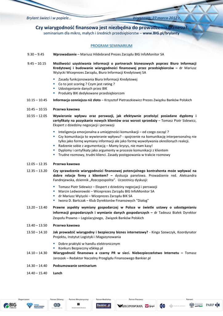 Brylant świeci i w popiele… Warszawa, 27 marca 2012 r. Czy wiarygodność finansowa jest niezbędna do prowadzenia biznesu? seminarium dla mikro, małych i średnich przedsiębiorstw – www.BIG.pl/brylanty PROGRAM SEMINARIUM 9.30 – 9.45 Wprowadzenie – Mariusz Hildebrand Prezes Zarządu BIG InfoMonitor SA 9.45 – 10.15 Możliwości uzyskiwania informacji o partnerach biznesowych poprzez Biuro Informacji Kredytowej i budowanie wiarygodności finansowej przez przedsiębiorców – dr Mariusz Wyżycki Wiceprezes Zarządu, Biuro Informacji Kredytowej SA Zasady funkcjonowania Biura Informacji Kredytowej Co to jest scoring ? Czym jest rating ? Udostępnianie danych przez BIK Produkty BIK dedykowane przedsiębiorcom 10.15 – 10.45 Informacja cenniejsza niż złoto – Krzysztof Pietraszkiewicz Prezes Związku Banków Polskich 10.45 – 10.55 Przerwa kawowa 10.55 – 12.05 Wywieranie wpływu oraz perswazji, jak efektywnie przełożyć posiadane dyplomy i certyfikaty na pozyskanie nowych klientów oraz wzrost sprzedaży – Tomasz Piotr Sidewicz, Ekspert z dziedziny negocjacji i perswazji Inteligencja emocjonalna a umiejętności komunikacji – od czego zacząć ? Czy komunikacja to wywieranie wpływu? - spojrzenie na komunikację interpersonalną nie tylko jako formę wymiany informacji ale jako formę wywoływania określonych reakcji. Radzenie sobie z argumentacją – Mamy kryzys, nie mam kasy! Dyplomy i certyfikaty jako argumenty w procesie komunikacji z klientem Trudne rozmowy, trudni klienci. Zasady postępowania w trakcie rozmowy 12.05 – 12.35 Przerwa kawowa 12.35 – 13.20 Czy sprawdzenie wiarygodności finansowej potencjalnego kontrahenta może wpływać na dobre relacje firmy z klientem? – dyskusja panelowa. Prowadzenie red. Aleksandra Fandrejewska, dziennik „Rzeczpospolita”. Uczestnicy dyskusji: Tomasz Piotr Sidewicz – Ekspert z dziedziny negocjacji i perswazji Marcin Ledworowski – Wiceprezes Zarządu BIG InfoMonitor SA dr Mariusz Wyżycki – Wiceprezes Zarządu BIK SA Iwona D. Bartczak – Klub Dyrektorów Finansowych "Dialog" 13.20 – 13.40 Prawne aspekty wymiany gospodarczej w Polsce w świetle ustawy o udostępnianiu informacji gospodarczych i wymianie danych gospodarczych – dr Tadeusz Białek Dyrektor Zespołu Prawno – Legislacyjnego, Związek Banków Polskich 13.40 – 13.50 Przerwa kawowa 13.50 – 14.10 Jak prowadzić wiarygodny i bezpieczny biznes internetowy? - Kinga Szewczyk, Koordynator Projektu, Instytut Logistyki i Magazynowania 14.10 – 14.30 Dobre praktyki w handlu elektronicznym Konkurs Bezpieczny eSklep.pl Wiarygodność finansowa a czarny PR w sieci. Niebezpieczeństwo Internetu – Tomasz Jaroszek – Redaktor Naczelny Przeglądu Finansowego Bankier.pl 14.30 – 14.40 Podsumowanie seminarium 14.40 – 15.40 Lunch