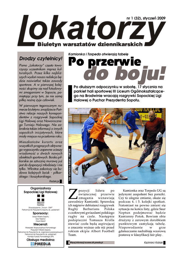 18 paŸdziernika 2008 roku Gdañsk nr 1 (32), styczeñ 2009 Biuletyn festiwalowy przygotowany podczas warsztatów dziennikarskich, nr 2(16), Nak³ad: 50 egz. Drodzy czytelnicy! Pismo „Lokatorzy” czêsto towarzyszy uczestnikom imprez kulturalnych. Przez kilka najbli¿szych wydañ nasza redakcja bêdzie naœwietlaæ tak¿e zawody sportowe. A w pierwszej kolejnoœci skupimy siê nad futsalowymi zmaganiami w Sopocie, pamiêtaj¹c przy tym, ¿e nie sam¹ pi³k¹ no¿n¹ ¿yje cz³owiek. Kamionka i Torpedo otwieraj¹ tabelê Po przerwie do boju! Po d³u¿szym odpoczynku w sobotê, 17 stycznia na parkiet hali sportowej III Liceum Ogólnokszta³c¹cego na Brodwinie wracaj¹ rozgrywki Sopockiej Ligi Halowej o Puchar Prezydenta Sopotu. Mieszkañców kurortu oraz wszystkich pragn¹cych aktywnego wypoczynku zapewne ucieszy wiadomoœæ o dwóch nowych obiektach sportowych. Boisko pi³karskie ze sztuczn¹ muraw¹ ju¿ jest do dyspozycji m³odzie¿y i nie tylko. Wkrótce zakoñczy siê budowa kolejnych boisk - pi³karskiego i koszykarskiego. Redakcja Organizatorzy Sopockiej Ligi Halowej: Stowarzyszenie „Trivium - EWP” Pe³nomocnik Prezydenta Sopotu ds. uzale¿nieñ Sponsorzy: Urz¹d Miasta Sopotu Saur Neptun Aqua-Sopot Mecenat: Marsza³ek Województwa Pomorskiego Prezydent Miasta Sopotu Pe³nomocnik Prezydenta ds. organizacji pozarz¹dowych Pe³nomocnik Prezydenta ds. uzale¿nieñ Komisja Futsalu Pomorskiego ZPN foto: Kazimierz Kobiak / PMEDIA W pierwszym tegorocznym numerze biuletynu znajdziecie Pañstwo relacje naszych korespondentów z rozgrywek Sopockiej Ligi Halowej oraz Noworocznego Turnieju Halowego. Nie zabraknie tak¿e informacji o innych sopockich inicjatywach, które mia³y miejsce na prze³omie roku. Z pozycji lidera po œwi¹tecznej przerwie zmagania wznawiaj¹ zawodnicy Kamionki. Sprawdz¹ ich najpierw debiutanci rozgrywek Rugby Barbarians Polska z czo³owymi gwiazdami polskiego rugby na czele. Nastêpnie podopieczni Tomasza Krolla stawiaæ czo³a bêd¹ aspiruj¹cej o znacznie wy¿sze cele ni¿ przed rokiem ekipie Albert Football Team. Obs³uga medialna: Więcej informacji na www.slh.pmedia.pl Kamionka oraz Torpedo UG s¹ jedynymi zespo³ami bez pora¿ki. Czy to ulegnie zmianie, oka¿e siê podczas 4. i 5. kolejki spotkañ. Natomiast na pewno zmieni siê sytuacja na koñcu listy, gdzie Saur Neptun podejmowaæ bêdzie Kamienny Potok. Bowiem obie dru¿yny z zerowym dorobkiem punktowym zamykaj¹ tabelê. Niepowodzenie w grze gdañszczanie nadrabiaj¹ wzorow¹ postaw¹ w klasyfikacji fair play. Kazimierz Kobiak nr 1(32) Sopocka Liga Halowa im. Paw³a Orliñskiego 2008/2009 Zmiana lidera Tylko przez dwie kolejki spotkañ na pozycji lidera tabeli Sopockiej Ligi Halowej utrzyma³ siê zespó³ Rugby Barbarians Polska. Po pora¿ce z Samsonem beniaminek ligi spad³ na czwarte miejsce. P otkniêcie „Barbarzyñców” wykorzystali pi³karze Kamionki, którzy stoczyli zaciêt¹ walkê z Karlikowo 3:2 i Oldboys 5:4. Na drugie miejsce w tabeli awansowa³o Torpedo UG, które po wymêczeniu 1:0 z przedostatni¹ dru¿yn¹ w tabeli Alfa PMedia, pokona³o nastêpnie g³adko Saur Neptun 6:2. Dwa zwyciêstwa po ostatniej w 2008 roku serii zanotowali na swoim koncie tak¿e zawodnicy Albert Football Team. Podopieczni Tomasza Maruszaka pewnie poradzili z chaotycznie prezentuj¹c¹ siê ofensyw¹ Saura Neptun 5:1, a póŸniej zdominowali pojedynek z Kamiennym Potokiem 8:2. W trakcie rywalizacji zosta³y wrêczone nagrody indywidualne. Tym razem zdobyli je: Filip Szukalski z Karlikowa za naj³adniejsz¹ bramkê w meczu z Kamionk¹ oraz Cezary Wójcik z Alfy PMedia za grê w defensywie. Pomocnik bordowych zaj¹³ miejsce usuniêtego za czerwony kartonik golkipera i do koñca meczu - przez 14 min - wybroni³ wszystkie groŸne sytuacje a jego Alfa zdo³a³a zaliczyæ trzy trafienia doprowadzaj¹c do remisu 4:4 z Karlikowo. Nagrody specjalne ufundowane przez pe³nomocnika prezydenta Sopotu ds. organizacji pozarz¹dowych Andrzeja Kowalczysa przyznawane s¹ co sobotê podczas rozgrywek. Przypomnijmy, ¿e na inauguracji z pi³ki i rêkawic bramkarskich cieszyli siê odpowiednio - Karol Czorniej z Torpedo i Andrzej Gajewski z Alberta. Kazimierz Kobiak 2 foto: Kazimierz Kobiak / PMEDIA Wyniki 2. i 3. kolejki spotkań SLH: Tabela SLH: Torpedo UG - Alfa Pmedia 1:0 (1:0): Łukasz Szprengel. Kamionka - Karlikowo 3:2 (2:0): Remigiusz Smętek, Andrzej Płotka, Tomasz Kroll - Filip Szukalski, Łukasz Truskowski. Torpedo UG - Saur Neptun 6:2 (4:1): Jarosław Karwowski 2, Łukasz Szprengel, Łukasz Sapielak, Yauheni Adamonis, Robert Piżewski - Rafał Żol 2. Alfa Pmedia - Karlikowo 4:4 (1:4): Tomasz Kulczyński 2, Piotr Marcinkowski, Grzegorz Pawłowski - Filip Szukalski 2, Łukasz Sadowski, Tomasz Ninca. Kamionka - Oldboys 5:4 (4:1): Andrzej Płotka 2, Sebastian Sikorski, Remigiusz Smętek, Mieczysław Załuski - Rafał Wróblewski, Dariusz Bromboszcz, Marcin Malak, Krzysztof Kowalski. Albert FT - Saur Neptun 5:1 (3:1): Daniel Kupis, Rafał Kamper, Dawid Kołaczkowski, Dominik Machniewicz, Krzysztof Dejko - Rafał Żol. Barbarians - Kamienny Potok 5:2 (2:0): Rafał Sendal 2, Piotr Kubiszewski, Krzysztof Bułka, Dawid Partika - Michał Mąka, Marek Regliński. Samson - Oldboys 0:2 (0:0): Rafał Wróblewski, Tomasz Świtała. Albert FT - Kamienny Potok 8:2 (3:2): Dawid Kołaczkowski 3, Krzysztof Dejko 2, Daniel Kupis, Krzysztof Sielski, Dominik Kwiatkowski - Łukasz Chrustowski, Marek Regliński. Barbarians - Samson 3:4 (1:4): Krzysztof Woźniak, Sylwester Hodura, Robert Królikowski - Maciej Milewski 2, Sebastian Wilk 2. (mecze, zwycięstwa-remisy-porażki, bramki, punkty) Klasyfikacja strzelców: Remigiusz Smętek (Kamionka) 5, Dawid Kołaczkowski (Albert) 4, Łukasz Chrustowski (Kam.Potok) 4, Rafał Wróblewski (Oldboys) 4. 1. Kamionka Sopot 2. Torpedo Uniwersytet Gdański 3. Albert Football Team Gdańsk 4. Rugby Barbarians Polska 5. Oldboys Sopot 6. PTS Samson Sopot 7. PDP Karlikowo Sopot 8. Alfa PMedia Sopot 9. Kami