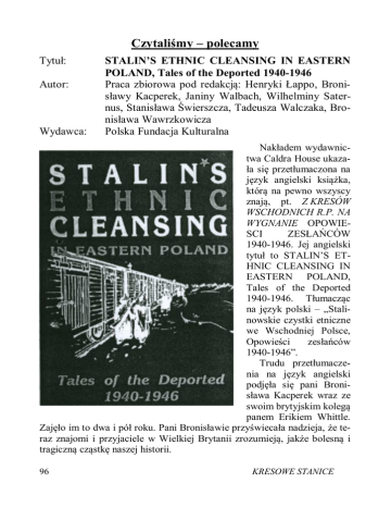 Czytaliśmy – polecamy Tytuł: Autor: Wydawca: STALIN’S ETHNIC CLEANSING IN EASTERN POLAND, Tales of the Deported 1940-1946 Praca zbiorowa pod redakcją: Henryki Łappo, Bronisławy Kacperek, Janiny Walbach, Wilhelminy Saternus, Stanisława Świerszcza, Tadeusza Walczaka, Bronisława Wawrzkowicza Polska Fundacja Kulturalna Nakładem wydawnictwa Caldra House ukazała się przetłumaczona na język angielski książka, którą na pewno wszyscy znają, pt. Z KRESÓW WSCHODNICH R.P. NA WYGNANIE OPOWIESCI ZESŁAŃCÓW 1940-1946. Jej angielski tytuł to STALIN’S ETHNIC CLEANSING IN EASTERN POLAND, Tales of the Deported 1940-1946. Tłumacząc na język polski – „Stalinowskie czystki etniczne we Wschodniej Polsce, Opowieści zesłańców 1940-1946”. Trudu przetłumaczenia na język angielski podjęła się pani Bronisława Kacperek wraz ze swoim brytyjskim kolegą panem Erikiem Whittle. Zajęło im to dwa i pół roku. Pani Bronisławie przyświecała nadzieja, że teraz znajomi i przyjaciele w Wielkiej Brytanii zrozumieją, jakże bolesną i tragiczną cząstkę naszej historii. 96 KRESOWE STANICE Po ukazaniu się książki rozdzwoniły się telefony z pytaniami. Tak jak przypuszczali autorzy, wielu Brytyjczyków nie wiedziało o tym, co przeżyli Polacy w czasie wojny, czasem nawet trudno im było w to uwierzyć. Zachęcamy wszystkich Polaków zamieszkujących w anglojęzycznych rejonach świata do zakupienia tej książki i udostępnienia jej swoim dzieciom, przyjaciołom i znajomym. Zamówienia można składać w: Polish Cultural Foundation 23 Coleridge St., Hove, Sussex BN3 5AB England Janusz Szuba Tytuł: POEZJA SYBIRACKA Autorzy: Praca zbiorowa Wydawnictwo: Oficyna Drukarska, 01-142 Warszawa, ul.Sokołowska 12a Tel. (022) 632-83-52 Kolportaż: p. Stanisława Terlikowska, Oddział Warszawski Związku Sybiraków, 00-844 Warszawa, ul. Grzybowska 77, tel. (022) 620-12-61 wew. 351 Antologia POEZJI SYBIRACKIEJ wydana została dla uczczenia 10 rocznicy reaktywowania Związku Sybiraków, a zawarte w niej wiersze, aż 100 autorów, gromadziła i segregowała Komisja HistorycznoKulturalna Warszawskiego Oddziału Związku Sybiraków. Wyboru i układu wierszy w dziesięciu tematycznych blokach dokonała przewodnicząca tejże komisji – Danuta Kominiak, a we wstępie napisała: „Wszystkie one (...) mają wartość historyczną. W większym stopniu, niż dokumenty odzwierciedlają los KRESOWE STANICE 97 zesłańców, Polską Golgotę Wschodu: codzienne życie, tragedie osobiste, stosunki międzyludzkie.” Zesłańcy pisali je przede wszystkim dla siebie, powierzali skrawkom papieru swoje najszczersze skrywane uczucia, swoją rozpacz, strach i tęsknotę, swoje zwątpienia i głęboką wiarę, w której szukali ukojenia. „Właściwie nie tracę nadziei i w dobroć Twą wciąż wierzę, Ale tak mi się zdaje, że ktoś po drodze, Wstrzymuje nasze pacierze. Nie gniewaj się za mą śmiałość, Lecz jestem tak niespokojna, Że nigdy się chyba nie skończy Od lat nękająca nas wojna. (...) Mnie pewnie wcale nie słychać, nie płaczę więc, ani wołam, Popatrz tylko na krople płynące z mego czoła. A może tak właśnie trzeba, a może tak właśnie być musi! Skróć mękę mnie niewytrwałej i wróć mię do mojej mamusi!” (Magda Lukas) „Wierzę, że w tej Księdze Poezji Sybirackiej, w niedługim czasie uda się nam zebrać materiał na drugi tom, że pisane dotąd wiersze – tylko do szuflady zostaną nam udostępnione i że przeczytają je ze wzruszeniem i łzą w oku – nie tylko Sybiracy.” - napisała Danuta Kominiak. A ja dodam, że Księga ta powinna znaleźć się na półkach bibliotek domowych i szko1nych, aby kolejne pokolenia mogły czerpać z niej wiedzę o okrucieństwie wojny i heroizmie jej ofiar i żeby nigdy nie zgasły znicze pamięci. Zofia Rosińska 98 KRESOWE STANICE