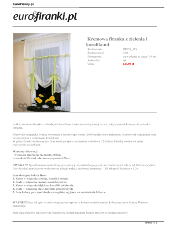 EuroFirany.pl Kremowa firanka z zielenią i koralikami Kod towaru: Średnia ocen: Dostępność: Jednostka: Cena: DF058_MX 0.00 wywysłamy w ciągu 3-5 dni szt. 124.00 zł Lekka, kremowa firanka z ozbodnymi koralikami i wiązaniami tej samej barwy...niby prosta dekoracja, ale jednak z fantazją. Niezwykle elegancka firanka wykonana z kremowego woalu (100% poliester) z zielonymi, woalowymi wiązaniami oraz naszytą taśmą z ozdobnymi koralikami. W górze firanki wykonany jest 5cm tunel pasujący na karnisze o średnicy 12-20mm. Firankę można też upiąć tradycyjnie na żabkach. Wymiary dekoracji: - wysokość mierzona na prosto 150cm, - szerokość firanki mierzona na prosto 120cm UWAGA !!! Sposób marszczenia firany jest sprawą indywidualnego gustu oraz preferencji i zależy od Państwa wyboru. Aby uzyskać marszczenie widoczne na zdjęciu należy zachować proporcje 1.3:1 (długość karnisza x 1.3). Inne dostępne kolory firan: 1. Krem + wiązania zielone, koraliki zielone 2. Biała + wiązania czarne, koraliki czarne 3. Krem + wiązania błękitne, koraliki niebieskie 4. Biała + wiązania białe, koraliki przezroczyste 5. Inne kolory po uzgodnieniu szczegółów szyjemy na zamówienie klienta. WAŻNE!!! Przy zakupie w polu uwagi proszę wpisać, z którym wykończeniem kolorystycznym firankę Państwo zamawiają. Jeśli mają Państwo jakiekolwiek wątpliwości przed zakupem bardzo prosimy o kontakt mailowy. strona 1 / 2 EuroFirany.pl Towar na zamówienie, wysyłamy w ciągu 5-7 dni roboczych. Istnieje możliwość uszycia dekoracji wg. życzeń klienta, przy zamówieniach indywidualnych podana w sklepie cena oraz czas oczekiwania na dekorację mogą ulec zmianie. strona 2 / 2 Powered by TCPDF (www.tcpdf.org)