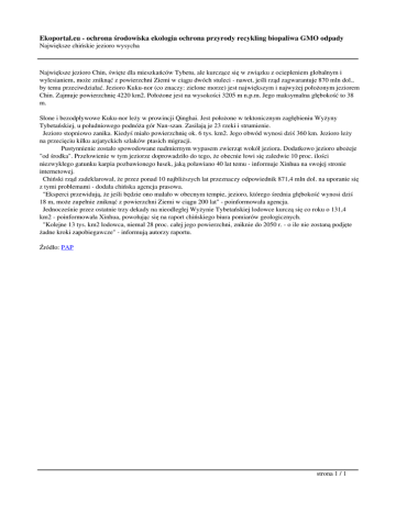 Ekoportal.eu - ochrona środowiska ekologia ochrona przyrody recykling biopaliwa GMO odpady Największe chińskie jezioro wysycha Największe jezioro Chin, święte dla mieszkańców Tybetu, ale kurczące się w związku z ociepleniem globalnym i wylesianiem, może zniknąć z powierzchni Ziemi w ciągu dwóch stuleci - nawet, jeśli rząd zagwarantuje 870 mln dol., by temu przeciwdziałać. Jezioro Kuku-nor (co znaczy: zielone morze) jest największym i najwyżej położonym jeziorem Chin. Zajmuje powierzchnię 4220 km2. Położone jest na wysokości 3205 m n.p.m. Jego maksymalna głębokość to 38 m. Słone i bezodpływowe Kuku-nor leży w prowincji Qinghai. Jest położone w tektonicznym zagłębieniu Wyżyny Tybetańskiej, u południowego podnóża gór Nan-szan. Zasilają je 23 rzeki i strumienie. Jezioro stopniowo zanika. Kiedyś miało powierzchnię ok. 6 tys. km2. Jego obwód wynosi dziś 360 km. Jezioro leży na przecięciu kilku azjatyckich szlaków ptasich migracji. Pustynnienie zostało spowodowane nadmiernym wypasem zwierząt wokół jeziora. Dodatkowo jezioro ubożeje "od środka". Przełowienie w tym jeziorze doprowadziło do tego, że obecnie łowi się zaledwie 10 proc. ilości niezwykłego gatunku karpia pozbawionego łusek, jaką poławiano 40 lat temu - informuje Xinhua na swojej stronie internetowej. Chiński rząd zadeklarował, że przez ponad 10 najbliższych lat przeznaczy odpowiednik 871,4 mln dol. na uporanie się z tymi problemami - dodała chińska agencja prasowa. "Eksperci przewidują, że jeśli będzie ono malało w obecnym tempie, jezioro, którego średnia głębokość wynosi dziś 18 m, może zupełnie zniknąć z powierzchni Ziemi w ciągu 200 lat" - poinformowała agencja. Jednocześnie przez ostatnie trzy dekady na nieodległej Wyżynie Tybetańskiej lodowce kurczą się co roku o 131,4 km2 - poinformowała Xinhua, powołując się na raport chińskiego biura pomiarów geologicznych. "Kolejne 13 tys. km2 lodowca, niemal 28 proc. całej jego powierzchni, zniknie do 2050 r. - o ile nie zostaną podjęte żadne kroki zapobiegawcze" - informują autorzy raportu. Źródło: PAP strona 1 / 1