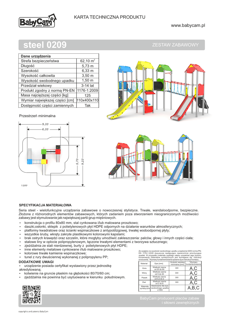 KARTA TECHNICZNA PRODUKTU www.babycam.pl place zabaw steel 0209 ZESTAW ZABAWOWY Dane urządzenia Strefa bezpieczeństwa 62,10 m2 Długość 5,73 m Szerokość 6,33 m 3,50 m Wysokość całkowita 1,50 m Wysokość swobodnego upadku 3-14 lat Przedział wiekowy Produkt zgodny z normą PN-EN 1176-1:2009 Masa najcięższej części [kg] 125 Wymiar największej części [cm] 110x400x110 Dostępność części zamiennych Tak Przestrzeń minimalna 9,33 9,23 5,73 6,33 1:200 SPECYFIKACJA MATERIAŁOWA Seria steel - wielofunkcyjne urządzenia zabawowe o nowoczesnej stylistyce. Trwałe, wandaloodporne, bezpieczne. Złożone z różnorodnych elementów zabawowych, których zadaniem poza stworzeniem nieograniczonych możliwości zabawy jest stymulowanie jak największej partii grup mięśniowych. ź konstrukcja o profilu 80x80 mm, stal cynkowana i/lub malowana proszkowo; ź daszki,osłonki, sklepik z polietylenowych płyt HDPE odpornych na działanie warunków atmosferycznych; ź platformy kwadratowe oraz ścianki wspinaczkowe z antypoślizgowej, trwałej wodoodpornej płyty; ź wszystkie śruby, wkręty zakryte plastikowymi kolorowymi kapslami; ź brak ostrych krawędzi oraz szczelin, które mogłyby umożliwić zakleszczenia: palców, głowy i innych części ciała; ź stalowe liny w oplocie polipropylenowym, łączone trwałymi elementami z tworzywa sztucznego; ź zjeżdżalnia ze stali nierdzewnej, burty z polietylenowych płyt HDPE; ź inne elementy metalowe cynkowane i/lub malowane proszkowo; Ze względu na wysokość swobodnego upadku urządzenia 0209 norma PNEN 1176-1:2009 dopuszcza następujące nawierzchnie amortyzujące ź kolorowe trwałe kamienie wspinaczkowe; upadek. W przypadku materiału sypkiego należy uzupełniać jego poziom, konserwacja materiałów syntetycznych jest wymagana wg. instrukcji ź tunel z rury dwuściennej wykonanej z polipropylenu PP; producenta. *Wymiary fundamentowania opisane są w instrukcji montażu; *Wymiary Grubość warstwy DODATKOWE UWAGI Opis [mm] Materiał minimalna [mm] fundamentowania ź urządzenie posiada certyfikat wystawiony przez jednostkę Wielkość ziarna 300 Kora A,C od 20 do 80 akredytowaną; Wielkość ziarna 300 Wióry ź kotwienie na gruncie płaskim na głębokości 80/70/60 cm; A,C od 5 do 30 Wielkość ziarna 300 Piasek ź zjeżdżalnia nie powinna być usytuowana w kierunku południowym. A,C od 0,2 do 2 Wielkość ziarna Żwir od 2 do 8 Materiały Atestowane dla wys. syntetyczne swobodnego upadku _ >1500 300 A,C A,B,C BabyCam producent placów zabaw i siłowni zewnętrznych