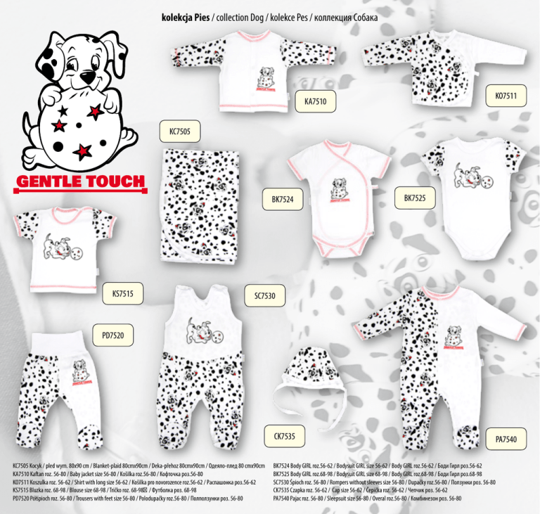 kolekcja Pies / collection Dog / kolekce Pes / коллекция Cобака KO7511 KA7510 KC7505 BK7524 KS7515 BK7525 SC7530 PD7520 CK7535 KC7505 Kocyk / pled wym. 80x90 cm / Blanket-plaid 80cmx90cm / Deka-přehoz 80cmx90cm / Oдеяло-плед 80 cmx90cm KA7510 Kaftan roz. 56-80 / Baby jacket size 56-80 / Košilka roz.56-80 / Кофточка роз.56-80 KO7511 Koszulka roz. 56-62 / Shirt with long size 56-62 / Košilka pro novorozence roz.56-62 / Pаспашонка роз.56-62 KS7515 Bluzka roz. 68-98 / Blouse size 68-98 / Tričko roz. 68-98 / Футболка роз. 68-98 PD7520 Półśpioch roz. 56-80 / Trousers with feet size 56-80 / Polodupačky roz.56-80 / Полползунки роз. 56-80 BK7524 Body GIRL roz.56-62 / Bodysuit GIRL size 56-62 / Body GIRL roz.56-62 / Боди Гирл роз.56-62 BK7525 Body GIRL roz.68-98 / Bodysuit GIRL size 68-98 / Body GIRL roz.68-98 / Боди Гирл роз.68-98 SC7530 Śpioch roz. 56-80 / Rompers without sleeves size 56-80 / Dupačky roz.56-80 / Ползунки роз. 56-80 CK7535 Czapka roz. 56-62 / Cap size 56-62 / Čepička roz. 56-62 / Чепчик роз. 56-62 PA7540 Pajac roz. 56-80 / Sleepsuit size 56-80 / Overal roz.56-80 / Комбинезон роз. 56-80 PA7540