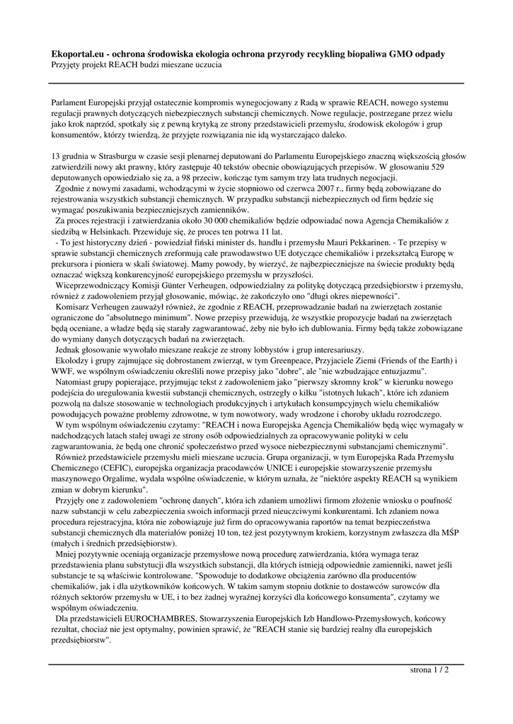 Ekoportal.eu - ochrona środowiska ekologia ochrona przyrody recykling biopaliwa GMO odpady Przyjęty projekt REACH budzi mieszane uczucia Parlament Europejski przyjął ostatecznie kompromis wynegocjowany z Radą w sprawie REACH, nowego systemu regulacji prawnych dotyczących niebezpiecznych substancji chemicznych. Nowe regulacje, postrzegane przez wielu jako krok naprzód, spotkały się z pewną krytyką ze strony przedstawicieli przemysłu, środowisk ekologów i grup konsumentów, którzy twierdzą, że przyjęte rozwiązania nie idą wystarczająco daleko. 13 grudnia w Strasburgu w czasie sesji plenarnej deputowani do Parlamentu Europejskiego znaczną większością głosów zatwierdzili nowy akt prawny, który zastępuje 40 tekstów obecnie obowiązujących przepisów. W głosowaniu 529 deputowanych opowiedziało się za, a 98 przeciw, kończąc tym samym trzy lata trudnych negocjacji. Zgodnie z nowymi zasadami, wchodzącymi w życie stopniowo od czerwca 2007 r., firmy będą zobowiązane do rejestrowania wszystkich substancji chemicznych. W przypadku substancji niebezpiecznych od firm będzie się wymagać poszukiwania bezpieczniejszych zamienników. Za proces rejestracji i zatwierdzania około 30 000 chemikaliów będzie odpowiadać nowa Agencja Chemikaliów z siedzibą w Helsinkach. Przewiduje się, że proces ten potrwa 11 lat. - To jest historyczny dzień - powiedział fiński minister ds. handlu i przemysłu Mauri Pekkarinen. - Te przepisy w sprawie substancji chemicznych zreformują całe prawodawstwo UE dotyczące chemikaliów i przekształcą Europę w prekursora i pioniera w skali światowej. Mamy powody, by wierzyć, że najbezpieczniejsze na świecie produkty będą oznaczać większą konkurencyjność europejskiego przemysłu w przyszłości. Wiceprzewodniczący Komisji Günter Verheugen, odpowiedzialny za politykę dotyczącą przedsiębiorstw i przemysłu, również z zadowoleniem przyjął głosowanie, mówiąc, że zakończyło ono "długi okres niepewności". Komisarz Verheugen zauważył również, że zgodnie z REACH, przeprowadzanie badań na zwierzętach zostanie ograniczone do "absolutnego minimum". Nowe przepisy przewidują, że wszystkie propozycje badań na zwierzętach będą oceniane, a władze będą się starały zagwarantować, żeby nie było ich dublowania. Firmy będą także zobowiązane do wymiany danych dotyczących badań na zwierzętach. Jednak głosowanie wywołało mieszane reakcje ze strony lobbystów i grup interesariuszy. Ekolodzy i grupy zajmujące się dobrostanem zwierząt, w tym Greenpeace, Przyjaciele Ziemi (Friends of the Earth) i WWF, we wspólnym oświadczeniu określili nowe przepisy jako "dobre", ale "nie wzbudzające entuzjazmu". Natomiast grupy popierające, przyjmując tekst z zadowoleniem jako "pierwszy skromny krok" w kierunku nowego podejścia do uregulowania kwestii substancji chemicznych, ostrzegły o kilku "istotnych lukach", które ich zdaniem pozwolą na dalsze stosowanie w technologiach produkcyjnych i artykułach konsumpcyjnych wielu chemikaliów powodujących poważne problemy zdrowotne, w tym nowotwory, wady wrodzone i choroby układu rozrodczego. W tym wspólnym oświadczeniu czytamy: "REACH i nowa Europejska Agencja Chemikaliów będą więc wymagały w nadchodzących latach stałej uwagi ze strony osób odpowiedzialnych za opracowywanie polityki w celu zagwarantowania, że będą one chronić społeczeństwo przed wysoce niebezpiecznymi substancjami chemicznymi". Również przedstawiciele przemysłu mieli mieszane uczucia. Grupa organizacji, w tym Europejska Rada Przemysłu Chemicznego (CEFIC), europejska organizacja pracodawców UNICE i europejskie stowarzyszenie przemysłu maszynowego Orgalime, wydała wspólne oświadczenie, w którym uznała, że "niektóre aspekty REACH są wynikiem zmian w dobrym kierunku". Przyjęły one z zadowoleniem "ochronę danych", która ich zdaniem umożliwi firmom złożenie wniosku o poufność nazw substancji w celu zabezpieczenia swoich informacji przed nieuczciwymi konkurentami. Ich zdaniem nowa procedura rejestracyjna, która nie zobowiązuje już firm do opracowywania raportów na temat bezpieczeństwa substancji chemicznych dla materiałów poniżej 10 ton, też jest pozytywnym krokiem, korzystnym zwłaszcza dla MŚP (małych i średnich przedsiębiorstw). Mniej pozytywnie oceniają organizacje przemysłowe nową procedurę zatwierdzania, która wymaga teraz przedstawienia planu substytucji dla wszystkich substancji, dla których istnieją odpowiednie zamienniki, nawet jeśli substancje te są właściwie kontrolowane. "Spowoduje to dodatkowe obciążenia zarówno dla producentów chemikaliów, jak i dla użytkowników końcowych. W takim samym stopniu dotknie to dostawców surowców dla różnych sektorów przemysłu w UE, i to bez żadnej wyraźnej korzyści dla końcowego konsumenta", czytamy we wspólnym oświadczeniu. Dla przedstawicieli EUROCHAMBRES, Stowarzyszenia Europejskich Izb Handlowo-Przemysłowych, końcowy rezultat, chociaż nie jest optymalny, powinien sprawić, że "REACH stanie się bardziej realny dla europejskich przedsiębiorstw". strona 1 / 2 Ekoportal.eu - ochrona środowiska ekologia ochrona przyrody recykling biopaliwa GMO odpady Przyjęty projekt REACH budzi mieszane uczucia - Teraz przedsiębiorstwom zależy, żeby tekst szybko i skutecznie przełożyć na możliwość działań praktycznych powiedział Arnalgo Abruzzini, sekretarz generalny EUROCHAMBRES. Zaapelował on do Komisji, nowej Agencji Chemikaliów i państw członkowskich o dołożenie wszelkich starań, żeby jego wdrożenie wymagało jak najmniej biurokracji dla przedsiębiorstw, a zwłaszcza MŚP. Więcej informacji na stronie internetowej: http://ec.europa.eu/environment/chemicals/reach/reach_intro.htm Źródło: Copyright ©European Communities, 2006 Neither the Office for Official Publications of the European Communities, nor any person acting on its behalf, is responsible for