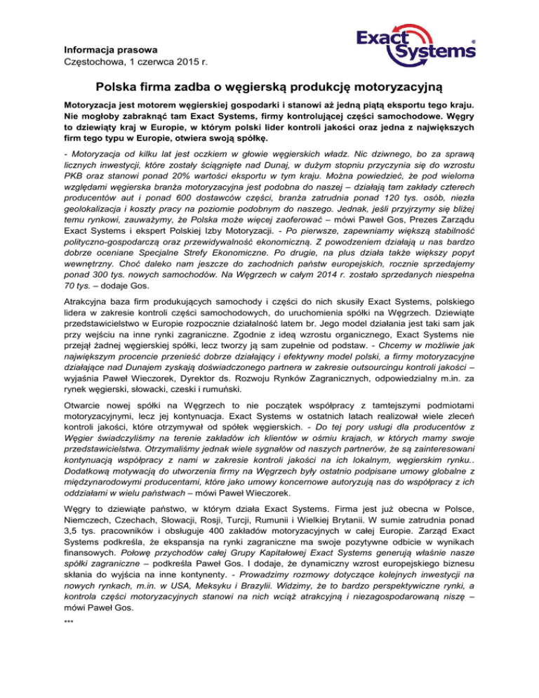 Informacja prasowa Częstochowa, 1 czerwca 2015 r. Polska firma zadba o węgierską produkcję motoryzacyjną Motoryzacja jest motorem węgierskiej gospodarki i stanowi aż jedną piątą eksportu tego kraju. Nie mogłoby zabraknąć tam Exact Systems, firmy kontrolującej części samochodowe. Węgry to dziewiąty kraj w Europie, w którym polski lider kontroli jakości oraz jedna z największych firm tego typu w Europie, otwiera swoją spółkę. - Motoryzacja od kilku lat jest oczkiem w głowie węgierskich władz. Nic dziwnego, bo za sprawą licznych inwestycji, które zostały ściągnięte nad Dunaj, w dużym stopniu przyczynia się do wzrostu PKB oraz stanowi ponad 20% wartości eksportu w tym kraju. Można powiedzieć, że pod wieloma względami węgierska branża motoryzacyjna jest podobna do naszej – działają tam zakłady czterech producentów aut i ponad 600 dostawców części, branża zatrudnia ponad 120 tys. osób, niezła geolokalizacja i koszty pracy na poziomie podobnym do naszego. Jednak, jeśli przyjrzymy się bliżej temu rynkowi, zauważymy, że Polska może więcej zaoferować – mówi Paweł Gos, Prezes Zarządu Exact Systems i ekspert Polskiej Izby Motoryzacji. - Po pierwsze, zapewniamy większą stabilność polityczno-gospodarczą oraz przewidywalność ekonomiczną. Z powodzeniem działają u nas bardzo dobrze oceniane Specjalne Strefy Ekonomiczne. Po drugie, na plus działa także większy popyt wewnętrzny. Choć daleko nam jeszcze do zachodnich państw europejskich, rocznie sprzedajemy ponad 300 tys. nowych samochodów. Na Węgrzech w całym 2014 r. zostało sprzedanych niespełna 70 tys. – dodaje Gos. Atrakcyjna baza firm produkujących samochody i części do nich skusiły Exact Systems, polskiego lidera w zakresie kontroli części samochodowych, do uruchomienia spółki na Węgrzech. Dziewiąte przedstawicielstwo w Europie rozpocznie działalność latem br. Jego model działania jest taki sam jak przy wejściu na inne rynki zagraniczne. Zgodnie z ideą wzrostu organicznego, Exact Systems nie przejął żadnej węgierskiej spółki, lecz tworzy ją sam zupełnie od podstaw. - Chcemy w możliwie jak największym procencie przenieść dobrze działający i efektywny model polski, a firmy motoryzacyjne działające nad Dunajem zyskają doświadczonego partnera w zakresie outsourcingu kontroli jakości – wyjaśnia Paweł Wieczorek, Dyrektor ds. Rozwoju Rynków Zagranicznych, odpowiedzialny m.in. za rynek węgierski, słowacki, czeski i rumuński. Otwarcie nowej spółki na Węgrzech to nie początek współpracy z tamtejszymi podmiotami motoryzacyjnymi, lecz jej kontynuacja. Exact Systems w ostatnich latach realizował wiele zleceń kontroli jakości, które otrzymywał od spółek węgierskich. - Do tej pory usługi dla producentów z Węgier świadczyliśmy na terenie zakładów ich klientów w ośmiu krajach, w których mamy swoje przedstawicielstwa. Otrzymaliśmy jednak wiele sygnałów od naszych partnerów, że są zainteresowani kontynuacją współpracy z nami w zakresie kontroli jakości na ich lokalnym, węgierskim rynku.. Dodatkową motywacją do utworzenia firmy na Węgrzech były ostatnio podpisane umowy globalne z międzynarodowymi producentami, które jako umowy koncernowe autoryzują nas do współpracy z ich oddziałami w wielu państwach – mówi Paweł Wieczorek. Węgry to dziewiąte państwo, w którym działa Exact Systems. Firma jest już obecna w Polsce, Niemczech, Czechach, Słowacji, Rosji, Turcji, Rumunii i Wielkiej Brytanii. W sumie zatrudnia ponad 3,5 tys. pracowników i obsługuje 400 zakładów motoryzacyjnych w całej Europie. Zarząd Exact Systems podkreśla, że ekspansja na rynki zagraniczne ma swoje pozytywne odbicie w wynikach finansowych. Połowę przychodów całej Grupy Kapitałowej Exact Systems generują właśnie nasze spółki zagraniczne – podkreśla Paweł Gos. I dodaje, że dynamiczny wzrost europejskiego biznesu skłania do wyjścia na inne kontynenty. - Prowadzimy rozmowy dotyczące kolejnych inwestycji na nowych rynkach, m.in. w USA, Meksyku i Brazylii. Widzimy, że to bardzo perspektywiczne rynki, a kontrola części motoryzacyjnych stanowi na nich wciąż atrakcyjną i niezagospodarowaną niszę – mówi Paweł Gos. *** Informacja prasowa Częstochowa, 1 czerwca 2015 r. Exact Systems Sp. z o.o. działa od 2004 r. i jest obecnie czołowym dostawcą rozwiązań w zakresie kontroli jakości, czyli selekcji, naprawy i sortowania części, komponentów oraz wyrobów gotowych dla przedstawicieli branży motoryzacyjnej. Głównymi odbiorcami usług firmy są dostawcy i poddostawcy dla przemysłu motoryzacyjnego oraz producenci samochodów. Klientami firmy są również zakłady zajmujące się produkcją wielkoseryjną z branży elektronicznej, AGD oraz kosmetycznej. Obecnie firma posiada swoje przedstawicielstwa w Polsce, Czechach, Niemczech, Słowacji, Turcji, Rumunii, Rosji, Wielkiej Brytanii i Węgrzech. Firma kładzie duży nacisk na jakość świadczonych usług oraz na rzetelność i stabilność we współpracy ze swoimi kontrahentami. Współpraca z Exact Systems pomaga osiągnąć najwyższe standardy jakości oraz wspiera organizację procesów produkcyjnych. Więcej informacji o firmie dostępnych jest pod adresem: www.exactsystems.pl. Kontakt dla mediów: Sylwia Maj Biuro Prasowe Exact Systems Tel.: +48 503 701 452 e-mail: [email protected]