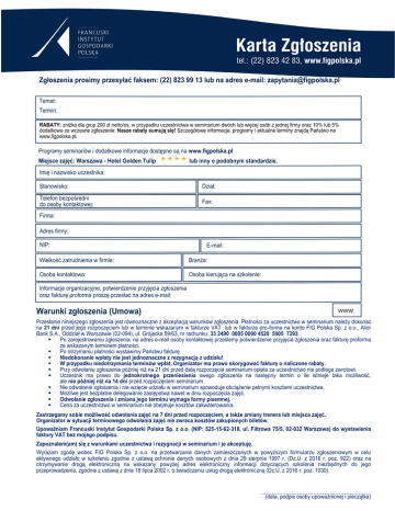 Zgłoszenia prosimy przesyłać faksem: (22) 823 99 13 lub na adres e-mail: [email protected] Temat: Termin: RABATY: zniżka dla grup 200 zł netto/os. w przypadku uczestnictwa w seminarium dwóch lub więcej osób z jednej firmy oraz 10% lub 5% dodatkowo za wczesne zgłoszenie. Nasze rabaty sumują się! Szczegółowe informacje, programy i aktualne terminy znajdą Państwo na www.figpolska.pl. Programy seminariów i dodatkowe informacje dostępne są na www.figpolska.pl Miejsce zajęć: Warszawa - Hotel Golden Tulip lub inny o podobnym standardzie. Imię i nazwisko uczestnika: Stanowisko: Dział: Telefon bezpośredni do osoby kontaktowej: Fax: Firma: Adres firmy: NIP: E-mail: Wielkość zatrudnienia w firmie: Branża: Osoba kontaktowa: Osoba kierująca na szkolenie: Informacje organizacyjne, potwierdzenie przyjęcia zgłoszenia oraz fakturę proforma proszę przesłać na adres e-mail: Warunki zgłoszenia (Umowa) WWW Przesłanie niniejszego zgłoszenia jest równoznaczne z akceptacją warunków zgłoszenia. Płatności za uczestnictwo w seminarium należy dokonać na 21 dni przed jego rozpoczęciem lub w terminie wskazanym w fakturze VAT lub w fakturze pro-forma na konto FIG Polska Sp. z o.o., Alior Bank S.A., Oddział w Warszawie (02-094), ul. Grójecka 59/63, nr rachunku: 33 2490 0005 0000 4520 5905 7293. Po zarejestrowaniu zgłoszenia, na adres e-mail osoby kontaktowej prześlemy potwierdzenie przyjęcia zgłoszenia oraz fakturę proforma ze wskazanym terminem płatności. Po otrzymaniu płatności wystawimy Państwu fakturę. Niedokonanie wpłaty nie jest jednoznaczne z rezygnacją z udziału! W przypadku niedotrzymania terminów wpłat, Organizator ma prawo skorygować fakturę o naliczone rabaty. Przy odwołaniu zgłoszenia później niż na 21 dni przed datą rozpoczęcia seminarium opłata za uczestnictwo nie podlega zwrotowi. Uczestnik ma prawo do jednokrotnego przeniesienia swego zgłoszenia na następny termin o ile istnieje taka możliwość, ale nie później niż na 14 dni przed rozpoczęciem seminarium. Nie odwołanie zgłoszenia i nie wzięcie udziału w seminarium spowoduje obciążenie pełnymi kosztami uczestnictwa. Możliwe jest bezpłatne delegowanie zastępstwa nawet w dniu rozpoczęcia zajęć. Odwołanie zgłoszenia i zmiana jego terminu wymaga formy pisemnej. Cena za uczestnictwo w seminarium nie obejmuje kosztów zakwaterowania. Zastrzegamy sobie możliwość odwołania zajęć na 7 dni przed rozpoczęciem, a także zmiany trenera lub miejsca zajęć. Organizator w sytuacji terminowego odwołania zajęć nie zwraca kosztów zakupionych biletów. Upoważniam Francuski Instytut Gospodarki Polska Sp. z o.o. (NIP: 525-15-62-318, ul. Filtrowa 75/5, 02-032 Warszawa) do wystawienia faktury VAT bez mojego podpisu. Zapoznałem(am) się z warunkami uczestnictwa i rezygnacji w seminarium i je akceptuję. Wyrażam zgodę wobec FIG Polska Sp. z o.o. na przetwarzanie danych zamieszczonych w powyższym formularzu zgłoszeniowym w celu aktywnego udziału w szkoleniu zgodnie z ustawą ochronie danych osobowych z dnia 29 sierpnia 1997 r. (Dz.U. z 2016 r. poz. 922) oraz na otrzymywanie drogą elektroniczną na wskazany powyżej adres elektroniczny informacji dotyczących szkolenia niezbędnych do jego przeprowadzenia, zgodnie z ustawą z dnia 18 lipca 2002 r. o świadczeniu usług drogą elektroniczną (Dz.U. z 2016 r. poz. 1030). ……………………………………………………. (data, podpis osoby upoważnionej i pieczątka)