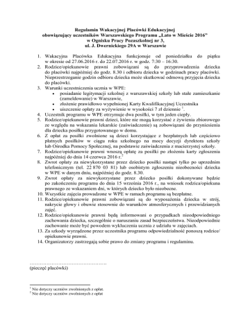 Regulamin Wakacyjnej Placówki Edukacyjnej obowiązujący uczestników Warszawskiego Programu „Lato w Mieście 2016” w Ognisku Pracy Pozaszkolnej nr 3, ul. J. Dwernickiego 29A w Warszawie 1. Wakacyjna Placówka Edukacyjna funkcjonuje od poniedziałku do piątku w okresie od 27.06.2016 r. do 22.07.2016 r. w godz. 7:30 – 16:30. 2. Rodzice/opiekunowie prawni zobowiązani są do przyprowadzenia dziecka do placówki najpóźniej do godz. 8.30 i odbioru dziecka w godzinach pracy placówki. Nieprzestrzeganie godzin odbioru dziecka może skutkować odmową przyjęcia dziecka do placówki. 3. Warunki uczestniczenia ucznia w WPE:  posiadanie legitymacji szkolnej z warszawskiej szkoły lub stałe zamieszkanie (zameldowanie) w Warszawie,  złożenie prawidłowo wypełnionej Karty Kwalifikacyjnej Uczestnika 1  uiszczenie opłaty za wyżywienie w wysokości 7 zł dziennie . 4. Uczestnik programu w WPE otrzymuje dwa posiłki, w tym jeden ciepły. 5. Rodzice/opiekunowie prawni dzieci, które nie mogą korzystać z żywienia zbiorowego ze względu na wskazania lekarskie (zaświadczenie) są zobowiązani do przyniesienia dla dziecka posiłku przygotowanego w domu. 6. Z opłat za posiłki zwolnione są dzieci korzystające z bezpłatnych lub częściowo płatnych posiłków w ciągu roku szkolnego na mocy decyzji dyrektora szkoły lub Ośrodka Pomocy Społecznej, na podstawie zaświadczenia z macierzystej szkoły. 7. Rodzice/opiekunowie prawni wnoszą opłatę za posiłki po złożeniu karty zgłoszenia najpóźniej do dnia 14 czerwca 2016 r.2 8. Zwrot opłaty za niewykorzystane przez dziecko posiłki nastąpi tylko po uprzednim telefonicznym (tel. 22 870 03 81) lub osobistym zgłoszeniu nieobecności dziecka w WPE w danym dniu, najpóźniej do godz. 8.30. 9. Zwrot opłaty za niewykorzystane przez dziecko posiłki dokonywane będzie po zakończeniu programu do dnia 15 września 2016 r., na wniosek rodzica/opiekuna prawnego ze wskazaniem dni, w których dziecko było nieobecne. 10. Wszystkie zajęcia prowadzone w WPE w ramach programu są bezpłatne. 11. Rodzice/opiekunowie prawni zobowiązani są do wyposażenia dziecka w strój, nakrycie głowy i obuwie stosownie do warunków atmosferycznych i przewidzianych zajęć. 12. Rodzice/opiekunowie prawni będą informowani o przypadkach nieodpowiedniego zachowania dziecka, szczególnie o naruszaniu zasad bezpieczeństwa. Nieodpowiednie zachowanie może być powodem wykluczenia ucznia z udziału w zajęciach. 13. Za szkody wyrządzone przez uczestnika programu odpowiedzialność ponoszą rodzice/ opiekunowie prawni. 14. Organizatorzy zastrzegają sobie prawo do zmiany programu i regulaminu. ………………………………………. (pieczęć placówki) 1 2 Nie dotyczy uczniów zwolnionych z opłat. Nie dotyczy uczniów zwolnionych z opłat