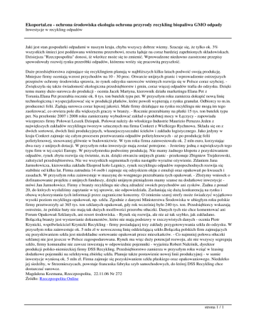 Ekoportal.eu - ochrona środowiska ekologia ochrona przyrody recykling biopaliwa GMO odpady Inwestycje w recykling odpadów Jaki jest stan gospodarki odpadami w naszym kraju, chyba wszyscy dobrze wiemy. Szacuje się, że tylko ok. 3% wszystkich śmieci jest poddawana wtórnemu przerobowi, reszta ląduje na coraz bardziej zapełnionych składowiskach. Dzisiejsza "Rzeczpospolita" donosi, iż wkrótce może się to zmienić. Wprowadzone niedawno zaostrzone przepisy spowodowały rozwój rynku przeróbki odpadów, któremu wróży się pracowitą przyszłość. Duże przedsiębiorstwa zajmujące się recyklingiem planują w najbliższych kilku latach podwoić swoją produkcję. Mniejsze firmy oceniają wzrost przychodów na 10 - 30 proc. Otwarcie unijnych granic i wprowadzenie ostrzejszych przepisów ochrony środowiska sprawia, że rynek odzysku surowców wtórnych rozwija się w Polsce coraz szybciej. Zwiększyła się także świadomość ekologiczna przedsiębiorstw i gmin, coraz więcej odpadów trafia do odzysku. Dzięki temu mamy dużo surowca do produkcji - ocenia Jacek Martyna, kierownik działu marketingu Elana Pet z Torunia.Elana Pet przerabia rocznie ok. 8 tys. ton butelek typu pet. W przyszłym roku zamierza dokupić nową linię technologiczną i wyspecjalizować się w produkcji płatków, które powoli wypierają z rynku granulat. Odbiorcy to m.in. producenci folii. Żądają surowca coraz lepszej jakości. Małe firmy działające na rynku recyklingu nie mogą im tego zaoferować, co otwiera pole dla większych graczy w branży. - Rocznie przerabiamy na płatki 15 tys. ton butelek typu pet. Na przełomie 2007 i 2008 roku zamierzamy wybudować zakład o podobnej mocy w Łęczycy - zapowiada wiceprezes firmy Polowat Leszek Dziopak. Polowat należy do włoskiego Industrie Maurizio Peruzzo.Jeden z największych zakładów recyklingu tworzyw sztucznych ma firma Conkret z Wielkiego Rychnowa. Składa się on z dwóch sortowni, dwóch linii produkcyjnych, własnejoczyszczalni ścieków i zakładu logistycznego. Jako jedyny w kraju Conkret zajmuje się całym procesem przetwarzania odpadów polietylenowych - aż po produkcję folii polietylenowej, stosowanej głównie w budownictwie. W tym roku firma zainwestowała ok. 2 mln euro, korzystając dwa razy z unijnych dotacji. W przyszłym roku inwestycje mają zostać potrojone. - Jesteśmy jedną z największych tego typu firm w tej części Europy. W przyszłymroku podwoimy produkcję. Nie mamy żadnego kłopotu z pozyskiwaniem odpadów, rynek zbytu rozwija się świetnie, m.in. dzięki otwarciu unijnych granic - przekonuje Zbigniew Trejderowski, założyciel przedsiębiorstwa. Nie we wszystkich segmentach rynku nastąpiło wyraźne ożywienie. Zdaniem Jana Jarmołowicza, kierownika zakładu Ekoprod koło Legnicy, rynek recyklingu odpadów ropopochodnych rozwija się stabilnie od kilku lat. Firma zatrudnia 14 osób i zajmuje się odzyskiem oleju z emulsji oraz opakowań po kwasach i zasadach. W przyszłym roku zainwestuje w maszynę do wstępnego przerabiania tych opakowań. - Złożymy wniosek o dofinansowanie projektu z unijnych funduszy, dzięki unijnym pieniądzom mamy szanse na dodatkowe inwestycje mówi Jan Jarmołowicz. Firmy z branży recyklingu nie chcą zdradzić swoich przychodów ani zysków. Żadna z ponad 20, do których wysłaliśmy zapytanie w tej sprawie, nie odpowiedziała. Zasłaniają się dużą konkurencją na rynku i obawą wykorzystania tych informacji przez zagraniczne koncerny. O istnieniu szarej strefy może świadczyć wyjątkowo wysoki poziom recyklingu opakowań, np. szkła. Zgodnie z danymi Ministerstwa Środowiska w ubiegłym roku polskie firmy przetworzyły aż 365 tys. ton szklanych opakowań, gdy rok wcześniej było 240 tys. ton. Przedsiębiorcy wskazują ostrożnie, że polskie huty nie mają tak dużych możliwości przerobu stłuczki. Danych tych nie chce komentować ani Forum Opakowań Szklanych, ani resort środowiska. - Rynek się rozwija, ale nie aż tak szybko, jak zakładano. Bolączką branży jest wystawianie dokumentów, które nie mają podstawy w rzeczywistych danych - ocenia Piotr Krynicki, współwłaściciel Krynicki Recykling - firmy posiadającej trzy zakłady przygotowywania szkła do odzysku. W przyszłym roku zainwestuje ok. 5 mln zł w nowoczesną linię oddzielającą szkło.Bolączką polskich firm zajmujących się pozyskiwaniem szkła jest niedokładne sortowanie opakowań przez mieszkańców. - Co najmniej połowa stłuczki szklanej nie jest jeszcze w Polsce zagospodarowana. Rynek ma więc duży potencjał rozwoju, ale nie wszyscy segregują szkło, firmy komunalne nie zawsze inwestują w odpowiednie pojemniki - wyjaśnia Robert Naleśnik, dyrektor produkcji polsko-niemieckiej firmy DSS Recykling. Przedsiębiorstwo zamierza w przyszłym roku wziąć w leasing dodatkowe pojemniki na selektywną zbiórkę szkła. Planuje także postawienie nowej linii produkcyjnej - w sumie inwestycje wyniosą ok. 5 mln zł. Firma zajmuje się pozyskiwaniem szkła płaskiego oraz opakowaniowego. Niedaleko jej siedziby, w Strzemieszycach, powstaje francuska fabryka szyb samochodowych, do której DSS Recykling chce dostarczać surowce. Magdalena Kozmana, Rzeczpospolita, 22.11.06 Nr 272 Źródło: Rzeczpospolita Online strona 1 / 1