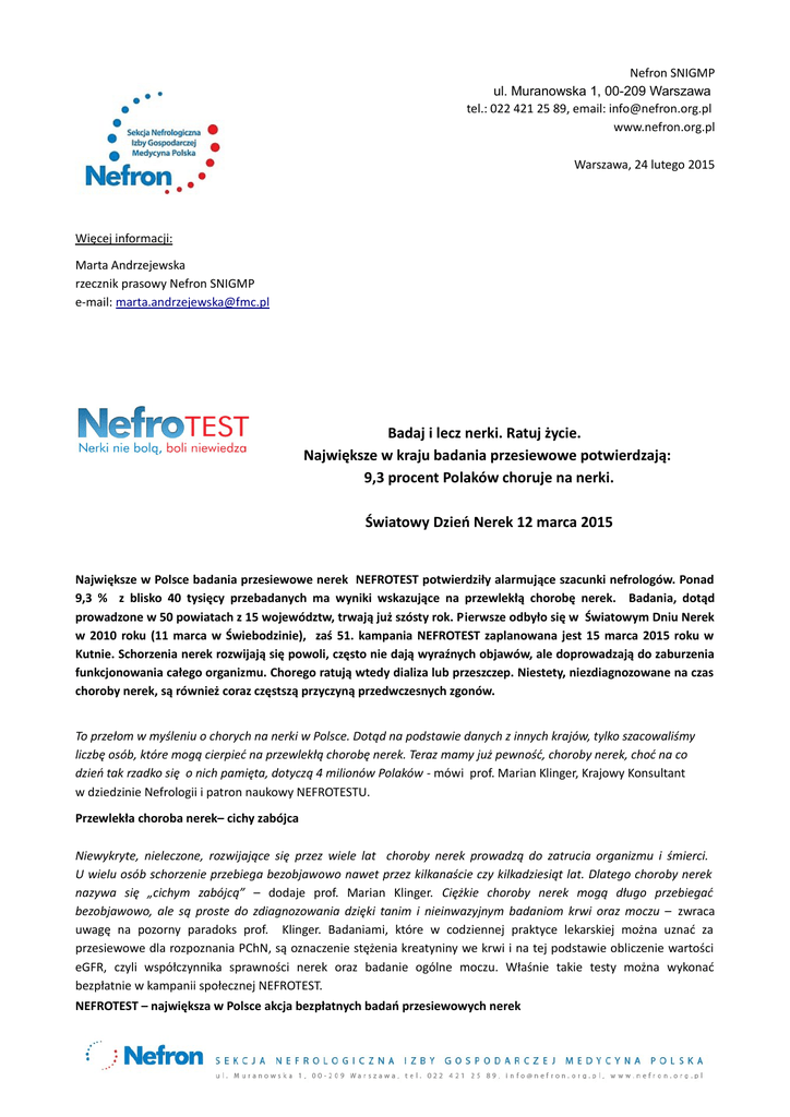 Nefron SNIGMP ul. Muranowska 1, 00-209 Warszawa tel.: 022 421 25 89, email: [email protected] www.nefron.org.pl Warszawa, 24 lutego 2015 Więcej informacji: Marta Andrzejewska rzecznik prasowy Nefron SNIGMP e-mail: [email protected] Badaj i lecz nerki. Ratuj życie. Największe w kraju badania przesiewowe potwierdzają: 9,3 procent Polaków choruje na nerki. Światowy Dzień Nerek 12 marca 2015 Największe w Polsce badania przesiewowe nerek NEFROTEST potwierdziły alarmujące szacunki nefrologów. Ponad 9,3 % z blisko 40 tysięcy przebadanych ma wyniki wskazujące na przewlekłą chorobę nerek. Badania, dotąd prowadzone w 50 powiatach z 15 województw, trwają już szósty rok. Pierwsze odbyło się w Światowym Dniu Nerek w 2010 roku (11 marca w Świebodzinie), zaś 51. kampania NEFROTEST zaplanowana jest 15 marca 2015 roku w Kutnie. Schorzenia nerek rozwijają się powoli, często nie dają wyraźnych objawów, ale doprowadzają do zaburzenia funkcjonowania całego organizmu. Chorego ratują wtedy dializa lub przeszczep. Niestety, niezdiagnozowane na czas choroby nerek, są również coraz częstszą przyczyną przedwczesnych zgonów. To przełom w myśleniu o chorych na nerki w Polsce. Dotąd na podstawie danych z innych krajów, tylko szacowaliśmy liczbę osób, które mogą cierpieć na przewlekłą chorobę nerek. Teraz mamy już pewność, choroby nerek, choć na co dzień tak rzadko się o nich pamięta, dotyczą 4 milionów Polaków - mówi prof. Marian Klinger, Krajowy Konsultant w dziedzinie Nefrologii i patron naukowy NEFROTESTU. Przewlekła choroba nerek– cichy zabójca Niewykryte, nieleczone, rozwijające się przez wiele lat choroby nerek prowadzą do zatrucia organizmu i śmierci. U wielu osób schorzenie przebiega bezobjawowo nawet przez kilkanaście czy kilkadziesiąt lat. Dlatego choroby nerek nazywa się „cichym zabójcą” – dodaje prof. Marian Klinger. Ciężkie choroby nerek mogą długo przebiegać bezobjawowo, ale są proste do zdiagnozowania dzięki tanim i nieinwazyjnym badaniom krwi oraz moczu – zwraca uwagę na pozorny paradoks prof. Klinger. Badaniami, które w codziennej praktyce lekarskiej można uznać za przesiewowe dla rozpoznania PChN, są oznaczenie stężenia kreatyniny we krwi i na tej podstawie obliczenie wartości eGFR, czyli współczynnika sprawności nerek oraz badanie ogólne moczu. Właśnie takie testy można wykonać bezpłatnie w kampanii społecznej NEFROTEST. NEFROTEST – największa w Polsce akcja bezpłatnych badań przesiewowych nerek Blisko 40 tysięcy osób z 50 miast w 15 województwach wzięło udział w największych w Polsce badaniach przesiewowych nerek NEFROTEST. Większość z 37 967 przebadanych jest zdrowa. Jednak u 3539 chorych kreatynina i eGFR były niezgodnie z normami. Może to świadczyć o chorobie nerek. Najwięcej nieprawidłowych wyników, ok. 29%, pojawiło się w Białymstoku (NEFROTEST wiosną 2012) oraz w Kozienicach – 24 % (NEFROTEST jesienią 2013 roku). Najmniej natomiast w Legnicy – 1% (NEFROTEST w marcu 2012). Średnio eGFR (wskaźnik filtracji kłębuszkowej, potocznie mówiąc wskaźnik sprawności nerek) był powyżej normy u 9, 3 % poddających się badaniom. Ponad 3,5 tysiąca przebadanych, także pan Marian z Nowego Tomyśla (Wielkopolska), dowiedziało się, że cierpi na przewlekłą chorobę nerek. Ulotkę o bezpłatnych badaniach NEFROTEST zauważyłem podczas wizyty u mojego lekarza rodzinnego – opowiada pan Marian z okolic Nowego Tomyśla (Wielkopolska). Właściwie dopiero w domu, przypomniałem sobie, że moja babcia zmarła na nerki. Nie mam samochodu, więc namówiłem sąsiadów, żeby też się zarejestrowali i pojechaliśmy razem. Nie ma co ukrywać - bałem się. To było zwykłe badanie krwi, wyniki były gotowe bardzo szybko - niestety nieprawidłowe. Lekarz rodzinny pana Mariana skierował go do nefrologa, a ten odrobinę uspokoił. Podejrzewa trzecie stadium przewlekłej choroby nerek (PChN). Nerki nie bolą - głosi popularna opinia i tym razem potwierdzam ją jako lekarz – mówi dr Dariusz Aksamit, prezes NEFRON, Sekcji Nefrologicznej Izby Gospodarczej Medycyna Polska (Krajowa Izba Gospodarcza), organizatora badań, skupiającej blisko 200 publicznych i niepublicznych oddziałów nefrologicznych, poradni i stacji dializ. Często łatwo jest zlekceważyć lub powiązać z innymi schorzeniami pierwsze objawy choroby nerek, takie jak obrzęki kończyn czy osłabienie – dodaje dr Aksamit. Dane z NEFROTESTU potwierdzają statystyki światowe, które mówią, że we współczesnym społeczeństwie jedna dziesiąta populacji (8-10%) może mieć kłopoty związane z niewydolnością nerek. Zgodnie z tymi wyliczeniami – chorują 4 miliony Polaków – większość nawet nie domyśla się, że ich nerki są chore. Wczesne wykrycie choroby nerek jest kluczem do skutecznej terapii. Zastosowanie właściwego leczenia pozwala zahamować postęp choroby u większości pacjentów. Również pan Marian, teraz pod moją opieką w poradni nefrologicznej, długo będzie leczył się zachowawczo i mam nadzieję, że nie będzie musiał trafić na dializy - mówi dr Leszek Niepolski, kierownik stacji dializ B.Braun Avitum w Nowym Tomyślu, gdzie odbywały się badania. Przede wszystkim jednak na uszkodzenia nerek narażone są osoby mające w rodzinach chorych oraz te które już na coś chorują, głównie na choroby zwane cywilizacyjnymi: cukrzycę, miażdżycę, otyłość czy nadciśnienie tętnicze – dodaje dr Niepolski. Trzeba też pamiętać, że nerki starzeją się tak jak ludzie. Ich sprawność spada wraz z wiekiem, a kryzys w funkcjonowaniu nadchodzi około 60. roku życia. Światowy Dzień Nerek 12 marca 2015 Przewlekłą chorobę nerek uznaje się obecnie za schorzenie cywilizacyjne. W Polsce może ona dotyczyć ponad 4 milionów osób. To więcej niż chorujących na cukrzycę, którą często określa się pandemią naszych czasów. Nefron jest organizatorem 
