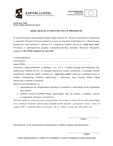 Język łączy ludzi WND- POKL.09.06.01-32-144/12 DEKLARACJA UCZESTNICTWA W PROJEKCIE W ramach Programu Operacyjnego Kapitał Ludzki Priorytet IX– Rozwój wykształcenia i kompetencji w regionach, Działanie 9.6 Upowszechnienie uczenia się dorosłych, Poddziałania 9.6. 2 Podwyższanie kompetencji osób dorosłych w zakresie ICT i znajomości języków obcych pt. „Język łączy ludzi” Nr Umowy o dofinansowanie projektu z Zachodniopomorską Jednostką Wdrażania Programów Unijnych: UDA-POKL.09.06.01-32-144/12-00 Ja niżej podpisany/a: …………………………………………………………………………… zamieszkały/a: …………………………………………………………………………………. numer PESEL …………………………………………………..……………………………… świadomy/a odpowiedzialności wynikającej z art. 233 § 1 kodeksu karnego przewidującego karę pozbawienia wolności do lat 3 za składanie fałszywych zeznań oświadczam, iż akceptuję warunki uczestnictwa i deklaruję udział w projekcie pt. „Język łączy ludzi”, który jest współfinansowany ze środków Europejskiego Funduszu Społecznego - realizowany przez Grażynę Misiak Usługi Edukacyjne z siedzibą w Gryficach. Równocześnie oświadczam, że: zapoznałem/am się z Regulaminem rekrutacji i uczestnictwa i zobowiązuje się do wypełniania jego zapisów, spełniam kryteria kwalifikowalności uprawniające mnie do udziału w projekcie, zawarte w regulaminie rekrutacji i uczestnictwa. Wyrażam zgodę na wykorzystywanie i przetwarzanie moich danych osobowych do celów monitoringu oraz ewaluacji Programu Operacyjnego Kapitał Ludzki (zgodnie z przepisami ustawy z dnia 29 sierpnia 1997 r. oochronie danych osobowych - Dz. U. z 2002 r. Nr 101, poz. 926 z późn. zm.). ______________________________ Podpis Oświadczam, iż nie znam języka niemieckiego w żadnym stopniu zaawansowania. _______________________________ Podpis Projekt współfinansowany ze środków Unii Europejskiej w ramach Europejskiego Funduszu Społecznego KARTA REKRUTACYJNA Dane uczestnika Imię Nazwisko Płeć Wiek PESEL Wykształcenie* Podstawowe Gimnazjalne Ponadgimnazjalne Pomaturalne Wyższe Ulica Nr domu Nr lokalu Dane kontaktowe Miejscowość Obszar* Obszar miejski Obszar wiejski Kod pocztowy Województwo Powiat Telefon stacjonarny Adres poczty elektronicznej (email) Status na rynku pracy w chwili przystąpienia do projektu* Załąc zniki Dane dodatkowe Telefon komórkowy W przypadku osób zatrudnionych Zaświadczenie * Bezrobotny Zatrudniony Rolnik Samo zatrudniony Zatrudniony w administracji publicznej Zatrudniony w dużym przedsiębiorstwie Zatrudniony w średnim przedsiębiorstwie Zatrudniony w małym przedsiębiorstwie Zatrudniony w mikroprzedsiębiorstwie Zatrudniony w organizacji pozarządowej O zatrudnieniu O pozostawaniu osobą bezrobotną *Podkreślić właściwe _______________________________ podpis Projekt współfinansowany ze środków Unii Europejskiej w ramach Europejskiego Funduszu Społecznego OŚWIADCZENIE UCZESTNIKA PROJEKTU W związku z przystąpieniem do Projektu „Język łączy ludzi” realizowanego w ramach Programu Operacyjnego Kapitał Ludzki oświadczam, iż przyjmuję do wiadomości, że: 1) administratorem moich danych osobowych jest Minister Rozwoju Regionalnego pełniący funkcję Instytucji Zarządzającej dla Programu Operacyjnego Kapitał Ludzki, mający siedzibę przy ul. Wspólna 2/4, 00-926 Warszawa; 2) podstawę prawną przetwarzania moich danych osobowych stanowi art. 23 ust. 1 pkt 2 lub art. 27 ust.2 pkt 2 ustawy z dnia 29 sierpnia 1997 r. o ochronie danych osobowych (Dz. U. z 2002 r. Nr 101 poz. 926 z późn. zm.) 3) moje dane osobowe będą przetwarzane wyłącznie w celu udzielenia wsparcia, realizacji projektu Język łączy ludzi, ewaluacji, kontroli, monitoringu i sprawozdawczości w ramach Programu Operacyjnego Kapitał Ludzki; 4) moje dane osobowe zostały powierzone do przetwarzania Instytucji Pośredniczącej Wojewódzkiemu Urzędowi Pracy w Szczecinie, ul. A. Mickiewicza 41, 70-383 Szczecin, Beneficjentowi realizującemu projekt – Grażyna Misiak Usługi Edukacyjne ul. Starogrodzka 70, 72-300 Gryfice. Moje dane osobowe mogą zostać udostępnione firmom badawczym realizującym na zlecenie Instytucji Zarządzającej PO KL, Instytucji Pośredniczącej lub Beneficjenta badania ewaluacyjne w ramach PO KL oraz specjalistycznym firmom realizującym na zlecenie Instytucji Zarządzającej PO KL lub Instytucji Pośredniczącej kontrole w ramach PO KL. 5) podanie danych jest dobrowolne, aczkolwiek odmowa ich podania jest równoznaczna z brakiem możliwości udzielenia wsparcia w ramach Projektu; 6) mam prawo dostępu do treści swoich danych i ich poprawiania. _______________________________ Miejscowość i data _____________________________________ Czytelny podpis uczestnika projektu Projekt współfinansowany ze środków Unii Europejskiej w ramach Europejskiego Funduszu Społecznego