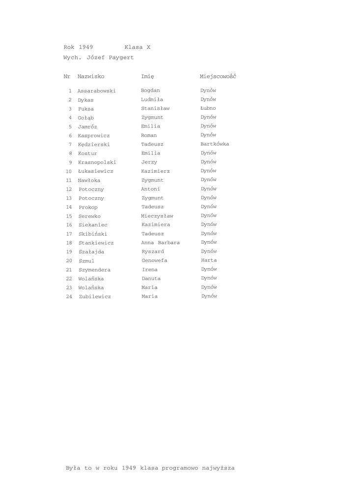 Rok 1949 Klasa X Wych. Józef Paygert Nr Nazwisko Imię Miejscowość 1 Assarabowski Bogdan Dynów 2 Dykas Ludmiła Dynów 3 Fuksa Stanisław Łubno 4 Gołąb Zygmunt Dynów 5 Jamróz Emilia Dynów 6 Kasprowicz Roman Dynów 7 Kędzierski Tadeusz Bartkówka 8 Kostur Emilia Dynów 9 Krasnopolski Jerzy Dynów Łukasiewicz Kazimierz Dynów 11 Nawłoka Zygmunt Dynów 12 Potoczny Antoni Dynów 13 Potoczny Zygmunt Dynów 14 Prokop Tadeusz Dynów 15 Serewko Mieczysław Dynów 16 Siekaniec Kazimiera Dynów 17 Skibiński Tadeusz Dynów 18 Stankiewicz Anna Barbara Dynów 19 Szałajda Ryszard Dynów 20 Szmul Genowefa Harta 21 Szymendera Irena Dynów 22 Wolańska Danuta Dynów 23 Wolańska Maria Dynów 24 Zubilewicz Maria Dynów 10 Była to w roku 1949 klasa programowo najwyższa