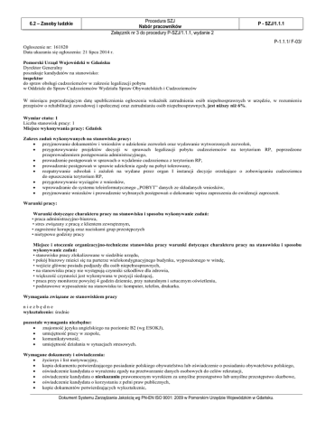 6.2 – Zasoby ludzkie Procedura SZJ Nabór pracowników Załącznik nr 3 do procedury P-SZJ/1.1.1, wydanie 2 P - SZJ/1.1.1 P-1.1.1/ F-03/ Ogłoszenie nr: 161820 Data ukazania się ogłoszenia: 21 lipca 2014 r. Pomorski Urząd Wojewódzki w Gdańsku Dyrektor Generalny poszukuje kandydatów na stanowisko: inspektor do spraw obsługi cudzoziemców w zakresie legalizacji pobytu w Oddziale do Spraw Cudzoziemców Wydziału Spraw Obywatelskich i Cudzoziemców W miesiącu poprzedzającym datę upublicznienia ogłoszenia wskaźnik zatrudnienia osób niepełnosprawnych w urzędzie, w rozumieniu przepisów o rehabilitacji zawodowej i społecznej oraz zatrudnianiu osób niepełnosprawnych, jest niższy niż 6%. Wymiar etatu: 1 Liczba stanowisk pracy: 1 Miejsce wykonywania pracy: Gdańsk Zakres zadań wykonywanych na stanowisku pracy: przyjmowanie dokumentów i wniosków o udzielenie zezwoleń oraz wydawanie wytworzonych zezwoleń, przygotowywanie projektów decyzji w sprawach legalizacji pobytu cudzoziemców na terytorium RP, poprzedzone przeprowadzeniem postępowania administracyjnego, prowadzenie postępowań w sprawach o wydalenie cudzoziemca z terytorium RP, prowadzenie postępowań w sprawie udzielenia zgody na pobyt tolerowany, rozpatrywanie odwołań i zażaleń na wydane przez organ I instancji decyzje orzekające o zobowiązaniu cudzoziemca do opuszczenia terytorium RP, przygotowywanie wyciągów z wniosków, wprowadzanie do systemu teleinformatycznego „POBYT” danych ze składanych wniosków, przyjmowanie wniosków i prowadzenie wybranych postępowań o dokonanie wpisu zaproszenia do ewidencji zaproszeń. Warunki pracy: Warunki dotyczące charakteru pracy na stanowisku i sposobu wykonywanie zadań: • praca administracyjno-biurowa, • stres związany z pracą z klientem zewnętrznym, • zagrożenie korupcją oraz naciskami grup przestępczych • nietypowe godziny pracy Miejsce i otoczenie organizacyjno-techniczne stanowiska pracy warunki dotyczące charakteru pracy na stanowisku i sposobu wykonywanie zadań: • stanowisko pracy zlokalizowane w siedzibie urzędu, • pokój biurowy mieści się na parterze wielokondygnacyjnego budynku, wyposażonego w windę, • wejście główne posiada podjazdy dla osób niepełnosprawnych, • na stanowisku pracy nie występują czynniki szkodliwe dla zdrowia, • większość czynności jest wykonywana w pozycji siedzącej, • praca przy monitorze powyżej 4 godzin dziennie, przy naturalnym i sztucznym oświetleniu, • podstawowe wyposażenie na stanowisku to: komputer, telefon, drukarka. Wymagania związane ze stanowiskiem pracy niezbędne wykształcenie: średnie pozostałe wymagania niezbędne: znajomość języka angielskiego na poziomie B2 (wg ESOKJ), umiejętność pracy w zespole, komunikatywność, umiejętność działania w sytuacjach stresowych. Wymagane dokumenty i oświadczenia: życiorys i list motywacyjny, kopia dokumentu potwierdzającego posiadanie polskiego obywatelstwa lub oświadczenie o posiadaniu obywatelstwa polskiego, oświadczenie kandydata o wyrażeniu zgody na przetwarzanie danych osobowych do celów rekrutacji, oświadczenie kandydata o nieskazaniu prawomocnym wyrokiem za umyślne przestępstwo lub umyślne przestępstwo skarbowe, oświadczenie kandydata o korzystaniu z pełni praw publicznych, kopie dokumentów potwierdzających wykształcenie, Dokument Systemu Zarządzania Jakością wg PN-EN ISO 9001: 2009 w Pomorskim Urzędzie Wojewódzkim w Gdańsku. 6.2 – Zasoby ludzkie Procedura SZJ Nabór pracowników Załącznik nr 3 do procedury P-SZJ/1.1.1, wydanie 2 P - SZJ/1.1.1 P-1.1.1/ F-03/ oświadczenie o znajomości języka angielskiego na poziomie B2 (wg ESOKJ), kopia dokumentu potwierdzającego niepełnosprawność - w przypadku, gdy kandydat zamierza skorzystać z uprawnienia, o którym mowa w art. 29a ust. 2 ustawy z dnia 21 listopada 2008 r. o służbie cywilnej (Dz. U. Nr 227, poz. 1505 ze zm.). Termin składania dokumentów: 31-07-2014 r. Miejsce składania dokumentów: Pomorski Urząd Wojewódzki w Gdańsku Punkt przyjęć korespondencji w holu budynku Urzędu przy wejściu „B” ul. Okopowa 21/27 80-810 Gdańsk Na kopercie i liście motywacyjnym należy umieścić dopisek: 38/14 Inne informacje: Proponowane wynagrodzenie zasadnicze brutto: ok. 2200 zł/mies. (+ wysługa lat). W ofercie należy podać swoje dane kontaktowe: adres do korespondencji, adres e-mail, numer telefonu. Każde oświadczenie wymagane w ogłoszeniu powinno być zgodne z treścią ujętą w ogłoszeniu. Treść oświadczeń załączonych do dokumentów aplikacyjnych należy opatrzyć odręcznym podpisem wraz z datą. Oferty otrzymane po terminie (decyduje data stempla pocztowego) oraz aplikacje niekompletne nie będą rozpatrywane. Oferty odrzucone i nieodebrane zostaną komisyjnie zniszczone. Zachęcamy do zapoznania się z informacjami dotyczącymi zasad organizacji naboru w Pomorskim Urzędzie Wojewódzkim w Gdańsku oraz skorzystania z wzorów oświadczeń, dostępnych na stronie BIP PUW w zakładce Praca. W ciągu 3 tygodni od terminu składania ofert na stronie BIP PUW (http://www.pomorskie.eu/pl/bip/puw) w zakładce Praca zostanie opublikowana informacja zawierająca listę osób zakwalifikowanych do kolejnego etapu procesu naboru wraz ze szczegółami dotyczącymi miejsca i daty przeprowadzenia tego etapu. Techniki i metody naboru: • weryfikacja formalna nadesłanych ofert, • test wiedzy oraz test z języka obcego (opcjonalnie - zgodnie z obowiązującym regulaminem naboru zewnętrznego), • test praktyczny (opcjonalnie), • rozmowa kwalifikacyjna. Do składania dokumentów zachęcamy również osoby niepełnosprawne, które spełniają wymagania określone w niniejszym ogłoszeniu (z uwzględnieniem informacji dotyczących miejsca i otoczenia organizacyjno-technicznego stanowiska pracy). Dodatkowe informacje można uzyskać pod numerem tel.: (58) 30 77 141. DYREKTOR GENERALNY /-/ Ewelina Dajnowska-Burkiewicz Dokume