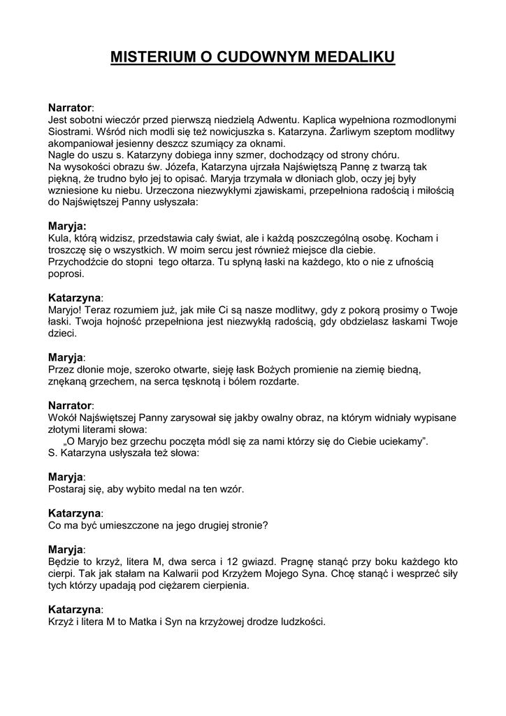 MISTERIUM O CUDOWNYM MEDALIKU Narrator: Jest sobotni wieczór przed pierwszą niedzielą Adwentu. Kaplica wypełniona rozmodlonymi Siostrami. Wśród nich modli się też nowicjuszka s. Katarzyna. Żarliwym szeptom modlitwy akompaniował jesienny deszcz szumiący za oknami. Nagle do uszu s. Katarzyny dobiega inny szmer, dochodzący od strony chóru. Na wysokości obrazu św. Józefa, Katarzyna ujrzała Najświętszą Pannę z twarzą tak piękną, że trudno było jej to opisać. Maryja trzymała w dłoniach glob, oczy jej były wzniesione ku niebu. Urzeczona niezwykłymi zjawiskami, przepełniona radością i miłością do Najświętszej Panny usłyszała: Maryja: Kula, którą widzisz, przedstawia cały świat, ale i każdą poszczególną osobę. Kocham i troszczę się o wszystkich. W moim sercu jest również miejsce dla ciebie. Przychodźcie do stopni tego ołtarza. Tu spłyną łaski na każdego, kto o nie z ufnością poprosi. Katarzyna: Maryjo! Teraz rozumiem już, jak miłe Ci są nasze modlitwy, gdy z pokorą prosimy o Twoje łaski. Twoja hojność przepełniona jest niezwykłą radością, gdy obdzielasz łaskami Twoje dzieci. Maryja: Przez dłonie moje, szeroko otwarte, sieję łask Bożych promienie na ziemię biedną, znękaną grzechem, na serca tęsknotą i bólem rozdarte. Narrator: Wokół Najświętszej Panny zarysował się jakby owalny obraz, na którym widniały wypisane złotymi literami słowa: „O Maryjo bez grzechu poczęta módl się za nami którzy się do Ciebie uciekamy”. S. Katarzyna usłyszała też słowa: Maryja: Postaraj się, aby wybito medal na ten wzór. Katarzyna: Co ma być umieszczone na jego drugiej stronie? Maryja: Będzie to krzyż, litera M, dwa serca i 12 gwiazd. Pragnę stanąć przy boku każdego kto cierpi. Tak jak stałam na Kalwarii pod Krzyżem Mojego Syna. Chcę stanąć i wesprzeć siły tych którzy upadają pod ciężarem cierpienia. Katarzyna: Krzyż i litera M to Matka i Syn na krzyżowej drodze ludzkości. Maryja: Dwa serca – to serce Matki i serce Syna. W nich jedno tętni życie. Te dwa serca są zawsze gotowe wesprzeć każdą ludzką troskę, każdy ból... wesprzeć i pomóc. Katarzyna: Te dwa serca to jak dwie lampy wśród nocy, jak dwie wyciągnięte dłonie pomocne w potrzebie. A co oznaczają gwiazdy? Maryja: Korona z 12-stu gwiazd to jak dwunastu Apostołów przy Moim Synu. Ten medalik to wielki dar Boga dla was. Opowie wam o zbawieniu, o miłości Boga do człowieka i o Mnie Matce, z dłońmi pełnymi łask. Śpiew: O Maryjo, bez grzechu poczęta… Katarzyna: Odeszła Matka, lecz w dłoniach moich maleńki medalik błyszczy, jak Jej oczy pełne miłości pochylone nad nędzą człowieka. Jej wizerunek, krzyż, dwa serca i słowa na nim wypisane przynoszą dziwny pokój. Bierzcie i noście ten medalik , a łaski spłyną na każdego kto z ufnością nosić go będzie. Narrator: Już ponad 170 lat medalik jest znakiem macierzyńskiej opieki Maryi. Wiara ludzi w krótkim czasie nazywa go CUDOWNYM MEDALIKIEM. Całe bogactwo treści które jest w nim zawarte przypomina dzisiejszemu człowiekowi, który zagubił wartości duchowe w pogoni za światem materialnym: - by zaczął czuwać, - by nie ulegał podszeptom zła, - by umiał sięgnąć w głąb i odkrył skarb ukryty na dnie swego serca.