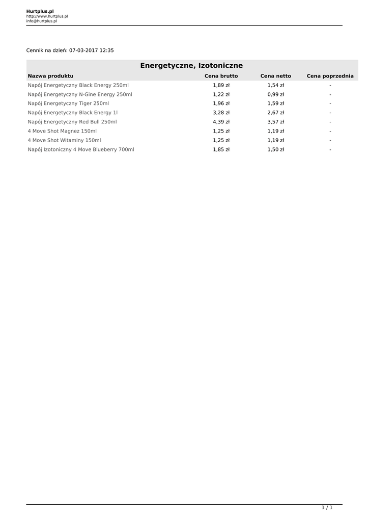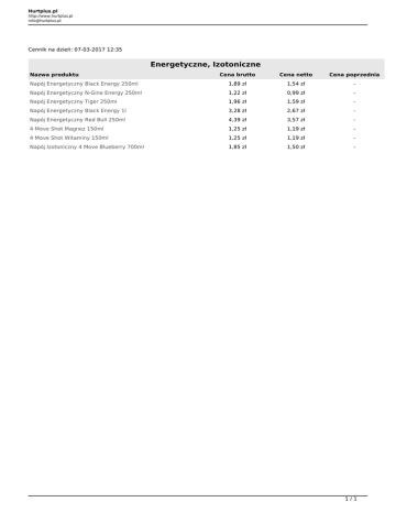Hurtplus.pl http://www.hurtplus.pl [email protected] Cennik na dzień: 07-03-2017 12:35 Energetyczne, Izotoniczne Nazwa produktu Cena brutto Cena netto Cena poprzednia Napój Energetyczny Black Energy 250ml 1,89 zł 1,54 zł - Napój Energetyczny N-Gine Energy 250ml 1,22 zł 0,99 zł - Napój Energetyczny Tiger 250ml 1,96 zł 1,59 zł - Napój Energetyczny Black Energy 1l 3,28 zł 2,67 zł - Napój Energetyczny Red Bull 250ml 4,39 zł 3,57 zł - 4 Move Shot Magnez 150ml 1,25 zł 1,19 zł - 4 Move Shot Witaminy 150ml 1,25 zł 1,19 zł - Napój Izotoniczny 4 Move Blueberry 700ml 1,85 zł 1,50 zł - 1/1 Powered by TCPDF (www.tcpdf.org)