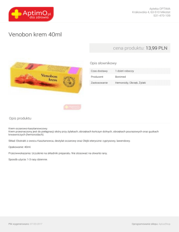 Apteka OPTIMA Krakowska 4, 63-510 Mikstat 531-470-109 Venobon krem 40ml cena produktu: 13,99 PLN Opis słownikowy Czas dostawy 1 dzień roboczy Producent Bonimed Zastosowanie Hemoroidy, Obrzęk, Żylaki Opis produktu Krem oczarowo-kasztanowcowy. Krem przeznaczony jest do pielęgnacji skóry przy żylakach, obrzękach kończyn dolnych, obrzękach pourazowych oraz guzkach krwawniczych (hemoroidach). Skład: Ekstrakt z owocu Kasztanowca, destylat oczarowy oraz Olejki eteryczne: cyprysowy, lawendowy. Opakowanie: 40ml. Przeciwwskazania: Uczulenie na składniki preparatu. Nie stosować na otwarte rany. Sposób użycia: 1-3 razy dziennie. Plik wygenerowano: 07-03-2017 Powered by TCPDF (www.tcpdf.org) Oprogramowanie sklepu: AptusShop