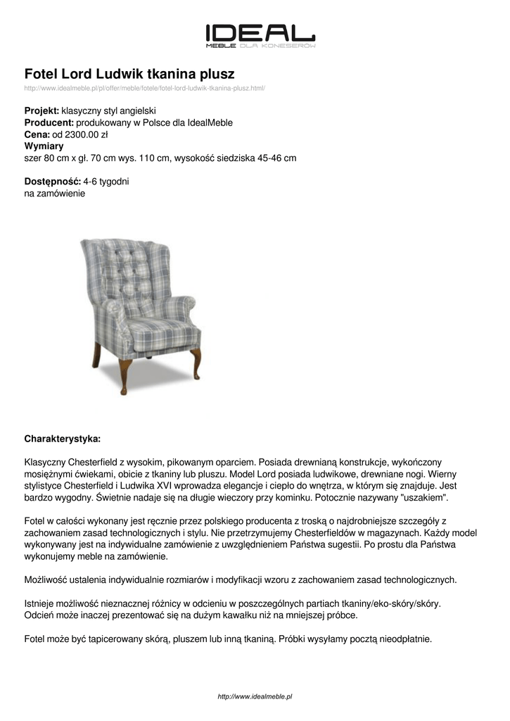 Fotel Lord Ludwik tkanina plusz http://www.idealmeble.pl/pl/offer/meble/fotele/fotel-lord-ludwik-tkanina-plusz.html/ Projekt: klasyczny styl angielski Producent: produkowany w Polsce dla IdealMeble Cena: od 2300.00 zł Wymiary szer 80 cm x gł. 70 cm wys. 110 cm, wysokość siedziska 45-46 cm Dostępność: 4-6 tygodni na zamówienie Charakterystyka: Klasyczny Chesterfield z wysokim, pikowanym oparciem. Posiada drewnianą konstrukcje, wykończony mosiężnymi ćwiekami, obicie z tkaniny lub pluszu. Model Lord posiada ludwikowe, drewniane nogi. Wierny stylistyce Chesterfield i Ludwika XVI wprowadza elegancje i ciepło do wnętrza, w którym się znajduje. Jest bardzo wygodny. Świetnie nadaje się na długie wieczory przy kominku. Potocznie nazywany "uszakiem". Fotel w całości wykonany jest ręcznie przez polskiego producenta z troską o najdrobniejsze szczegóły z zachowaniem zasad technologicznych i stylu. Nie przetrzymujemy Chesterfieldów w magazynach. Każdy model wykonywany jest na indywidualne zamówienie z uwzględnieniem Państwa sugestii. Po prostu dla Państwa wykonujemy meble na zamówienie. Możliwość ustalenia indywidualnie rozmiarów i modyfikacji wzoru z zachowaniem zasad technologicznych. Istnieje możliwość nieznacznej różnicy w odcieniu w poszczególnych partiach tkaniny/eko-skóry/skóry. Odcień może inaczej prezentować się na dużym kawałku niż na mniejszej próbce. Fotel może być tapicerowany skórą, pluszem lub inną tkaniną. Próbki wysyłamy pocztą nieodpłatnie. http://www.idealmeble.pl Podana cena dotyczy tapicerki z grupy I Cena dla tapicerki z grupy II jest dodatkowo płatna +30% Cena dla tapicerki z grupy III jest dodatkowo płatna +45% http://www.idealmeble.pl Dostępne wersje produktu: nazwa produktu Fotel Lord warianty Tapicerka plusz, tkanina cena 2300.00zł http://www.idealmeble.pl dostępne 4-6 tygodni Zdjęcia produktu: http://www.idealmeble.pl Powered by TCPDF (www.tcpdf.org)