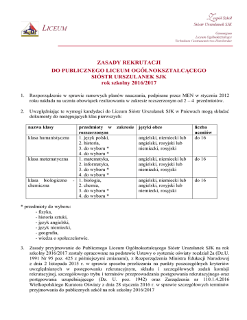 Zasady rekrutacji 2016/17 - Zespół Szkół Sióstr Urszulanek SJK w